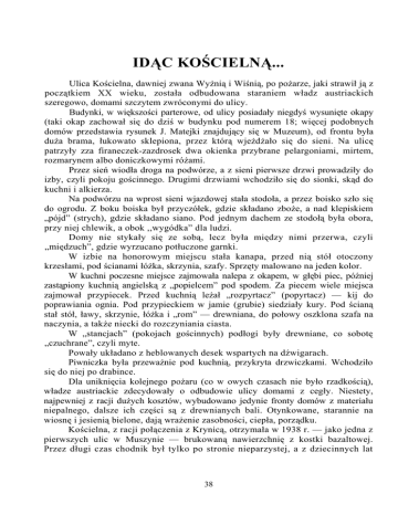 IDĄC KOŚCIELNĄ... Ulica Kościelna, dawniej zwana Wyżnią i Wiśnią, po pożarze, jaki strawił ją z początkiem XX wieku, została odbudowana staraniem władz austriackich szeregowo, domami szczytem zwróconymi do ulicy. Budynki, w większości parterowe, od ulicy posiadały niegdyś wysunięte okapy (taki okap zachował się do dziś w budynku pod numerem 18; więcej podobnych domów przedstawia rysunek J. Matejki znajdujący się w Muzeum), od frontu była duża brama, łukowato sklepiona, przez którą wjeżdżało się do sieni. Na ulicę patrzyły zza firaneczek-zazdrosek dwa okienka przybrane pelargoniami, mirtem, rozmarynem albo doniczkowymi różami. Przez sień wiodła droga na podwórze, a z sieni pierwsze drzwi prowadziły do izby, czyli pokoju gościnnego. Drugimi drzwiami wchodziło się do sionki, skąd do kuchni i alkierza. Na podwórzu na wprost sieni wjazdowej stała stodoła, a przez boisko szło się do ogrodu. Z boku boiska był przyczółek, gdzie składano zboże, a nad klepiskiem „pójd” (strych), gdzie składano siano. Pod jednym dachem ze stodołą była obora, przy niej chlewik, a obok ,,wygódka” dla ludzi. Domy nie stykały się ze sobą, lecz była między nimi przerwa, czyli „międzuch”, gdzie wyrzucano potłuczone garnki. W izbie na honorowym miejscu stała kanapa, przed nią stół otoczony krzesłami, pod ścianami łóżka, skrzynia, szafy. Sprzęty malowano na jeden kolor. W kuchni poczesne miejsce zajmowała nalepa z okapem, w głębi piec, później zastąpiony kuchnią angielską z „popielcem” pod spodem. Za piecem wiele miejsca zajmował przypiecek. Przed kuchnią leżał „rozpyrtacz” (popyrtacz) — kij do poprawiania ognia. Pod przypieckiem w jamie (grubie) siedziały kury. Pod ścianą stał stół, ławy, skrzynie, łóżka i „rom” — drewniana, do połowy oszklona szafa na naczynia, a także niecki do rozczyniania ciasta. W „stancjach” (pokojach gościnnych) podłogi były drewniane, co sobotę „czuchrane”, czyli myte. Powały układano z heblowanych desek wspartych na dźwigarach. Piwniczka była przeważnie pod kuchnią, przykryta drzwiczkami. Wchodziło się do niej po drabince. Dla uniknięcia kolejnego pożaru (co w owych czasach nie było rzadkością), władze austriackie zdecydowały o odbudowie ulicy domami z cegły. Niestety, najpewniej z racji dużych kosztów, wybudowano jedynie fronty domów z materiału niepalnego, dalsze ich części są z drewnianych bali. Otynkowane, starannie na wiosnę i jesienią bielone, dają wrażenie zasobności, ciepła, porządku. Kościelna, z racji połączenia z Krynicą, otrzymała w 1938 r. — jako jedna z pierwszych ulic w Muszynie — brukowaną nawierzchnię z kostki bazaltowej. Przez długi czas chodnik był tylko po stronie nieparzystej, a z dziecinnych lat 38 doskonale pamiętam wielkie kępy pachnących fiołków u stóp świerków, które rosły obok naszej Ochronki. Paradoksalne, ale wydaje się, że najpierw dzięki decyzji władz o sposobie odbudowy spalonej ulicy, a także, nie ukrywajmy, na skutek trudnej sytuacji finansowej jej mieszkańców (co uniemożliwiło adaptacje i przebudowy), do naszych czasów dotrwało na ulicy Kościelnej kilkanaście zabytkowych domów. Są one oznaczone numerami: 7, 41, 46, 49, 51, 54, 55, 57, 59, 61, 75. Daleko z pewnością naszej Kościelnej do bogatych uliczek sławnych miast, ale jej urok sprawia, że jest śliczna o każdej porze roku. Magda Małecka-Myślik Ulica Kościelna. Drzeworyt Aleksandra Rojny (ze zbiorów Muzeum Regionalnego w Muszynie) 39