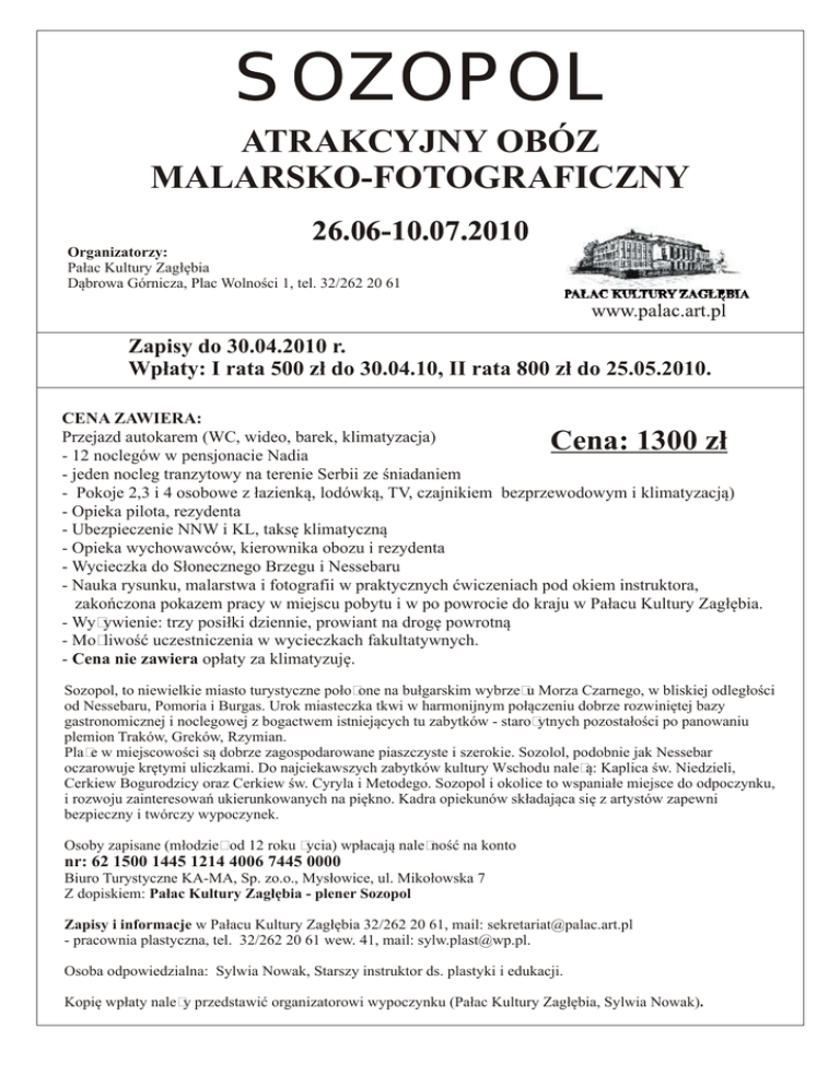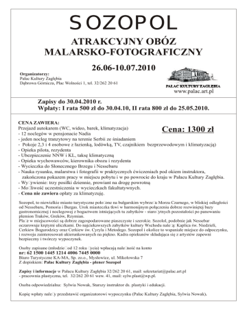 SOZOPOL ATRAKCYJNY OBÓZ MALARSKO-FOTOGRAFICZNY 26.06-10.07.2010 Organizatorzy: Pałac Kultury Zagłębia Dąbrowa Górnicza, Plac Wolności 1, tel. 32/262 20 61 Zapisy do 30.04.2010 r. Wpłaty: I rata 500 zł do 30.04.10, II rata 800 zł do 25.05.2010. CENA ZAWIERA: Przejazd autokarem (WC, wideo, barek, klimatyzacja) - 12 noclegów w pensjonacie Nadia - jeden nocleg tranzytowy na terenie Serbii ze śniadaniem - Pokoje 2,3 i 4 osobowe z łazienką, lodówką, TV, czajnikiem bezprzewodowym i klimatyzacją) - Opieka pilota, rezydenta - Ubezpieczenie NNW i KL, taksę klimatyczną - Opieka wychowawców, kierownika obozu i rezydenta - Wycieczka do Słonecznego Brzegu i Nessebaru - Nauka rysunku, malarstwa i fotografii w praktycznych ćwiczeniach pod okiem instruktora, zakończona pokazem pracy w miejscu pobytu i w po powrocie do kraju w Pałacu Kultury Zagłębia. - Wyżywienie: trzy posiłki dziennie, prowiant na drogę powrotną - Możliwość uczestniczenia w wycieczkach fakultatywnych. - Cena nie zawiera opłaty za klimatyzuję. Cena: 1300 zł Sozopol, to niewielkie miasto turystyczne położone na bułgarskim wybrzeżu Morza Czarnego, w bliskiej odległości od Nessebaru, Pomoria i Burgas. Urok miasteczka tkwi w harmonijnym połączeniu dobrze rozwiniętej bazy gastronomicznej i noclegowej z bogactwem istniejących tu zabytków - starożytnych pozostałości po panowaniu plemion Traków, Greków, Rzymian. Plaże w miejscowości są dobrze zagospodarowane piaszczyste i szerokie. Sozolol, podobnie jak Nessebar oczarowuje krętymi uliczkami. Do najciekawszych zabytków kultury Wschodu należą: Kaplica św. Niedzieli, Cerkiew Bogurodzicy oraz Cerkiew św. Cyryla i Metodego. Sozopol i okolice to wspaniałe miejsce do odpoczynku, i rozwoju zainteresowań ukierunkowanych na piękno. Kadra opiekunów składająca się z artystów zapewni bezpieczny i twórczy wypoczynek. Osoby zapisane (młodzież od 12 roku życia) wpłacają należność na konto nr: 62 1500 1445 1214 4006 7445 0000 Biuro Turystyczne KA-MA, Sp. zo.o., Mysłowice, ul. Mikołowska 7 Z dopiskiem: Pałac Kultury Zagłębia - plener Sozopol Zapisy i informacje w Pałacu Kultury Zagłębia 32/262 20 61, mail: [email protected] - pracownia plastyczna, tel. 32/262 20 61 wew. 41, mail: [email protected]. Osoba odpowiedzialna: Sylwia Nowak, Starszy instruktor ds. plastyki i edukacji. Kopię wpłaty należy przedstawić organizatorowi wypoczynku (Pałac Kultury Zagłębia, Sylwia Nowak).
