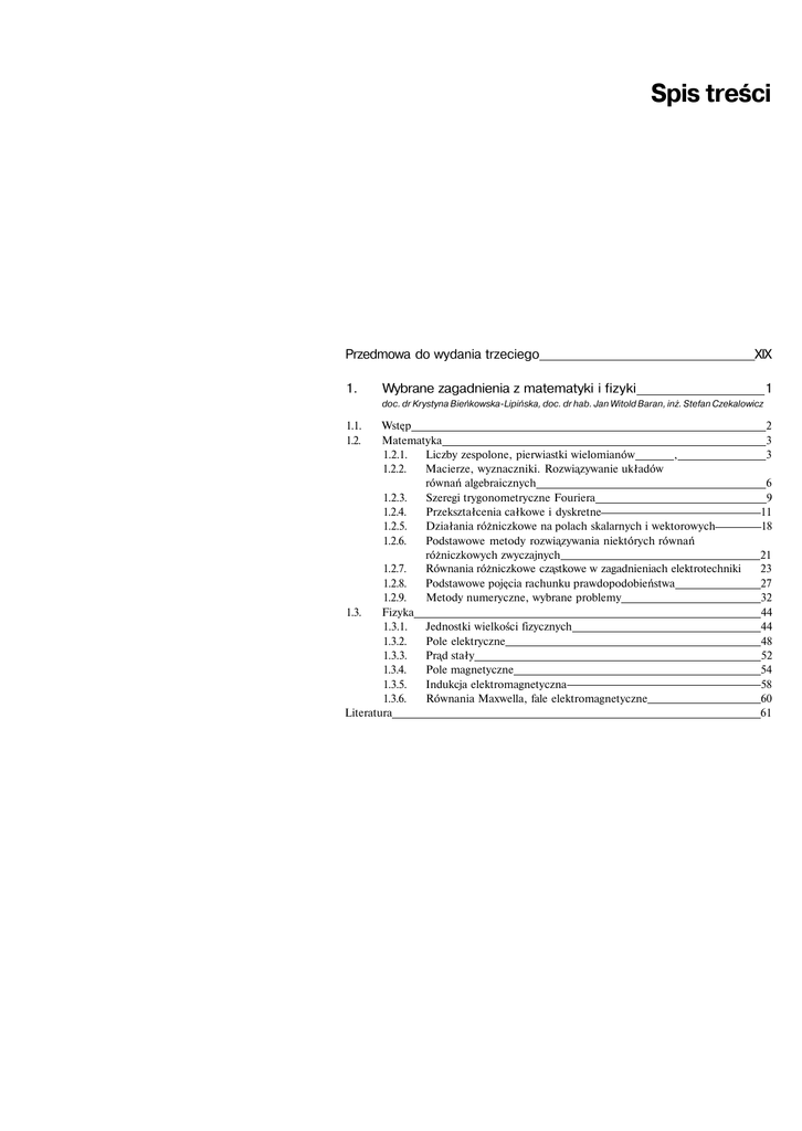 Spis treści Przedmowa do wydania trzeciego 1. XIX Wybrane zagadnienia z matematyki i fizyki 1 doc. dr Krystyna Bieńkowska-Lipińska, doc. dr hab. Jan Witold Baran, inż. Stefan Czekalowicz 1.1. 1.2. Wstęp Matematyka 1.2.1. Liczby zespolone, pierwiastki wielomianów , 1.2.2. Macierze, wyznaczniki. Rozwiązywanie układów równań algebraicznych 1.2.3. Szeregi trygonometryczne Fouriera 1.2.4. Przekształcenia całkowe i dyskretne 1.2.5. Działania różniczkowe na polach skalarnych i wektorowych 1.2.6. Podstawowe metody rozwiązywania niektórych równań różniczkowych zwyczajnych 1.2.7. Równania różniczkowe cząstkowe w zagadnieniach elektrotechniki 1.2.8. Podstawowe pojęcia rachunku prawdopodobieństwa 1.2.9. Metody numeryczne, wybrane problemy 1.3. Fizyka 1.3.1. Jednostki wielkości fizycznych 1.3.2. Pole elektryczne 1.3.3. Prąd stały 1.3.4. Pole magnetyczne 1.3.5. Indukcja elektromagnetyczna 1.3.6. Równania Maxwella, fale elektromagnetyczne Literatura 2 3 3 6 9 11 18 21 23 27 32 44 44 48 52 54 58 60 61 2. Rysunek techniczny elektryczny 63 mgr inż. Jolanta Chwatow, mgr inż. Tadeusz Sapiński 2.1. 2.2. 2.3. Wiadomości ogólne Tablice symboli graficznych elektrycznych Symbole graficzne uziemienia, klasy ochronności, połączenia z korpusem i ekwipotencjalności 2.4. Tablice oznaczeń literowych, cyfrowych i kodowych Literatura 77 78 83 3. 85 Mechanika techniczna i wytrzymałość materiałów 64 64 prof. dr hab. inż. Stanisław Kasprzyk 3.1. 3.2. Wstęp do mechaniki Statyka 3.2.1. Pojęcia podstawowe 3.2.2. Aksjomaty statyki 3.2.3. Więzy 3.2.4. Wypadkowa dwóch sił 3.2.5. Teoria par sił 3.2.6. Układy sił i ich redukcja 3.2.7. Kratownice 3.2.8. Środek sił równoległych 3.2.9. Tarcie 3.2.10. Geometria mas 3.3. Kinematyka 3.3.1. Kinematyka punktu 3.3.2. Kinematyka ciała sztywnego 3.4. Dynamika 3.4.1. Wprowadzenie 3.4.2. Dynamika punktu 3.4.3. Zasada równoważności energii kinetycznej i pracy, zasada zachowania energii 3.4.4. Dynamika układu punktów materialnych 3.4.5. Zasada prac wirtualnych (przygotowanych) 3.5. Wytrzymałość materiałów 3.5.1. Wiadomości wstępne 3.5.2. Podstawowe przypadki wytrzymałościowe 3.5.3. Jednolita metoda rozwiązywania problemów brzegowych 3.5.4. Wyboczenie Wykaz ważniejszych oznaczeń Literatura 86 86 86 87 87 89 90 92 96 98 99 102 105 105 110 116 116 117 120 121 124 129 129 131 137 142 143 144 4. Informatyka 145 dr inż. Marek Gajęcki 4.1. 4.2. Wstęp Podstawowe pojęcia i definicje 4.2.1. Kodowanie danych 4.2.2. Struktury danych 4.2.3. Kompresja danych 4.2.4. Szyfrowanie danych 4.2.5. Dane multimedialne 4.3. Sprzęt komputerowy 4.3.1. Architektura komputera 4.3.2. Pamięć operacyjna 4.3.3. Pamięć zewnętrzna (masowa) 4.3.4. Urządzenia zewnętrzne (peryferyjne) 4.3.5. Interfejsy urządzeń zewnętrznych 4.4. Sieci komputerowe 4.4.1. Wprowadzenie 4.4.2. Adresowanie 4.4.3. Internet 4.4.4. Usługi sieciowe 4.5. Oprogramowanie 4.5.1. Oprogramowanie systemowe 4.5.2. Tworzenie oprogramowania 4.5.3. Języki programowania 4.6. Oprogramowanie użytkowe 4.6.1. Edytory tekstu (procesory tekstu) 4.6.2. Edytory grafiki 4.6.3. Edytor wideo 4.6.4. Programy do obliczeń numerycznych i symbolicznych 4.6.5. Symulacja komputerowa 4.6.6. Bazy danych 4.6.7. Arkusze kalkulacyjne 4.6.8. Narzędzia do projektowania układów elektronicznych 4.6.9. Wspomaganie prac inżynierskich 4.6.10. Sztuczna inteligencja 4.6.11. Systemy ekspertowe Literatura 5. Materiałoznawstwo elektrotechniczne 146 146 147 151 155 155 156 158 158 158 159 160 161 165 165 167 168 168 170 170 172 173 175 176 176 176 177 179 180 181 182 184 185 185 185 187 mgr inż. Jerzy Słowikowski, mgr inż. Ewa Sobierajska, dr hab. inż. Zdzisław Życki, dr inż. Helena Słowikowska, mgr inż. Piotr Nowogórski 5.1. 5.2. Wstęp Materiały przewodzące 5.2.1. Wiadomości wstępne 188 188 188 5.2.2. Ogólne właściwości metali i stopów 5.2.3. Miedź 5.2.4. Stopy miedzi 5.2.5. Aluminium 5.2.6. Stopy aluminium 5.2.7. Cyna 5.2.8. Cynk 5.2.9. Ołów i jego stopy 5.2.10. Materiały elektrotechniczne na bazie węgla i grafitu 5.2.11. Materiały przewodowe 5.2.12. Materiały oporowe 5.2.13. Materiały stykowe 5.2.14. Materiały na ogniwa termoelektryczne 5.2.15. Termobimetale 5.2.16. Luty (spoiwa) 5.3. Materiały nadprzewodzące 5.4. Materiały półprzewodnikowe i półprzewodzące 5.4.1. Podstawowe definicje i określenia 5.4.2. Ogólne właściwości materiałów półprzewodnikowych 5.4.3. Materiały półprzewodnikowe 5.4.4. Tworzywa syntetyczne półprzewodzące 5.4.5. Warystory 5.4.6. Termistory 5.4.7. Luminofory 5.4.8. Wybrane zastosowania materiałów półprzewodnikowych 5.5. Materiały elektroizolacyjne 5.5.1. Wybrane pojęcia 5.5.2. Podział materiałów elektroizolacyjnych 5.5.3. Właściwości materiałów elektroizolacyjnych 5.5.4. Dielektryki gazowe 5.5.5. Ciecze elektroizolacyjne (materiały izolacyjne ciekłe) 5.5.6. Materiały elektroizolacyjne stałe 5.6. Materiały magnetyczne 5.6.1. Wiadomości wstępne 5.6.2. Podział materiałów magnetycznych 5.6.3. Ogólne właściwości materiałów magnetycznych 5.6.4. Materiały magnetycznie miękkie 5.6.5. Materiały magnetycznie twarde 5.6.6. Materiały magnetycznie miękkie i twarde niemetaliczne 5.6.7. Magnesowanie magnesów trwałych 5.6.8. Kierunki rozwoju materiałów magnetycznych Wykaz ważniejszych oznaczeń Literatura 189 195 196 197 198 199 199 199 200 200 201 203 206 206 206 209 211 211 212 213 214 215 216 217 217 219 219 219 220 228 232 236 273 273 277 279 283 290 293 295 313 316 317 6, Elektrotechnika teoretyczna 323 prof. dr inż. Stanisław Bolkowski, prof. dr inż. Ryszard Sikora 6.1. 6.2. 6.3. 6.4. 6.5. 6.6. 6.7. 6.8. 6.9. 6.10. 6.11. Obwody elektryczne 6.1.1. Elementy obwodów elektrycznych 6.1.2. Podstawowe prawa i właściwości obwodu elektrycznego Obwody jednofazowe prądu sinusoidalnie zmiennego 6.2.1. Sygnał sinusoidalny. Metoda liczb zespolonych 6.2.2. Dwójniki zawierające elementy R, L, C 6.2.3. 