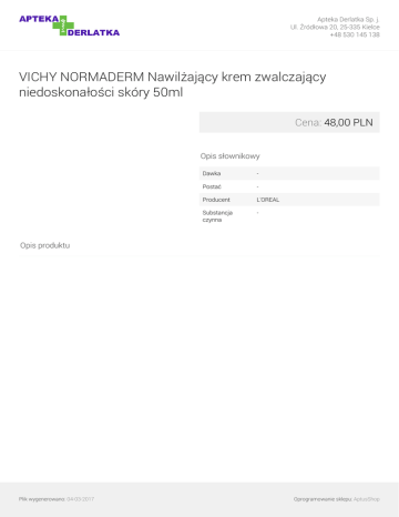 Apteka Derlatka Sp. j. Ul. Źródłowa 20, 25-335 Kielce +48 530 145 138 VICHY NORMADERM Nawilżający krem zwalczający niedoskonałości skóry 50ml Cena: 48,00 PLN Opis słownikowy Dawka - Postać - Producent L'OREAL Substancja czynna - Opis produktu Plik wygenerowano: 04-03-2017 Powered by TCPDF (www.tcpdf.org) Oprogramowanie sklepu: AptusShop