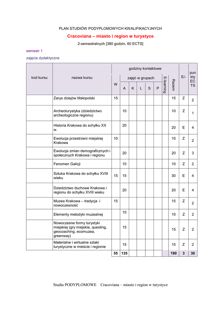 PLAN STUDIÓW PODYPLOMOWYCH KWALIFIKACYJNYCH Cracoviana – miasto i region w turystyce 2-semestralnych [380 godzin, 60 ECTS] semestr 1 zajęcia dydaktyczne godziny kontaktowe zajęć w grupach W A Zarys dziejów Małopolski L S P 15 Archeoturystyka (dziedzictwo archeologiczne regionu) 10 Historia Krakowa do schyłku XX w. 20 Ewolucja przestrzeni miejskiej Krakowa K 10 Razem nazwa kursu E-learning kod kursu E/- 15 Z 10 Z 20 E 10 Z pun kty EC TS 2 1 4 2 Ewolucja zmian demograficznych i społecznych Krakowa i regionu 20 20 Z 3 Fenomen Galicji 10 10 Z 2 15 30 E 4 20 20 E 4 15 Z 10 Z 2 15 Z 2 15 15 Z 2 55 135 190 3 30 Sztuka Krakowa do schyłku XVIII wieku 15 Dziedzictwo duchowe Krakowa i regionu do schyłku XVIII wieku Muzea Krakowa – tradycja i nowoczesność Elementy metodyki muzealnej Nowoczesne formy turystyki miejskiej (gry miejskie, questing, geocoaching, ecomuzea, greenway) Materialne i wirtualne szlaki turystyczne w mieście i regionie 15 10 15 Studia PODYPLOMOWE Cracoviana – miasto i region w turystyce 2 semestr 2 zajęcia dydaktyczne godziny kontaktowe nazwa kursu W A Dziedzictwo materialne i duchowe Krakowa XIX-XXI wieku K L S P Razem zajęć w grupach E-learning kod kursu E/- 30 E 4 30 E 4 10 10 Z 2 15 15 Z 2 Promocja produktu turystycznego – marka produktu regionalnego 15 15 Z 2 Potencjał turystyczny Krakowa i regionu 15 15 Z 2 Elementy turystyki kulturowej (postindustrialna, kulinarna, militarna, tanatoturystyka, itp.) 10 10 Z 2 Metodyka organizacji imprez turystycznych w mieście 15 15 E 3 Metodyka pilotażu miejskiego i przewodnictwa turystycznego 20 20 E 3 Edukacja na rzecz miasta i regionu 20 20 Z 2 10 10 E/Z 4 10 190 4 30 Kazimierz – dzieje i kultura Żydów Fenomen Nowej Huty 30 punkt y ECT S 15 15 Elementy przedsiębiorczości w turystyce miejskiej Seminarium dyplomowe 15 165 Studia PODYPLOMOWE Cracoviana – miasto i region w turystyce