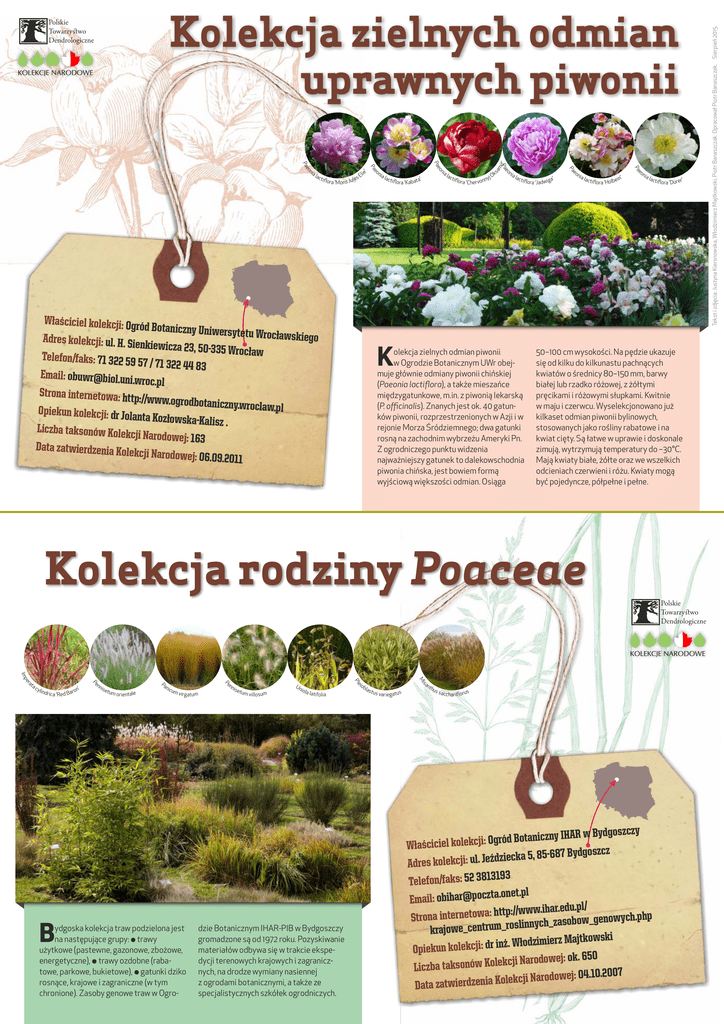 Właściciel kolekcji: Ogr ód Botaniczny Uniwersy t etu Wrocławskiego Adres kolekcji: ul. H. Sie nkiewicza 23, 50-335 W r o c ław Telefon/faks: 71 322 59 57 / 71 322 44 83 Email: [email protected] roc.pl Strona internetowa: http ://www.ogrodbotaniczny .wroclaw.pl Opiekun kolekcji: dr Jola nta Kozłowska-Kalisz . Liczba taksonów Kolekc ji Narodowej: 163 Data zatwierdzenia Kole kcji Narodowej: 06.09.20 11 K olekcja zielnych odmian piwonii w Ogrodzie Botanicznym UWr obejmuje głównie odmiany piwonii chińskiej (Paeonia lactiflora), a także mieszańce międzygatunkowe, m.in. z piwonią lekarską (P. officinalis). Znanych jest ok. 40 gatunków piwonii, rozprzestrzenionych w Azji i w rejonie Morza Śródziemnego; dwa gatunki rosną na zachodnim wybrzeżu Ameryki Pn. Z ogrodniczego punktu widzenia najważniejszy gatunek to dalekowschodnia piwonia chińska, jest bowiem formą wyjściową większości odmian. Osiąga 50–100 cm wysokości. Na pędzie ukazuje się od kilku do kilkunastu pachnących kwiatów o średnicy 80–150 mm, barwy białej lub rzadko różowej, z żółtymi pręcikami i różowymi słupkami. Kwitnie w maju i czerwcu. Wyselekcjonowano już kilkaset odmian piwonii bylinowych, stosowanych jako rośliny rabatowe i na kwiat cięty. Są łatwe w uprawie i doskonale zimują, wytrzymują temperatury do –30°C. Mają kwiaty białe, żółte oraz we wszelkich odcieniach czerwieni i różu. Kwiaty mogą być pojedyncze, półpełne i pełne. Kolekcja rodziny Poaceae B ydgoska kolekcja traw podzielona jest na następujące grupy: ○ trawy użytkowe (pastewne, gazonowe, zbożowe, energetyczne), ○ trawy ozdobne (rabatowe, parkowe, bukietowe), ○ gatunki dziko rosnące, krajowe i zagraniczne (w tym chronione). Zasoby genowe traw w Ogro- dzie Botanicznym IHAR-PIB w Bydgoszczy gromadzone są od 1972 roku. Pozyskiwanie materiałów odbywa się w trakcie ekspedycji terenowych krajowych i zagranicznych, na drodze wymiany nasiennej z ogrodami botanicznymi, a także ze specjalistycznych szkółek ogrodniczych. y z c z s o g d y B w R A H I y n z c i n a t o B d ó r g O : ji c Właściciel kolek z c z s o g d y B 7 8 -6 5 8 , 5 a k c e i z d ź e J . l u : ji c k e l Adres ko 3 9 1 3 1 8 3 2 5 : s k a f / n Telefo l .p t e n .o a t z c o p @ r a h i b Email: o / l .p u d .e r a h .i w w w / :/ p t t h : a w o t e n r e t n p i h a .p h c y Stron w o n e g _ w o b o s a z _ h c y n n i l s o r _ m u krajowe_centr i k s w o k jt a M z r e i m i z d o ł W . ż n i r d : ji c k e l Opiekun ko 0 5 6 . k o j: e w o d o r a N ji c k e l o K w ó n o s k a t a b z Lic 7 0 0 .2 0 .1 4 0 j: e w o d o r a N ji c k e l o K a i n e z d r e Data zatwi Tekst i zdjęcia: Justyna Kiersnowska, Włodzimierz Majtkowski, Piotr Banaszczak. Opracował Piotr Banaszczak. Sierpień 2015. Kolekcja zielnych odmian uprawnych piwonii