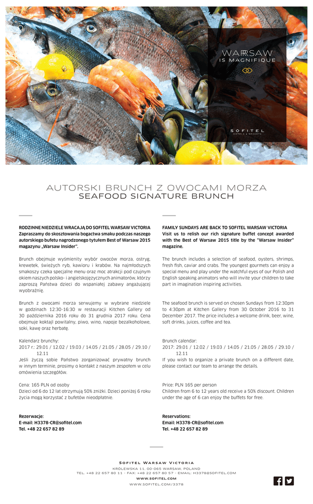 WAR RSAW is magnifique AUTORSKI BRUNCH Z OWOCAMI MORZA SEAFOOD SIGNATURE BRUNCH RODZINNE NIEDZIELE WRACAJĄ DO SOFITEL WARSAW VICTORIA Zapraszamy do skosztowania bogactwa smaku podczas naszego autorskiego bufetu nagrodzonego tytułem Best of Warsaw 2015 magazynu „Warsaw Insider”. FAMILY SUNDAYS ARE BACK TO SOFITEL WARSAW VICTORIA Visit us to relish our rich signature buffet concept awarded with the Best of Warsaw 2015 title by the “Warsaw Insider” magazine. Brunch obejmuje wyśmienity wybór owoców morza, ostryg, krewetek, świeżych ryb, kawioru i krabów. Na najmłodszych smakoszy czeka specjalne menu oraz moc atrakcji pod czujnym okiem naszych polsko- i angielskojęzycznych animatorów, którzy zaproszą Państwa dzieci do wspaniałej zabawy angażującej wyobraźnię. The brunch includes a selection of seafood, oysters, shrimps, fresh fish, caviar and crabs. The youngest gourmets can enjoy a special menu and play under the watchful eyes of our Polish and English speaking animators who will invite your children to take part in imagination inspiring activities. Brunch z owocami morza serwujemy w wybrane niedziele w godzinach 12:30-16:30 w restauracji Kitchen Gallery od 30 października 2016 roku do 31 grudnia 2017 roku. Cena obejmuje koktajl powitalny, piwo, wino, napoje bezalkoholowe, soki, kawę oraz herbatę. The seafood brunch is served on chosen Sundays from 12:30pm to 4:30pm at Kitchen Gallery from 30 October 2016 to 31 December 2017. The price includes a welcome drink, beer, wine, soft drinks, juices, coffee and tea. Kalendarz brunchy: 2017 r.: 29.01 / 12.02 / 19.03 / 14.05 / 21.05 / 28.05 / 29.10 / 12.11 Jeśli życzą sobie Państwo zorganizować prywatny brunch w innym terminie, prosimy o kontakt z naszym zespołem w celu omówienia szczegółów. Brunch calendar: 2017: 29.01 / 12.02 / 19.03 / 14.05 / 21.05 / 28.05 / 29.10 / 12.11 If you wish to organize a private brunch on a different date, please contact our team to arrange the details. Cena: 165 PLN od osoby Dzieci od 6 do 12 lat otrzymują 50% zniżki. Dzieci poniżej 6 roku życia mogą korzystać z bufetów nieodpłatnie. Price: PLN 165 per person Children from 6 to 12 years old receive a 50% discount. Children under the age of 6 can enjoy the buffets for free. Rezerwacje: E-mail: [email protected] Tel. +48 22 657 82 89 Reservations: Email: [email protected] Tel. +48 22 657 82 89 S o f i t e l Wa r saw Vi c to r i a KRÓLEWSKA 11, 00-065 WARSAW, POLAND TEL. +48 22 657 80 11 - FAX: +48 22 657 80 57 - EMAIL: [email protected] WWW.SOFITEL.COM W W W. S O F I T E L . CO M /3378
