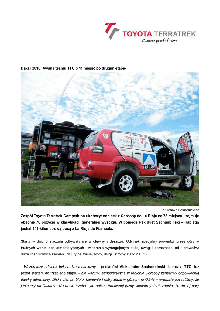 Dakar 2010: Awans teamu TTC o 11 miejsc po drugim etapie Fot. Marcin Paluszkiewicz Zespół Toyota Terratrek Competition ukończył odcinek z Cordoby do La Rioja na 78 miejscu i zajmuje obecnie 76 pozycję w klasyfikacji generalnej wyścigu. W poniedziałek duet Sachanbiński – Rabiega jechał 441-kilometrową trasą z La Rioja do Fiambala. Starty w dniu 3 stycznia odbywały się w ulewnym deszczu. Odcinek specjalny prowadził przez góry w trudnych warunkach atmosferycznych i w terenie wymagającym duŜej uwagi i sprawności od kierowców: duŜa ilość luźnych kamieni, dziury na trasie, błoto, długi i stromy zjazd na OS. - Wczorajszy odcinek był bardzo techniczny – podkreślał Aleksander Sachanbiński, kierowca TTC, tuŜ przed startem do trzeciego etapu. - Złe warunki atmosferyczne w regionie Cordoby zapewniły odpowiednią dawkę adrenaliny: śliska ziemia, błoto, kamienie i ostry zjazd w górach na OS-ie – wreszcie poczuliśmy, Ŝe jesteśmy na Dakarze. Na trasie trzeba było unikać forsownej jazdy. Jestem jednak zdania, Ŝe do tej pory Dakar nie jest tak trudny jak Silk Way we wrześniu ub. roku. Znacznie krótsze odcinki niŜ na Silku, mniej pyłu czy kolein w trasie. Dwa pierwsze dni Dakaru to jednak tylko zapowiedź atrakcji w dniach następnych. Czeka nas przeprawa przez Andy i Atakama. Trzeci etap maratonu z La Rioja do Fiambala liczy 441 km, z bardzo technicznym odcinkiem specjalnym o długości 182 km, fragmentami przebiegającym przez piaszczystą pustynię (ok. 30 km). - Nasza strategia jazdy sprawdza się: jedziemy swoje, ale bez forsowania, dostosowując prędkość naszego Land Cruisera do warunków na trasie – mówi Arkadiusz Rabiega, pilot w teamie Toyota Terratrek Competition. - Potwierdzeniem słuszności naszej taktyki jest awans o 11 pozycji w klasyfikacji generalnej. O Toyota Terratrek Competition: Team rajdowy TTC tworzą: Aleksander Sachanbiński – kierowca rajdowy i twórca zespołu, uczestnik m.in. Dakar 2009, Italian Baja 2009, Baja Hungaria 2009, Silk Way Rally, Baja Portalegre 2009, Baja Espana 2009, Erg Oriental 2008, rajdów Drezno-Wrocław 2007 i 2008, Cross Country Rally - Vsetin 2007, Baja Slovakia 2007, oraz doświadczony pilot Arkadiusz Rabiega, uczestnik Dakar 2009, Italian Baja 2009, Baja Hungaria 2009, Silk Way Rally, Baja Portalegre 2009 i Baja Espana 2009, pilot w zawodach Erg Oriental 2008, Rajdowych Mistrzostw Polski Samochodów Terenowych 2007 i 2008 (gdzie zdobył dwukrotnie tytuł mistrza w klasie O2), ,. Załogę wspomagają mechanicy: Arkadiusz Święcicki (specjalista elektryk i znawca silników) oraz Rafał Matyszkiewicz (który odpowiada za zawieszenie, systemy hamulcowe i paliwowe). Członkiem TCC jest równieŜ Piotr Domański, team manager odpowiadający za logistykę i kontakty z organizatorami rajdów oraz kierowca cięŜarówki serwisowej Duet Sachanbiński – Rabiega jeździ Toyotą Land Cruiserem KDJ 120, dostosowanym do specyfikacji rajdów maratońskich i pustynnych przez Toyota France Competition. Mechanicy towarzyszą rajdowcom w nowocześnie wyposaŜonej cięŜarówce serwisowej MAN TGM 13-280 4X4. W 2009 r. team TTC odniósł duŜy sukces, zajmując 4 pozycję w zestawieniu Pucharu Europy FIA. Duet Sachanbiński – Rabiega startował w br. w kilku zawodach terenowych, m.in.: Italian Baja, Baja España Aragon, Baja Portalegre. We wrześniu br. załoga Toyoty Terratrek Competition wystartowała w naleŜącym do Dakar Series rajdzie Silk Way Rally (Tatarstan, Kazachstan, Turkmenistan). TTC był jedynym teamem z Polski biorącym udział w tym prestiŜowym maratonie.