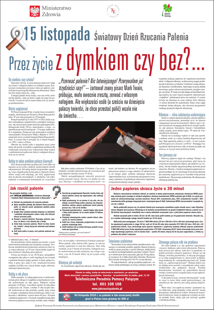 15 listopada Światowy Dzień Rzucania Palenia Przez życie Do siedmiu razy sztuka? Statystyki mówią, że przeciętnemu palaczowi udaje się rozstać z nałogiem dopiero za siódmym razem. Krytycznym momentem jest ponoć okres po upływie czterech pierwszych tygodni nikotynowej abstynencji. Okres ten trwa mniej więcej do… roku. Z drugiej jednak strony każdy z nas zna osoby, które rzuciły palenie z dnia na dzień i nigdy do niego nie powróciły. I wcale nie byli to tytani silnej woli czy mocnego postanowienia… Warto nagłaśniać W Polsce od ponad 20 lat, w każdy trzeci czwartek listopada, obchodzony jest Światowy Dzień Rzucania Palenia. W tym roku przypada na 15 listopada. Pomysł narodził się w roku 1977 w USA, kiedy to jeden z dziennikarzy zaapelował do czytelników swojej gazety, aby chociaż przez jeden dzień nie palili papierosów. Zareagowało wtedy 150 tys. Amerykanów, z czego – co sprawdzono po trzech miesiącach – 15 tysięcy nadal trwało w niepaleniu. Zachęcone tym doskonałym wynikiem Amerykańskie Towarzystwo Walki z Rakiem w 1977 r. ustanowiło trzeci czwartek listopada Dniem Rzucania Palenia. Z czasem idea ta przyjęła się w innych krajach, a w 1991 r. także w Polsce. Obecnie nie chodzi tylko o niepalenie przez jeden dzień, ale przede wszystkim o nagłaśnianie problemu dla zwiększanie motywacji oraz wskazywanie dróg wyjścia z uzależnienia tym palaczom, którzy z nałogiem chcą zerwać raz na zawsze. z dymkiem czy bez?... „Przerwać palenie? Nic łatwiejszego! Przerywałem już trzydzieści razy!” – żartował znany pisarz Mark Twain, próbując, mało owocnie zresztą, zerwać z własnym nałogiem. Ale większości osób (a sześciu na dziesięciu palaczy twierdzi, że chce przestać palić) wcale nie do śmiechu… Rak płuca zabija codziennie 55 Polaków. Czas od zadziałania czynnika rakotwórczego do rozwinięcia pełnych objawów choroby wynosi 15-20 lat... Ta kich przygnę bia ją cych sta ty styk przy to czyć można znacznie więcej. Ale nie o to chodzi, by straszyć. Decyzja – z dymkiem czy bez przez życie – za- Jak rzucić palenie Na początek niektóre z rad prof. WITOLDA ZATOŃSKIEGO z Centrum Onkologii – Instytutu Marii Skłodowskiej-Curie w Warszawie*: l l l l l Nastaw się pozytywnie do rzucenia palenia. Spisz wszystkie powody, dla których chcesz przestać palić; co wieczór przed zaśnięciem powtórz jeden z nich 10 razy. Znajdź silne osobiste powody związane ze zdrowiem i podejmij zobowiązania wobec osób, dla których chcesz przestać palić. Pomyśl o swoich bliskich. Rzucając palenie, okażesz, że dbasz o ich zdrowie jak o swoje. Ustal datę rzucenia palenia. Niech ta data stanie się „święta”, staraj się jej nie zmieniać pod żadnym pozorem. Jeśli dużo palisz w pracy, rzuć palenie podczas wakacji. w zakładach pracy oraz… w domach. Jak dowiedziono, bierne palenie jest równie, a może nawet bardziej niebezpieczne od palenia czynnego. Tzw. boczny strumień dymu tytoniowego zawiera aż cztery razy więcej nikotyny i aż 35 razy więcej tlenku węgla niż dym tytoniowy wdychany przez palacza! Uważa się również, że ok. 20-30 proc. przypadków wystąpienia raka płuca u osób niepalących ma związek z paleniem biernym (palący partner w domu, palący koledzy w pracy itp.), gdyż w tzw. strumieniu bocznym znajduje się kilka razy więcej tlenku węgla, nikotyny, substancji rakotwórczych... Nałóg a rak płuca Warto pamiętać, że nałóg papierosowy to niekwestionowany przez nikogo (z wyjątkiem samych palaczy) czynnik zachorowania na raka płuca. Nałogowi można przypisać aż 90 proc. wszystkich zgonów na raka płuca u mężczyzn i ok. 70 proc. u kobiet. U obu zaś płci odsetek zachorowań na raka przełyku, gardła, jamy ustnej w związku z działaniem dymu tytoniowego, także w połączeniu z alkoholem, wynosi nawet 60 proc. Związek z paleniem papierosów w licznych wypadkach mają także nowotwory pęcherza moczowego, trzustki, nerki, żołądka. Nawet w małych dawkach nikotyna szkodzi układowi sercowo-naczyniowemu, prowadząc m.in. do skurczu i degeneracji naczyń krwionośnych. Oprócz niej w dymie tytoniowym występują rakotwórcze związki smołowe, jak antracen, benzopiren, benzen i formaldehyd, a także cyjanek, arsen, tlenek węgla... W sumie ok. 4 tys. szkodliwych substancji. Palenie nie na każdego wpływa w taki sam sposób, a niektóre osoby są z natury bardziej długowieczne niż inne. Stąd argumenty palaczy w stylu: „A mój znajomy palił 60 papierosów dziennie i żył 90 lat”. Pomijając wiarygodność takich opowieści, fakt, że komuś się udało, nie oznacza, że wyczyn może powtórzyć każdy. kotyk, jak kokaina czy heroina. Po zaciągnięciu się papierosowym dymem w ciągu zaledwie 10 sekund dociera do mózgu, gdzie wydziela substancje chemiczne odpowiedzialne m.in. za doznawanie przyjemności związanej z paleniem. Za pobudzenie aktywności organizmu, za lepszą koncentrację uwagi i pamięć… Pierwszy papieros nigdy nie smakuje. Pamięć o tej inicjacji nie jest zazwyczaj przyjemna, gdyż łączą się z nią mocno nieprzyjemne objawy, jak nudności czy wymioty. Ale tak właśnie organizm próbuje się bronić przed zatruciem. Niestety, z każdym następnym papierosem organizm poddaje się, bo otrzymując nowe porcje nikotyny jest zmuszony angażować ją we wszystkie swoje procesy metaboliczne. Tak powstaje uzależnienie. Bo nikotyna jest substancją narkotyczną. Jeden papieros skraca życie o 30 minut l l l Nikotyna – silna substancja uzależniająca Ten pierwszy raz Nałóg to także problem palaczy biernych Przy okazji przypomina się palaczom, iż nie tylko oni narażeni są na ryzyko ciężkich, nieuleczalnych chorób odtytoniowych. Ich nałóg dotyka bezpośrednio ogromną, wręcz niepoliczalną liczbę palaczy biernych, którzy wbrew swojej woli wdychają „nie swój” papierosowy dym na ulicach, przystankach, w szkolnych, i 