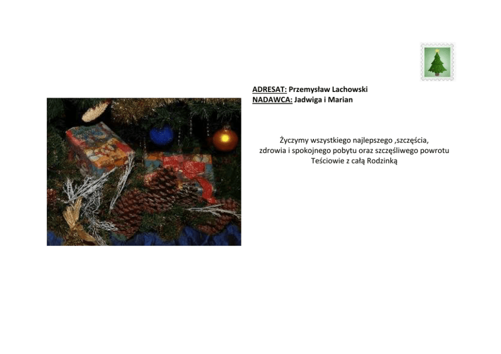 ADRESAT: Przemysław Lachowski NADAWCA: Jadwiga i Marian Życzymy wszystkiego najlepszego ,szczęścia, zdrowia i spokojnego pobytu oraz szczęśliwego powrotu Teściowie z całą Rodzinką