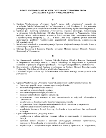 REGULAMIN ORGANIZACYJNY OGNISKA WYCHOWAWCZEGO „PRZYJAZNY KĄCIK” W WĘGORZEWIE §1 1. Ognisko Wychowawcze „Przyjazny Kącik”, zwane dalej „Ogniskiem” znajduje się w budynku Szkoły Podstawowej Nr 2 w Węgorzewie przy ul. Zamkowej 6 i jest jednostką podległą organizacyjnie Miejsko-Gminnemu Ośrodkowi Pomocy Społeczne w Węgorzewie. 2. Ognisko jest placówką opiekuńczo-wychowawczą wsparcia dziennego, funkcjonującą w strukturze Miejsko-Gminnego Ośrodka Pomocy Społecznej w Węgorzewie., która realizuje zadania i cele w oparciu o ustawę z dnia 9 czerwca 2011 r. o wspieraniu rodziny i systemie pieczy zastępczej (t.j. Dz.U. z 2016 r. poz. 575) i zapewnia pomoc dzieciom sprawiającym problemy wychowawcze, zagrożonych demoralizacją, przestępczością lub uzależnieniami. 3. Nadzór nad działalnością placówki sprawuje Dyrektor Miejsko-Gminnego Ośrodka Pomocy Społecznej w Węgorzewie. 4. Obsługę finansową i kadrową Ogniska prowadzi Miejsko-Gminny Ośrodek Pomocy Społecznej w Węgorzewie. §2 1. Na finansowanie działalności Ogniska Miejsko-Gminny Ośrodek Pomocy Społecznej w Węgorzewie otrzymuje dotację z Urzędu Miejskiego w Węgorzewie w wysokości określonej w gminnym programie profilaktyki i rozwiązywania problemów alkoholowych. 2. Sprawozdanie z działalności Ogniska przedkładane są Gminnej Komisji Rozwiązywania Problemów Alkoholowych i Radzie Miejskiej w Węgorzewie. 3. Działalność Ogniska może być dofinansowana ze środków fundacji, stowarzyszeń i osób prywatnych. §3 1. Ognisko Wychowawcze „Przyjazny Kącik” stwarza swoim wychowankom warunki do: fizycznego, psychicznego, poznawczego rozwoju dziecka; poszanowania podmiotowości dziecka; zapewnienia poczucia bezpieczeństwa; poszanowania potrzeb religijnych dziecka; poszanowania tradycji i ciągłości kulturowej; organizowania czasu wolnego w tym uczestniczenia w zajęciach rekreacyjnych i sportowych; kształtowania u dzieci nawyków i zachowań prozdrowotnych; przygotowanie dzieci do ponoszenia odpowiedzialności za własne postępowanie; wyrównywanie deficytów rozwojowych; uzgadniania istotnych decyzji dotyczących dziecka z jego rodzicami lub opiekunami prawnymi. 2. Ognisko Wychowawcze „Przyjazny Kącik”: współpracuje z rodziną dziecka i wspiera rodzinę w sprawowaniu jej podstawowych funkcji; zapewnia pomoc rodzinie i dzieciom sprawiającym problemy wychowawcze, zagrożonym demoralizacją, przestępczością lub uzależnieniem; współpracuje z Miejsko-Gminnym Ośrodkiem Pomocy Społecznej w Węgorzewie, Powiatowym Centrum Pomocy Rodzinie w Węgorzewie, Poradnią PsychologicznoPedagogiczną, Szkołami, Sądami, mediami, pracodawcami oraz innymi instytucjami i organizacjami działającymi na rzecz dziecka i rodziny. 3. Pomoc może być udzielana poprzez: pomoc w kryzysach szkolnych, rodzinnych, rówieśniczych, osobistych; zajęcia korekcyjno-kompensacyjne; zajęcia logopedyczne; zajęcia z psychologiem; indywidualne programy korekcyjne; pomoc w nauce; pomoc socjalną; organizację czasu wolnego, rozwój zainteresowań; organizację zajęć i zabaw sportowych §4 1. Ognisko Wychowawcze „Przyjazny Kącik” czynne jest we wszystkie dni robocze w godzinach 8.00 – 16.00 również w okresie ferii zimowych i letnich. 2. Pobyt w Ognisku jest dobrowolny i nieodpłatny. 3. Placówka zapewnia dzieciom materiały potrzebne do zajęć. §5 1. Do Ogniska Wychowawczego „Przyjazny Kącik” przyjmowane są dzieci będące uczniami szkoły podstawowej i gimnazjum, które mieszkają na terenie miasta i gminy Węgorzewo, są w normie intelektualnej i które: pochodzą z rodzin niewydolnych wychowawczo i z rodzin zagrożonych patologią; znajdują się w trudnej sytuacji osobistej, rodzinnej, życiowej; wymagają specjalistycznej pomocy i terapii; są nieprzystosowane społecznie; są niepełnosprawne ruchowo, jeżeli nie ma uzasadnionych przeciwwskazań; nie potrafią nawiązać kontaktu z rówieśnikami i dorosłymi; są nadruchliwe, nadpobudliwe; są zahamowane emocjonalnie; są agresywne 2. Wychowanków do Ogniska przyjmuje się: na prośbę rodziców lub opiekunów dziecka; na wniosek pedagogów lub wychowawców klas; na wniosek pracownika socjalnego lub asystenta rodziny; na wniosek kuratora sądowego; ze skierowania Sądu. 3. Dzieci do Ogniska przyjmowane są bez skierowania po zasięgnięciu opinii pedagoga szkolnego, dyrektora szkoły, poradni psychologiczno-pedagogicznej, kuratora lub ośrodka pomocy społecznej, za zgodą rodziców dziecka. 4. Dzieci uczęszczają na zajęcia z własnej woli, ale za zgodą rodziców, chyba że do Ogniska skieruje Sąd. 5. Rodzice wypełniają pisemnie druk Zgłoszenia dziecka do Ogniska na dany rok (od września jednego roku do września następnego roku). 6. Ognisko dysponuje 15 miejscami. 7. Z uwagi na fakt, że w okresie ferii zimowych i letnich zajęcia w dużej mierze odbywają się poza terenem Ogniska, w okresach tych pod opieką jednego wychowawcy może przebywać nie więcej niż 10 dzieci. 8. W zajęciach podczas ferii i półkolonii biorą udział jedynie dzieci, które uczestniczą w procesie wychowawczym zgodnie z listą w dzienniku, chyba że dziecko uczęszczające na te zajęcia, będzie po ich zakończeniu wychowankiem Ogniska; 9. Podczas zajęć odbywających się poza terenem placówki pod opieką jednego wychowawcy może przebywać nie więcej niż 10 dzieci. §6 1. Metody pracy w Ognisku: indywidualne zajęcia z wychowankiem; zajęcia grupowe; zajęcia ogólnorozwojowe; zajęcia sportowo- rekreacyjne; zabawy ze śpiewem i tańcem; gry i zabawy dydaktyczne; metody relaksujące „burza mózgów”; twórczość plastyczna; psychodramy. 2. Formy pracy w Ognisku: pomoc przy odrabianiu lekcji; zajęcia informatyczne; zajęcia czytelnicze; gry i zabawy stolikowe; zajęcia korekcyjno-kompensacyjne; zajęcia logopedyczne; zajęcia sportowe; plażowanie, kąpiele i nauka pływania; dyskoteki, ogniska; konkursy, rebusy, q