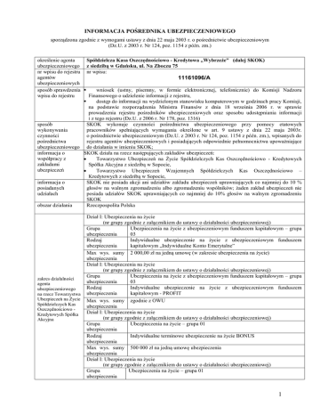 INFORMACJA POŚREDNIKA UBEZPIECZENIOWEGO sporządzona zgodnie z wymogami ustawy z dnia 22 maja 2003 r. o pośrednictwie ubezpieczeniowym (Dz.U. z 2003 r. Nr 124, poz. 1154 z późn. zm.) określenie agenta Spółdzielcza Kasa Oszczędnościowo - Kredytowa „Wybrzeże” (dalej SKOK) ubezpieczeniowego z siedzibą w Gdańsku, ul. Na Zboczu 75 nr wpisu do rejestru nr wpisu: agentów 11161096/A ubezpieczeniowych sposób sprawdzenia wniosek (ustny, pisemny, w formie elektronicznej, telefonicznie) do Komisji Nadzoru wpisu do rejestru Finansowego o udzielenie informacji z rejestru, dostęp do informacji na wydzielonym stanowisku komputerowym w godzinach pracy Komisji, na podstawie rozporządzenia Ministra Finansów z dnia 18 września 2006 r. w sprawie prowadzenia rejestru pośredników ubezpieczeniowych oraz sposobu udostępniania informacji i z tego rejestru (Dz.U. z 2006 r. Nr 178, poz. 1316) sposób SKOK wykonuje czynności pośrednictwa ubezpieczeniowego przy pomocy etatowych wykonywania pracowników spełniających wymagania określone w art. 9 ustawy z dnia 22 maja 2003r. czynności o pośrednictwie ubezpieczeniowym (Dz.U. z 2003 r. Nr 124, poz. 1154 z późn. zm.), wpisanych do pośrednictwa rejestru agentów ubezpieczeniowych i posiadających odpowiednie pełnomocnictwa upoważniające ubezpieczeniowego do działania w imieniu SKOK; informacja o SKOK działa na rzecz następujących zakładów ubezpieczeń: współpracy z Towarzystwo Ubezpieczeń na Życie Spółdzielczych Kas Oszczędnościowo - Kredytowych zakładami Spółka Akcyjna z siedzibą w Sopocie, ubezpieczeń Towarzystwo Ubezpieczeń Wzajemnych Spółdzielczych Kas Oszczędnościowo – Kredytowych z siedzibą w Sopocie, informacja o SKOK nie posiada akcji ani udziałów zakładu ubezpieczeń uprawniających co najmniej do 10 % posiadanych głosów na walnym zgromadzeniu albo zgromadzeniu wspólników; żaden zakład ubezpieczeń nie udziałach posiada udziałów SKOK uprawniających co najmniej do 10% głosów na walnym zgromadzeniu SKOK obszar działania Rzeczpospolita Polska zakres działalności agenta ubezpieczeniowego na rzecz Towarzystwa Ubezpieczeń na Życie Spółdzielczych Kas Oszczędnościowo Kredytowych Spółka Akcyjna Dział I: Ubezpieczenia na życie (nr grupy zgodnie z załącznikiem do ustawy o działalności ubezpieczeniowej) Grupa Ubezpieczenia na życie z ubezpieczeniowym funduszem kapitałowym – grupa ubezpieczenia 03 Rodzaj Indywidualne ubezpieczenie na życie z ubezpieczeniowym funduszem ubezpieczenia kapitałowym „Indywidualne Konto Emerytalne” Max wys. sumy 2 000,00 zł na jedną umowę (w zakresie ubezpieczenia na życie) ubezpieczenia Dział I: Ubezpieczenia na życie (nr grupy zgodnie z załącznikiem do ustawy o działalności ubezpieczeniowej) Grupa Ubezpieczenia na życie z ubezpieczeniowym funduszem kapitałowym – grupa ubezpieczenia 03 Rodzaj Indywidualne ubezpieczenie na życie z ubezpieczeniowym funduszem ubezpieczenia kapitałowym - PROFIT Max wys. sumy zgodnie z OWU ubezpieczenia Dział I: Ubezpieczenia na życie (nr grupy zgodnie z załącznikiem do ustawy o działalności ubezpieczeniowej) Grupa Ubezpieczenia na życie – grupa 01 ubezpieczenia Rodzaj Indywidualne terminowe ubezpieczenie na życie BONUS ubezpieczenia Max wys. sumy 500 000 zł na jedną umowę ubezpieczenia ubezpieczenia Dział I: Ubezpieczenia na życie (nr grupy zgodnie z załącznikiem do ustawy o działalności ubezpieczeniowej) Grupa Ubezpieczenia na życie – grupa 01 ubezpieczenia 1 zakres działalności agenta ubezpieczeniowego na rzecz Towarzystwa Ubezpieczeń Wzajemnych Spółdzielczych Kas Oszczędnościowo Kredytowych Rodzaj Indywidualne ubezpieczenie na życie z ubezpieczeniowym funduszem ubezpieczenia kapitałowym - PROGRES Max wys. sumy 10 % Wartości Wykupu, jednak nie więcej niż 100 000, 00 zł na jedną umowę ubezpieczenia ubezpieczenia Dział I: Ubezpieczenia na życie (nr grupy zgodnie z załącznikiem do ustawy o działalności ubezpieczeniowej) Grupa Ubezpieczenia na życie - grupa 01 ubezpieczenia Rodzaj Indywidualne ubezpieczenie na życie – TWOJA PROMESA ubezpieczenia Max wys. sumy zgodnie z OWU ubezpieczenia Dział I: Ubezpieczenia na życie (nr grupy zgodnie z załącznikiem do ustawy o działalności ubezpieczeniowej) Grupa Ubezpieczenia na życie - grupa 01 ubezpieczenia Rodzaj Indywidualne ubezpieczenie na życie – TWOJA LINIA ubezpieczenia Max wys. sumy zgodnie z OWU ubezpieczenia Dział II: Pozostałe ubezpieczenia osobowe oraz ubezpieczenia majątkowe (nr grupy zgodnie z załącznikiem do ustawy o działalności ubezpieczeniowej) Grupa Ubezpieczenia wypadku, w tym wypadku przy pracy i choroby zawodowej . ubezpieczenia Ubezpieczenia szkód spowodowanych żywiołami. Ubezpieczenia pozostałych szkód rzeczowych wywołanych przez grad lub mróz oraz inne przyczyny ( np. kradzież ). Ubezpieczenia odpowiedzialności cywilnej. Rodzaj Ubezpieczenie mieszkań i domów jednorodzinnych ubezpieczenia Max wys. sumy Dom jednorodzinny Pożar, powódź i inne zdarzenia losowe 2 500 000,00 zł ubezpieczenia Dom jednorodzinny (łącznie ze stałymi elementami) Pożar, powódź i inne zdarzenia losowe 2 500 000,00 zł Dom jednorodzinny w budowie Pożar, powódź i inne zdarzenia losowe 1 000 000,00 zł Mieszkanie Pożar, powódź i inne zdarzenia losowe 1 500 000,00 zł Budynki gospodarcze Pożar, powódź i inne zdarzenia losowe 30 000,00 zł Budowle Pożar, powódź i inne zdarzenia losowe 30 000,00 zł Stałe elementy Pożar, powódź i inne zdarzenia losowe, Kradzież z włamaniem i rozbój 150 000,00 zł Ruchomości domowe Pożar , powódź i inne zdarzenia losowe, Kradzież z włamaniem i rozbój 150 000,00 zł Kolektory słoneczne, Zewnętrzne elementy anteny satelitarnej Pożar i inne zdarzenia losowe, kradzież zwykła, dewastacja 20 000,00 zł Dewastacja 20 000,00 zł Szyby Stłuczenie i pęknięcie 10 000,00 zł Odpowiedzialność cywilna 200 000,00 zł Następstwa nieszcz