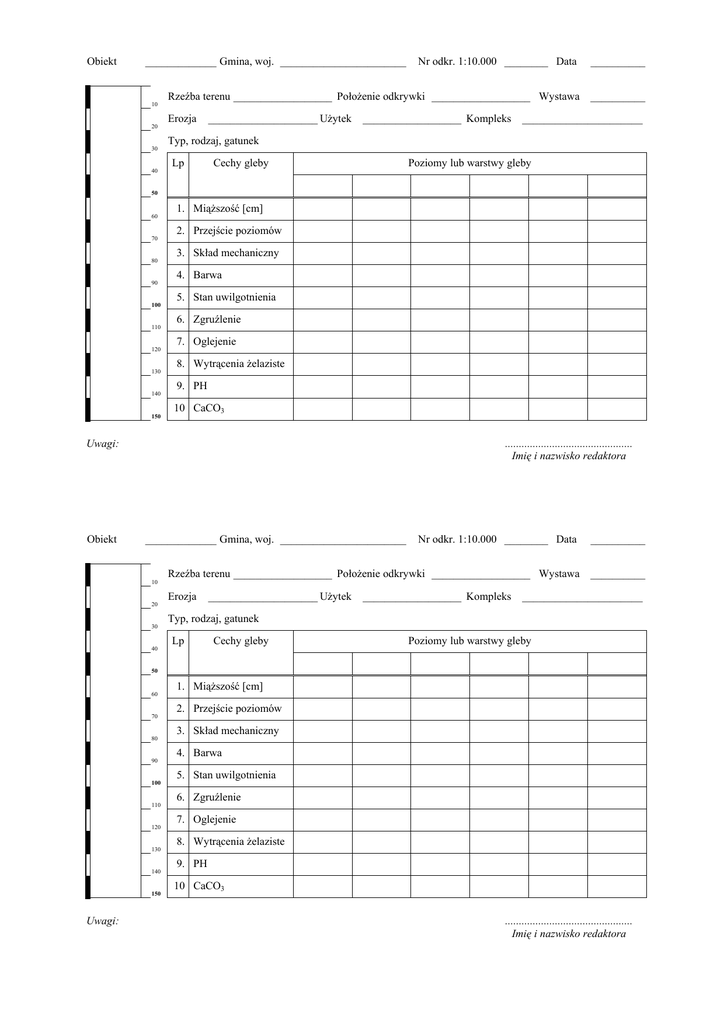 Obiekt _____________ Gmina, woj. _______________________ 10 20 30 40 Nr odkr. 1:10.000 ________ Data __________ Rzeźba terenu __________________ Położenie odkrywki __________________ Wystawa __________ Erozja ____________________ Użytek __________________ Kompleks ______________________ Typ, rodzaj, gatunek Lp Cechy gleby Poziomy lub warstwy gleby 50 60 70 80 90 100 110 120 130 140 150 1. Miąższość [cm] 2. Przejście poziomów 3. Skład mechaniczny 4. Barwa 5. Stan uwilgotnienia 6. Zgruźlenie 7. Oglejenie 8. Wytrącenia żelaziste 9. PH 10 CaCO3 Uwagi: Obiekt .............................................. Imię i nazwisko redaktora _____________ Gmina, woj. _______________________ 10 20 30 40 Nr odkr. 1:10.000 ________ Data __________ Rzeźba terenu __________________ Położenie odkrywki __________________ Wystawa __________ Erozja ____________________ Użytek __________________ Kompleks ______________________ Typ, rodzaj, gatunek Lp Cechy gleby Poziomy lub warstwy gleby 50 60 70 80 90 100 110 120 130 140 150 Uwagi: 1. Miąższość [cm] 2. Przejście poziomów 3. Skład mechaniczny 4. Barwa 5. Stan uwilgotnienia 6. Zgruźlenie 7. Oglejenie 8. Wytrącenia żelaziste 9. PH 10 CaCO3 .............................................. Imię i nazwisko redaktora Wykaz znaków i opisów odkrywki glebowej 1. 2. 3. 4. Erozja wodna zmyw słaby umiarkow. zmyw intensywny zmyw silny erozja liniowa Położenie odkrywki 1. grzbietowe 2. płaskie o dobrym odpływie 3. płaskie o słabym odpływie 4. słaby stok 5. średni stok 6. silny stok 7. rynna przepływowa 8. zagłębienie bezodpływowe Wystawa E wschodnia S południowa W zachodnia N północna Skład mechaniczny sk skała lita sz utwór szkieletowy ż żwir piaszczysty żg żwir gliniasty pl piasek luźny ps piasek słabogliniasty pgl piasek gliniasty lekki pgm piasek gliniasty mocny gl glina lekka gś glina średnia gc glina ciężka psp piasek słabogliniasty pylasty pglp piasek gliniasty lekki pylasty pgmp piasek gliniasty mocny pyalsty glp glina lekka pylasta gśp glina średnia pylasta gcp glina ciężka pylasta płz pył zwykły płi pył ilasty ls less zwykły ił ił iłp ił pylasty Skały organogeniczne T torf M mursz 1. 2. 3. 4. 5. 6. 7. 8. 9. 10. 11. Rzeźba terenu płaska niskofalista niskofalista pagórkowata falista falista pagórkowata wysokofalista wysokofalista pagórkowata wzgórzowa góry niskie góry średnie góry wysokie Przejście poziomów 1. ostre (do 2 cm) 2. wyraźne (2-5) 3. stopniowe (5-10) 4. niewyraźne 5. zaciekowe 6. klinowe Barwa 1. popielata 2. szaropopielata 3. jasno szara 4. szara 5. ciemno szara 6. czarna 7. jasno żółta 8. żółta 9. ciemno żółta 10. brunatna 11. rdzawo-brunatna, intensywnie brunatna 12. rdzawa 13. zielona 14. szaro zielona 15. niebieska 16. szaro niebieska 17. ciemno niebieska Kategorie stosunków wodno – powietrznych 1. właściwe 1a okresowo za wilgotne 2. okresowo podmokłe 3. stale podmokłe 4. okresowo za suche 5. stale za suche Stan uwilgotnienia 1. suchy 2. świerzy 3. wilgotny 4. mokry 1. 2. 3. 4. 5. 6. 7. 8. 9. Zgruźlenie brak słabe ziarniste gruzełkowate pryzmatyczne orzeszkowe słupkowe płytkowe bryłowate 1. 2. 3. 4. 5. Oglejenie plamiste zaciekowe marmurkowate strefowe całkowite 1. 2. 3. 4. Stopień kultury słaby średni dobry bardzo dobry Wytrącenia żelaziste 1. pseudogrzybnie 2. pasemka 3. smugi poziome 4. otoczki 5. smugi pionowe 6. plamy 7. pieprze 8. groszki 9. orzeszki 10. rudawce 11. rurki Kompleksy rolniczej przydatności 1. pszenny b. dobry 2. pszenny dobry 3. pszenny wadliwy 4. żytni b. dobry 5. żytni (żytnio-ziemniaczany) dobry 6. żytni (żytnio-ziemniaczany) słaby 7. żytni najsłabszy (żytnio-łubinowy) 8. zbożowo-pastewny mocny 9. zbożowo-pastewny słaby 10. owsiano-ziemniaczany górski 11. owsiany górski 12. gleba orna pod użytki zielone Wykaz znaków i opisów odkrywki glebowej 5. 6. 7. 8. Erozja wodna zmyw słaby umiarkow. zmyw intensywny zmyw silny erozja liniowa Położenie odkrywki 9. grzbietowe 10. płaskie o dobrym odpływie 11. płaskie o słabym odpływie 12. słaby stok 13. średni stok 14. silny stok 15. rynna przepływowa 16. zagłębienie bezodpływowe Wystawa E wschodnia S południowa W zachodnia N północna Skład mechaniczny sk skała lita sz utwór szkieletowy ż żwir piaszczysty żg żwir gliniasty pl piasek luźny ps piasek słabogliniasty pgl piasek gliniasty lekki pgm piasek gliniasty mocny gl glina lekka gś glina średnia gc glina ciężka psp piasek słabogliniasty pylasty pglp piasek gliniasty lekki pylasty pgmp piasek gliniasty mocny pyalsty glp glina lekka pylasta gśp glina średnia pylasta gcp glina ciężka pylasta płz pył zwykły płi pył ilasty ls less zwykły ił ił iłp ił pylasty Skały organogeniczne T torf M mursz 12. 13. 14. 15. 16. 17. 18. 19. 20. 21. 22. Rzeźba terenu płaska niskofalista niskofalista pagórkowata falista falista pagórkowata wysokofalista wysokofalista pagórkowata wzgórzowa góry niskie góry średnie góry wysokie Przejście poziomów 7. ostre (do 2 cm) 8. wyraźne (2-5) 9. stopniowe (5-10) 10. niewyraźne 11. zaciekowe 12. klinowe Barwa 18. popielata 19. szaropopielata 20. jasno szara 21. szara 22. ciemno szara 23. czarna 24. jasno żółta 25. żółta 26. ciemno żółta 27. brunatna 28. rdzawo-brunatna, intensywnie brunatna 29. rdzawa 30. zielona 31. szaro zielona 32. niebieska 33. szaro niebieska 34. ciemno niebieska Kategorie stosunków wodno – powietrznych 6. właściwe 1a okresowo za wilgotne 7. okresowo podmokłe 8. stale podmokłe 9. okresowo za suche 10. stale za suche Stan uwilgotnienia 5. suchy 6. świerzy 7. wilgotny 8. mokry Zgruźlenie 10. brak 11. słabe 12. ziarniste 13. gruzełkowate 14. pryzmatyczne 15. orzeszkowe 16. słupkowe 17. płytkowe 18. bryłowate Oglejenie 6. plamiste 7. zaciekowe 8. marmurkowate 9. strefowe 10. całkowite 5. 6. 7. 8. Stopień kultury słaby średni dobry bardzo dobry 12. 13. 14. 15. 16. 17. 18. 19. 20. 21. 22. Wy