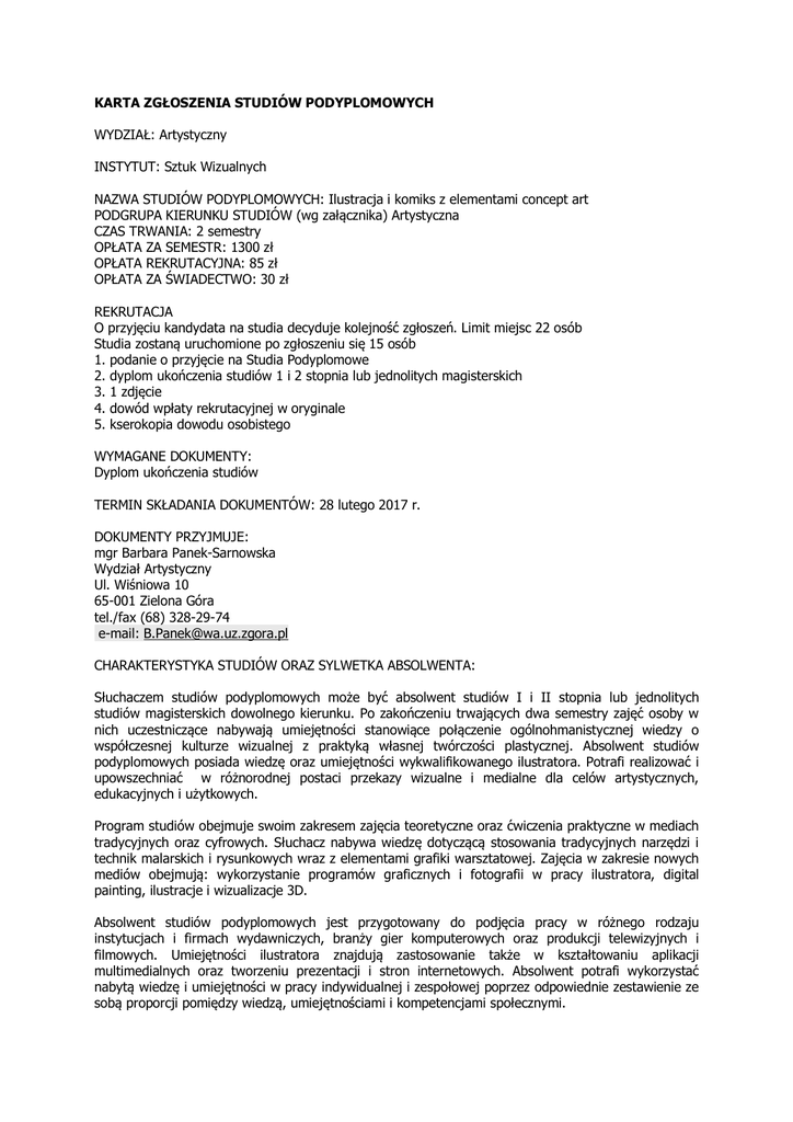 KARTA ZGŁOSZENIA STUDIÓW PODYPLOMOWYCH WYDZIAŁ: Artystyczny INSTYTUT: Sztuk Wizualnych NAZWA STUDIÓW PODYPLOMOWYCH: Ilustracja i komiks z elementami concept art PODGRUPA KIERUNKU STUDIÓW (wg załącznika) Artystyczna CZAS TRWANIA: 2 semestry OPŁATA ZA SEMESTR: 1300 zł OPŁATA REKRUTACYJNA: 85 zł OPŁATA ZA ŚWIADECTWO: 30 zł REKRUTACJA O przyjęciu kandydata na studia decyduje kolejność zgłoszeń. Limit miejsc 22 osób Studia zostaną uruchomione po zgłoszeniu się 15 osób 1. podanie o przyjęcie na Studia Podyplomowe 2. dyplom ukończenia studiów 1 i 2 stopnia lub jednolitych magisterskich 3. 1 zdjęcie 4. dowód wpłaty rekrutacyjnej w oryginale 5. kserokopia dowodu osobistego WYMAGANE DOKUMENTY: Dyplom ukończenia studiów TERMIN SKŁADANIA DOKUMENTÓW: 28 lutego 2017 r. DOKUMENTY PRZYJMUJE: mgr Barbara Panek-Sarnowska Wydział Artystyczny Ul. Wiśniowa 10 65-001 Zielona Góra tel./fax (68) 328-29-74 e-mail: [email protected] CHARAKTERYSTYKA STUDIÓW ORAZ SYLWETKA ABSOLWENTA: Słuchaczem studiów podyplomowych może być absolwent studiów I i II stopnia lub jednolitych studiów magisterskich dowolnego kierunku. Po zakończeniu trwających dwa semestry zajęć osoby w nich uczestniczące nabywają umiejętności stanowiące połączenie ogólnohmanistycznej wiedzy o współczesnej kulturze wizualnej z praktyką własnej twórczości plastycznej. Absolwent studiów podyplomowych posiada wiedzę oraz umiejętności wykwalifikowanego ilustratora. Potrafi realizować i upowszechniać w różnorodnej postaci przekazy wizualne i medialne dla celów artystycznych, edukacyjnych i użytkowych. Program studiów obejmuje swoim zakresem zajęcia teoretyczne oraz ćwiczenia praktyczne w mediach tradycyjnych oraz cyfrowych. Słuchacz nabywa wiedzę dotyczącą stosowania tradycyjnych narzędzi i technik malarskich i rysunkowych wraz z elementami grafiki warsztatowej. Zajęcia w zakresie nowych mediów obejmują: wykorzystanie programów graficznych i fotografii w pracy ilustratora, digital painting, ilustracje i wizualizacje 3D. Absolwent studiów podyplomowych jest przygotowany do podjęcia pracy w różnego rodzaju instytucjach i firmach wydawniczych, branży gier komputerowych oraz produkcji telewizyjnych i filmowych. Umiejętności ilustratora znajdują zastosowanie także w kształtowaniu aplikacji multimedialnych oraz tworzeniu prezentacji i stron internetowych. Absolwent potrafi wykorzystać nabytą wiedzę i umiejętności w pracy indywidualnej i zespołowej poprzez odpowiednie zestawienie ze sobą proporcji pomiędzy wiedzą, umiejętnościami i kompetencjami społecznymi. - do kogo adresowane Studia adresujemy do absolwentów i studentów końcowych lat studiów licencjackich/magisterskich, ze wszystkich kierunków studiów - kwalifikacje po ukończeniu studiów: Absolwent otrzymuje dyplom ukończenia studiów podyplomowych. Posiada wiedzę i umiejętności w zakresie komiksu i ilustracji. Ukończenie studiów podnosi kwalifikacje osób pracujących w zawodach, gdzie ilustracja jest podstawową umiejętnością w kształtowaniu przekazu wizualnego. INFORMACJE DODATKOWE: Umiejętności i wiedza zdobyte podczas studiów umożliwią oraz ułatwią podjęcie pracy jako: ilustrator prasowy lub reklamowy, ilustrator wydawnictw zwartych, grafik DTP, cover designer, rysownik koncepcyjny, rysownik storyboardów, rysownik komiksów branży edukacyjnej i reklamowej. Kadrę stanowią wysoko wykwalifikowani wykładowcy z Uniwersytetu Zielonogórskiego oraz doświadczeni i uznani specjaliści w dziedzinach przedmiotowych. SZCZEGÓŁOWYCH INFORMACJI UDZIELA: KIEROWNIK STUDIÓW dr hab. Magdalena Gryska prof. UZ [email protected]
