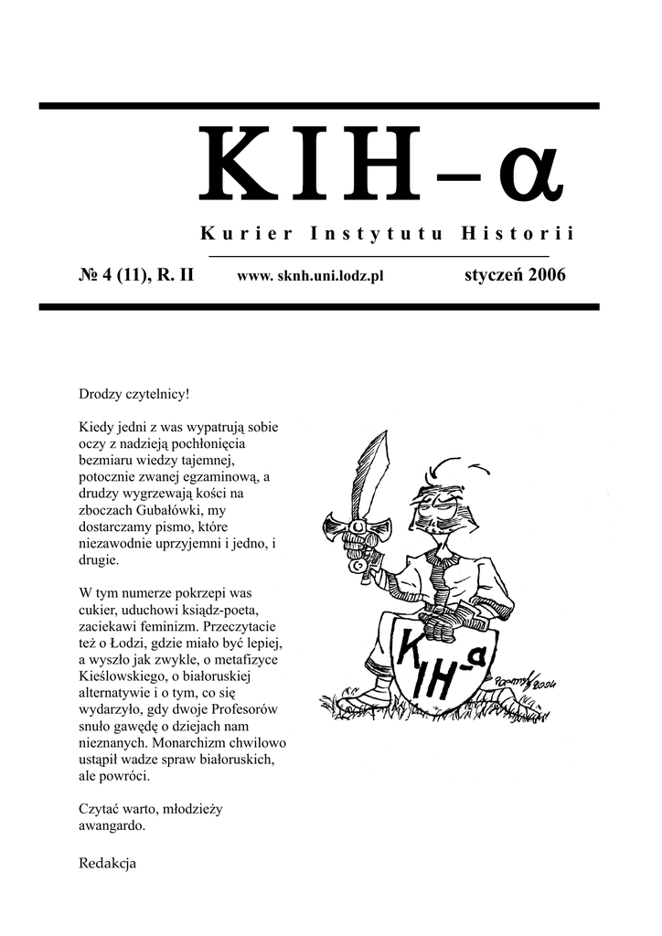 ΚΙΗ−α Kurier Instytutu Historii № 4 (11), R. II www. sknh.uni.lodz.pl Drodzy czytelnicy! Kiedy jedni z was wypatrują sobie oczy z nadzieją pochłonięcia bezmiaru wiedzy tajemnej, potocznie zwanej egzaminową, a drudzy wygrzewają kości na zboczach Gubałówki, my dostarczamy pismo, które niezawodnie uprzyjemni i jedno, i drugie. W tym numerze pokrzepi was cukier, uduchowi ksiądz-poeta, zaciekawi feminizm. Przeczytacie też o Łodzi, gdzie miało być lepiej, a wyszło jak zwykle, o metafizyce Kieślowskiego, o białoruskiej alternatywie i o tym, co się wydarzyło, gdy dwoje Profesorów snuło gawędę o dziejach nam nieznanych. Monarchizm chwilowo ustąpił wadze spraw białoruskich, ale powróci. Czytać warto, młodzieży awangardo. Redakcja styczeń 2006 Łódzka Kiszka MITY ŻYJĄ DŁUŻEJ NIŻ RZECZYWISTOŚĆ: ŁÓDŹ 2000 Sylwester i Nowy Rok dawno za nami, nikt już o nich nie pamięta. Minęło pięć lat nowego wieku, nowego tysiąclecia nawet i nikt już tego nie rozpamiętuje. Tymczasem wizje roku 2000 przed tym, jak on sam wreszcie nastąpił, były przeróżne, małe i duże, szczęśliwe i tragiczne, sceptyczne i przede wszystkim, z natury rzeczy, futurystyczne. Niełatwo (i dobrze) zapomnieć irracjonalne przeczucia nadchodzącego przełomu, które rozpalane były przez krążące od czasu do czasu, zwłaszcza w dwóch ostatnich dekadach, tajemnicze kasety video z przepowiedniami amerykańskich współczesnych wcieleń Nostradamusa... i tym podobnych profetycznych ciekawostek, które w przyszłości posłużą jako źródło historyczne do badań nad przedmilenijnymi zachowaniami ludzkości. Tymczasem zmierzając do sedna zacytuję słowa z ciekawej książki: Wyobrażenia, poglądy, schematy i mity żyją znacznie dłużej niż warunki, które je zrodziły Tę głęboką myśl odnajdziemy właśnie w jednej z wybiegających w przyszłość pozycji, noszącej jednak znamiona rozprawy naukowej, mianowicie wizji Lucjusza Włodkowskiego, dziennikarza, redaktora "Głosu Robotniczego" i "Odgłosów", który zadał sobie pytania: Jaka będzie Łódź za 25 lat? Jaka będzie na początku XXI wieku? Prorokować zazwyczaj jest trudno, ale za to bardzo łatwo o pomyłki, zwłaszcza jeśli nie przewidzi się poważnych zmian ustrojowych, które mogą położyć całkowity cień na projektach planistów, z których wiedzy, jak sądzę, korzystał autor. Niech mi będzie wolno na samym początku wspomnieć (i to z nieuzasadnionej tęsknoty tylko) o jednej pięknej wizji miejskich prognostyków, którzy słusznie przewidywali, iż w przyszłości rozwój przestrzenny miasta, wydłużenie się odległości między miejscem zamieszkania a miejscem pracy spowodują, że mimo rozwoju motoryzacji, rosnąć będzie zainteresowanie innymi formami komunikacji. Dlatego będziemy zostawiać samochód na parkingu, by się przesiąść do autobusu lub...metra. Planiści przewidywali funkcjonowanie już w latach 90. trzech linii metra w Łodzi, w tym jedna miałaby prowadzić z Teofilowa na Dąbrowę, zaś druga z Pabianic na Retkinię. Zwłaszcza ta druga trasa zastanawia dziś mieszkańca Łodzi, acz cieszy, oczywiście, zaocznie. Zachęcam do lektury tej ciekawej, głównie z powodu upływu czasu, książki. W następnej Kiszce jeszcze jedno z wrażeń powstałych pod jej wpływem. Lidia Jurek [email protected] Polska ≈ Україна Korzystając z fragmentu pod tekstem chciałabym rozesłać wici. Na kwiecień planowane jest spotkanie, mające na celu pogłębić naszą wiedzę na temat Ukrainy. Zajmiemy się historią stosunków polsko-ukraińskich na przestrzeni wieków. Zagadnienie wydaje się bardzo złożone i niepozbawione emocji. My chcielibyśmy wywołać zwłaszcza te pozytywne, wnoszące coś istotnego i budujące. Jeśli jesteście zainteresowani tą tematyką, jeśli z zaciekawieniem sięgacie w księgarni po książkę o Ukrainie (nawet jeśli nie kupujecie), zapraszam do udziału w spotkaniu z zagranicznymi gośćmi. Zainteresowani współpracą mogą kierować pytania do: [email protected]. 2 Dobra klasyka nie jest zła: „- Dlaczego dwie? - Bo podczas przedstawienia niszczą się i brudzą.” Dnia 6 października 1991 r. na ekrany polskich kin wszedł pierwszy z tzw. francuskich filmów Krzysztofa Kieślowskiego, reżysera znanego z Dekalogu Amatora, Blizny, czy Przypadku. Na Festiwalu Filmowym w Cannes odniósł on niebywały sukces, odnotowując bardzo wysoką frekwencję i będąc przez pewien czas poważnym kandydatem do Złotej Palmy. Bardzo mylący jednak był opis filmu w programie tejże uroczystości. Według pewnego krytyka La double vie de Véronique było prawdziwą i poruszającą love story. To opowieść o życiu, które kończy się, aby znaleźć dalszy ciąg w innym ciele i duszy. Otóż jest to nic innego jak chwyt marketingowy. Historia opowiedziana przez Kieślowskiego dotyka w istocie problemów iście egzystencjalnych, naszej odpowiedzialności za podejmowane decyzje, problemu samotności. Stawia tezę, że nie można umrzeć do końca, że świadomość wykracza poza to, co racjonalne, doświadczalne sensualnie. Zacznijmy jednak tak, jak rozpoczął swą opowieść jeden z bohaterów – Alexandre Fabbri, grany przez Philippe’a Voltera: W dwóch różnych krajach, na dwóch różnych kontynentach. Tego samego dnia, o tej samej porze przyszły na świat dwie dziewczynki. Tak jest w istocie; w Polsce i we Francji rodzą się dziewczynki, które otrzymują to samo imię, tak samo wyglądają, mają te same zdolności. Ciężko jest opisywać fabułę tego filmu, gdyż jakby tego nie zrobić, pozostanie to tylko trywialny, nieudolny zapis, który nigdy nie przybliży się do tego fenomenu, jakim jest wspomniany obraz. Najkrócej rzecz biorąc jest to historia dwóch kobiet, które nic o sobie nie wiedząc wyciągają wnioski z postępowania tej drugiej. Ściślej rzecz ujmując to ta druga, Francuzka, bo Polka często jest zagubiona, nie 