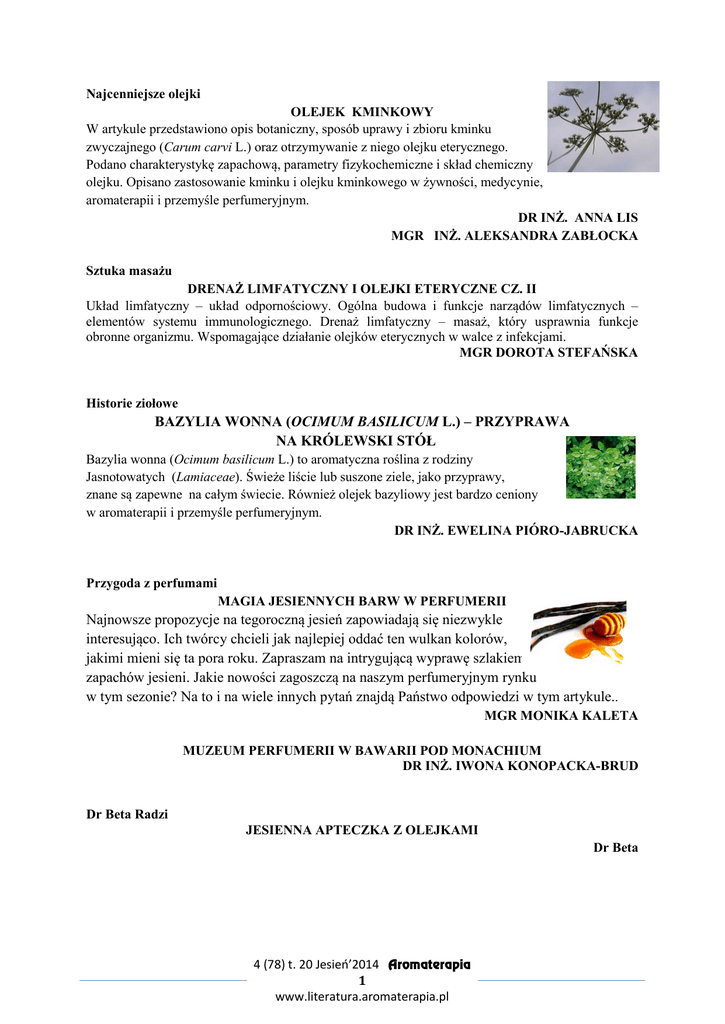 Najcenniejsze olejki OLEJEK KMINKOWY W artykule przedstawiono opis botaniczny, sposób uprawy i zbioru kminku zwyczajnego (Carum carvi L.) oraz otrzymywanie z niego olejku eterycznego. Podano charakterystykę zapachową, parametry fizykochemiczne i skład chemiczny olejku. Opisano zastosowanie kminku i olejku kminkowego w żywności, medycynie, aromaterapii i przemyśle perfumeryjnym. DR INŻ. ANNA LIS MGR INŻ. ALEKSANDRA ZABŁOCKA Sztuka masażu DRENAŻ LIMFATYCZNY I OLEJKI ETERYCZNE CZ. II Układ limfatyczny – układ odpornościowy. Ogólna budowa i funkcje narządów limfatycznych – elementów systemu immunologicznego. Drenaż limfatyczny – masaż, który usprawnia funkcje obronne organizmu. Wspomagające działanie olejków eterycznych w walce z infekcjami. MGR DOROTA STEFAŃSKA Historie ziołowe BAZYLIA WONNA (OCIMUM BASILICUM L.) – PRZYPRAWA NA KRÓLEWSKI STÓŁ Bazylia wonna (Ocimum basilicum L.) to aromatyczna roślina z rodziny Jasnotowatych (Lamiaceae). Świeże liście lub suszone ziele, jako przyprawy, znane są zapewne na całym świecie. Również olejek bazyliowy jest bardzo ceniony w aromaterapii i przemyśle perfumeryjnym. DR INŻ. EWELINA PIÓRO-JABRUCKA Przygoda z perfumami MAGIA JESIENNYCH BARW W PERFUMERII Najnowsze propozycje na tegoroczną jesień zapowiadają się niezwykle interesująco. Ich twórcy chcieli jak najlepiej oddać ten wulkan kolorów, jakimi mieni się ta pora roku. Zapraszam na intrygującą wyprawę szlakiem zapachów jesieni. Jakie nowości zagoszczą na naszym perfumeryjnym rynku w tym sezonie? Na to i na wiele innych pytań znajdą Państwo odpowiedzi w tym artykule.. MGR MONIKA KALETA MUZEUM PERFUMERII W BAWARII POD MONACHIUM DR INŻ. IWONA KONOPACKA-BRUD Dr Beta Radzi JESIENNA APTECZKA Z OLEJKAMI Dr Beta 4 (78) t. 20 Jesień’2014 Aromaterapia 1 www.literatura.aromaterapia.pl Most valuable essentials oils CARAWAY OIL A review. Essential oil from caraway (Carum carvi) is presented. Production, physicochemical data, chemical composition and application of the oil in food, medicine, aromatherapy and perfumery are described. DR ANNA LIS M.SC ALEKSANDRA ZABŁOCKA Art of massage LYMPHATIC DRAINAGE AND ESSENTIAL OILS PART II Lymphatic system - the immune system. The general structure and functions of the lymphatic organs components of the immune system. Lymphatic drainage - massage, which improves the functions of the body's defense. Supporting activity of essential oils in the fight against infections is described. M. SC DOROTA STEFAŃSKA Herbal stories SWEET BASIL (OCIMUM BASILICUM L.) – SPICE TO THE ROYAL TABLE Sweet basil (Ocimum basilicum L.) is aromatic plant of the Lamiaceae family. The fresh leaves or dried herb, as spices are known throughout the world for centuries. The basil essential oil is highly valued in aromatherapy and perfumery too. DR EWELINA PIÓRO-JABRUCKA Adventure of perfume MAGIC COLORS OF AUTUMN IN PERFUMERY The latest propositions on this autumn promise to be extremely interesting. Their creators wanted to describe the volcano of colors, typical for this time of year. Welcome to the intriguing tour of the scents of autumn. Which new perfumes will appear on the market this season? In the article you will find an answer to this and many other questions. MONIKA KALETA M. SC MUSEUM OF PERFUMERY IN BAVARIA, MUNICH DR IWONA KONOPACKA-BRUD Dr Beta advises AUTUMN KIT WITH ESSENTIAL OILS 4 (78) t. 20 Jesień’2014 Aromaterapia 2 www.literatura.aromaterapia.pl Dr Beta Radzi JESIENNA APTECZKA Z OLEJKAMI A kiedy przyjdzie jesień – Zatulamy się w koc, By nam cieplutko było Cały dzień, całą noc. M. K. Dąbrowski, Romantica, wyd. PRIMUM s.c. , 2009 Ten fragment z wiersza pt. „Pory Roku” poety Macieja Krzysztofa Dąbrowskiego doskonale oddaje nastrój i temperaturę nadchodzącej wielkimi krokami jesieni. Najczęściej deszczowe i pochmurne dni, z rzadka przeplatane słonecznymi i ciepłymi, powodują pogorszenie samopoczucia, często przynoszą smutek i spadek nastroju. W aromaterapii zalecane są olejki poprawiające nastrój, zapobiegające depresyjnym myślom i złemu samopoczuciu. Warto więc w jesiennej apteczce zgromadzić zapas olejków: drzewa różanego, limetkowego, grejpfrutowego, i przygotować mieszankę przeciwdepresyjną: Mixtura Dr Beta D-3: olejek drzewa różanego 4 krople olejek limetkowy 3 krople olejek grejpfrutowy 3 krople i stosować ją w kominku aromaterapeutycznym do wdychania raz dziennie. 4 (78) t. 20 Jesień’2014 Aromaterapia 3 www.literatura.aromaterapia.pl Jesienna, zmienna aura sprzyja też częstym infekcjom dróg oddechowych – katar, kaszel i ból gardła nękają nas często, pogarszają jakość życia, powodują osłabienie, zniechęcenie, no i niekiedy przymusowe przerwy w pracy i w codziennych obowiązkach. Lepiej więc zapobiegać infekcjom, wzmacniać system odpornościowy, stosując specjalnie wybrane olejki eteryczne przeciwdziałające przeziębieniom. Do nawaniania pomieszczeń z kominka aromaterapeutycznego najlepiej wybrać olejki: drzewa herbacianego i lawendowy, które mają silne właściwości przeciwbakteryjne, zapobiegają infekcjom i dezynfekują powietrze. Warto też w apteczce trzymać zapas olejków: eukaliptusowego, mięty pieprzowej i anyżowego. Poniżej Mieszanka na przeziębienie: Mixtura Dr Beta D-2: olejek drzewa herbacianego 3 krople olejek eukaliptusowy 3 krople olejek mięty pieprzowej 2 krople olejek anyżowy 2 krople Można ją stosować w przypadku infekcji do inhalacji oraz do nacierania klatki piersiowej codziennie wieczorem, jeżeli rozcieńczymy 3 krople tej mieszanki w łyżeczce oleju z nasion winogron. Więcej informacji znajdziecie Państwo wewnątrz numeru kwartalnika Aromaterapia Nr 4 (78) t. 20 Jesień’2014 Dr Beta 4 (78) t. 20 Jesień’2014 Aromaterapia 4 www.literatura.aromaterapia.pl Informacja dla autorów Do publikacji w kwartalniku Polskiego Towarzystwa Aromaterapeutycznego przyjmowane są artykuły: oryginalne, poglądo