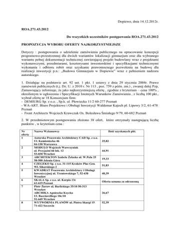 Dopiewo, dnia 14.12.2012r. ROA.271.43.2012 Do wszystkich uczestników postępowania ROA.271.43.2012 PROPOZYCJA WYBORU OFERTY NAJKORZYSTNIEJSZE Dotyczy : postępowania o udzielenie zamówienia publicznego na opracowanie koncepcji programowo-przestrzennej dla dwóch wariantów lokalizacji gimnazjum oraz dla wybranego wariantu pełnej dokumentacji technicznej zawierającej projekt budowlany wraz z projektami wykonawczymi, przedmiarami, kosztorysami inwestorskimi i specyfikacjami technicznymi wykonania i odbioru robót oraz uzyskanie prawomocnego pozwolenia na budowę dla realizacji inwestycji p.n.: „Budowa Gimnazjum w Dopiewie” wraz z pełnieniem nadzoru autorskiego. 1. Działając na podstawie art. 92 ust. 1 pkt. 1 ustawy z dnia 29 stycznia 2004r. Prawo zamówień publicznych (t.j. Dz. U. z 2010 r. Nr 113 , poz. 759 z późn. zm.) , zwanej dalej Pzp, Zamawiający informuje, że jako najkorzystniejszą ofertę , zgodnie z kryterium – cena 100% , określonym w ogłoszeniu i Specyfikacji Istotnych Warunków Zamówienia , z liczbą 100 pkt., wybrał ofertę nr 18 Konsorcjum firm: - DEMIURG Sp. z o.o. , Sp.k. ul. Płowiecka 11/2 60-277 Poznań - WA-ART. Biuro Projektowe i Obsługi Inwestycji Waldemar Kajoch pl. Lipowy 3/2, 61-478 Poznań - Front Architects Wojciech Krawczuk Os. Bolesława Śmiałego 9/79, 60-682 Poznań 2. W przedmiotowym postępowaniu złożono 38 ofert, które otrzymały następującą liczbę punktów , w kryterium cena : Nr oferty 1 2 3 4 5 6 7 8 Nazwa Wykonawcy Autorska Pracownia Architektury CAD Sp. z o.o. Ul. Kamieniecka 46 04-158 Warszawa MODULO Wojciech Wawrzyniak ul. Przyjaźni 66 lok. 12 53-030 Wrocław ARCHITEKTON Izabela Żelasko ul. W.Pola 25 58-500 Jelenia Góra CZEGEKO Sp. z o.o. 31-115 Kraków Plac Gen. Wł. Sikorskiego 2 KWADRAT Pracownia Architektury i Obsługi Inwestycyjnej ul. Trentowskiego 7, 52-430 Wrocław SKALA Sp. z o.o. ul. Karpia 13c 61-619 Poznań Piotr Żuraw ul. Barlickiego 35/10 50-313 Wrocław ARCHIKA Agnieszka Ksycka Ul. Bacciarelliego 10c/10 51-649 Wrocław WYTWÓRNIA PLANÓW ul. Piotra Skargi 15 71-422 Szczecin Ilość uzyskanych pkt. 25,82 44,91 19,33 51,83 40,39 Oferta uznana za odrzuconą 26,67 52,39 9 10 11 12 13 14 15 16 17 18 19 20 21 22 23 24 25 26 27 28 L-Concept Leszek Karasiński ul. Rumiankowa 57B/1 54-512 Wrocław SMART Architekci Szymon Mazurek ul. Milicka 68 51-126 Wrocław Studio IN s.c. Lilianna Śliwowska & Dariusz Dymarek ul. Parkowa 42/1 51-616 Wrocław IRENA WĄCIOR Aleja Róż 6, 57-320 Polanica Zdrój Pracownia projektowa ABP Studio Architekt Bartosz Prokop os. Centrum A4/22 31-923 Kraków Pracownia Architektoniczna Piotr Dominiczak & Mariusz Szczuraszek ul. Waryńskiego 21/2 63-400 Ostów Wlkp. MP STUDIO PROJEKT ul. Żeromskiego 24j, 10355 Olsztyn Pracownia Architektoniczna VOWIE STUDIO PLUS al. Jana Pawła II 20 64-500 Szamotuły OVO Grąbczewscy Architekci Oskar Grąbczewski ul. Małopolska 2/4 40-737 Katowice Art. Projekt Grzegorz Gułowski ul. L. Krzywickiego 1/14 07-410 Ostrołeka 1. DEMIURG Sp. z o.o. , Sp.k. ul. Płowiecka 11/2 60-277 Poznań 2. WA-ART. Biuro Projektowe i Obsługi Inwestycji Waldemar Kajoch pl. Lipowy 3/2, 61478 Poznań 3. Front Architects Wojciech Krawczuk Os. Bolesława Śmiałego 9/79 60-682 Poznań Architektoniczna Pracownia Autorska ul. Zakole 19/2, 75-763 Koszalin ARCHITEKT Radosław Guzowski ul. Świętojerska 5/7, 00-236 Warszawa MD Polska Sp. z o.o. ul. Królowej Korony Polskiej 24, 70-486 Szczecin Biuro Projektów Organizacji i zaopatrzenia Inwestycji TECHPLAN Żychlin k/Konina ul. Wrzosowa 14 62-571 Stare Miasto Wandachowicz-Kashyna Architekci Spółka Partnerska ul. Rynek 18/2 62-020 Swarzędz LOCUM M. Paszyn Sp. komandytowa Ul. Lipowa 33, 62-800 Kalisz Mazowieckie Biuro projektów MAPRO Sp. z o.o. ul. Dworcowa 2, 09-402 Płock Zakład Usług Technicznych Architekt Wanda Grodzka Ul. Oliwska 21/23, IVp. Pok. 7 80-563 Gdańsk C+HOOAR Aleksandra Machnicka Paweł Machnicki s.c. Ul. Narutowicza 14B/11 70-240 Szczecin Przedsiębiorstwo projektowo-Usługowe PROJEKO Sp. z o.o. ul. Okrzei 18 64-920 Piła Oferta uznana za odrzuconą Oferta uznana za odrzuconą 37,85 30,75 31,09 Oferta uznana za odrzuconą 49,86 36,15 35,79 100 18,38 41,31 15,77 72,30 22,59 60,76 47,10 44,55 22,13 30,77 29 30 31 32 AC Studio Jacek Sołgała, Jarosław Romański ul. Opolska 114 C, 61-450 Poznań INTECH Sp. z o.o. ul. Kościańska 39 60-112 Poznań STUDIO M Ul. Królowej Jadwigi 48/2 61-872 Poznań Mariusz Gramowski Pracownia Projektowa Ul. J. Ostroroga 2/1 60-349 Poznań 55,62 16,86 16,27 22,53 33 NORTHLIGHT pracownia Krzysztof Pocałujko Ul. Urocza 6/24 11-400 Kętrzyn Pracownia Architektoniczna Paweł Gacek Ul. Literacka 185 Poznań 34 35 36 37 38 Spółka Projektowania Architektonicznego Sadowski Sadowska Sp. z o.o. Sp.k. Ul. Podlaska 13 60-623 Poznań Autorska Agencja projektowa ul. Dembińskiego 14 64-100 Leszno AB-BUDPOL Przedsiębiorstwo Wdrożeniowe Sp. z o.o. ul. Podchorążych 11 60-143 Poznań MATYJA I RITTER Architekt i Inżynier Budownictwa Społka partnerska ul. Wieruszowska 12/16 nr lok. 203 60-166 Poznań PL. Architekci ul. Długosza 13/12 60-559 Poznań 18,19 44,58 34,34 26,16 Oferta uznana za odrzuconą 42,50