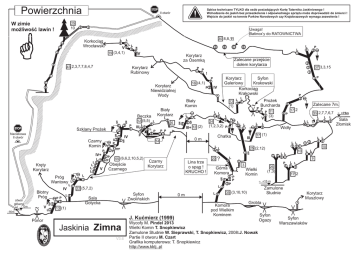 Powierzchnia Szkice techniczne TYLKO dla osób posiadających Kartę Taternika Jaskiniowego ! Wchodzenie do jaskiń bez przeszkolenia i odpowiedniego sprzętu może doprowadzić do śmierci ! Wejście do jaskiń na terenie Parków Narodowych czy Krajobrazowych wymaga zezwolenia ! II otwór 25 W zimie możliwość lawin ! 10 Uwaga! Batinox’y do RATOWNICTWA L Korkociąg Wrocławski 30 8,8,11 L LL V 19 (3,4,1) L S IV 43 2,3,7,7,8,4,7 Korytarz za Ósemką Korytarz Rubinowy P Zalecane przejście dołem korytarza ! Korytarz Syfon Galeriowy Krakowski Korkociąg Krakowski 16 (4,1) Korytarz Niewidzialnej Wody IV P Biały Komin Biały Korytarz Beczka Szklany Prożek Naciekowa II otwór Czarny Komin S L P P L L L L L Kręty Korytarz Próg Wantowy otwór główny Błotny Próg IV PP L S 0m V -16m L L V III L L P IV+ P IV 6 L P S P P P III+ 12 (2) (1,2,3,2) P III LL Obejście Czarnego Czarny Korytarz Lina trze o spąg ! KRUCHO ! L 20 ? L 13 (1) J. Kućmierz (1999) Ponor Jaskinia Zimna V3.6 L L LL L L Widły 17 (1) L L 10 0m L 10 L L L L L 9 P 3 Górna Komora 22 (5,7,2) Sala Gotycka 35 2,7,7,6,7 P 25 (2,12) P P S Syfon Zwolińskich 17 2 (3) S 55 (6,6,2,10,5,2) Zalecane 7m. P P 11 V L L L Chatka L L P P L P L L P P P P 24 S P Prożek Burcharda L L 0m 14 S 12 L L (1) L L L L 12 (5,5) L S 37 3,3,15 P P S P L 26 Wielki Komin (1,3) 17 2 ~ +15 m P Zamulone Studnie 35 (3,10,10) Komora pod Wielkim Kominem L L Grobla Wycofy M. Pindel 2013 Wielki Komin T. Snopkiewicz Zamulone Studnie W. Sieprawski, T. Snopkiewicz, 2008:J. Nowak Partie II otworu M. Czart Grafika komputerowa: T. Snopkiewicz http://www.kktj..pl Syfon Ogazy Korytarz Muszlowy Syfon Warszawiaków L ~ +75m Sala Złomisk