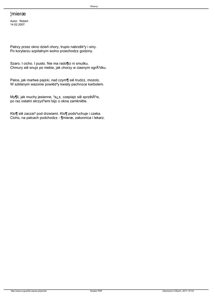 Witamy! ¦mieræ Autor: Robert 14.02.2007. Patrzy przez okno dzieñ chory, trupio nabrzêk³y i siny. Po korytarzu szpitalnym wolno przechodz± godziny. Szaro. I cicho. I pusto. Nie ma rado¶ci ni smutku. Chmury siê snuj± po niebie, jak chorzy w ciasnym ogródku. Palce, jak martwe paj±ki, nad czym¶ siê trudz±, mozol±. W szklanym wazonie powiêd³y kwiaty pachn±ce karbolem. My¶li, jak muchy jesienne, ³a¿±, czepiaj± siê sprzêtów, po raz ostatni skrzyd³ami bij± o okna zamkniête. Kto¶ siê zaczai³ pod drzwiami. Kto¶ pods³uchuje i czeka. Cicho, na palcach podchodz± - ¶mieræ, zakonnica i lekarz. http://www.e-guerilla.nazwa.pl/joomla Kreator PDF Utworzono 4 March, 2017, 07:53