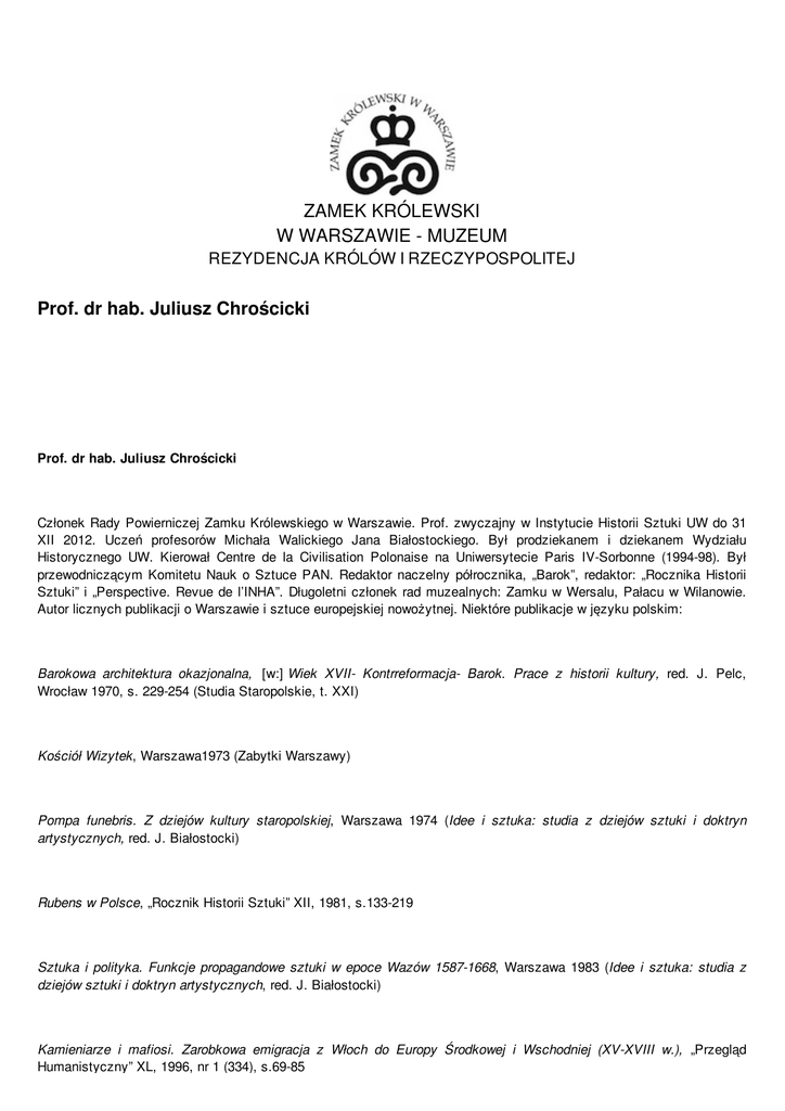 ZAMEK KRÓLEWSKI W WARSZAWIE - MUZEUM REZYDENCJA KRÓLÓW I RZECZYPOSPOLITEJ Prof. dr hab. Juliusz Chrościcki Prof. dr hab. Juliusz Chrościcki Członek Rady Powierniczej Zamku Królewskiego w Warszawie. Prof. zwyczajny w Instytucie Historii Sztuki UW do 31 XII 2012. Uczeń profesorów Michała Walickiego Jana Białostockiego. Był prodziekanem i dziekanem Wydziału Historycznego UW. Kierował Centre de la Civilisation Polonaise na Uniwersytecie Paris IV-Sorbonne (1994-98). Był przewodniczącym Komitetu Nauk o Sztuce PAN. Redaktor naczelny półrocznika, „Barok”, redaktor: „Rocznika Historii Sztuki” i „Perspective. Revue de l’INHA”. Długoletni członek rad muzealnych: Zamku w Wersalu, Pałacu w Wilanowie. Autor licznych publikacji o Warszawie i sztuce europejskiej nowożytnej. Niektóre publikacje w języku polskim: Barokowa architektura okazjonalna, [w:] Wiek XVII- Kontrreformacja- Barok. Prace z historii kultury, red. J. Pelc, Wrocław 1970, s. 229-254 (Studia Staropolskie, t. XXI) Kościół Wizytek, Warszawa1973 (Zabytki Warszawy) Pompa funebris. Z dziejów kultury staropolskiej, Warszawa 1974 (Idee i sztuka: studia z dziejów sztuki i doktryn artystycznych, red. J. Białostocki) Rubens w Polsce, „Rocznik Historii Sztuki” XII, 1981, s.133-219 Sztuka i polityka. Funkcje propagandowe sztuki w epoce Wazów 1587-1668, Warszawa 1983 (Idee i sztuka: studia z dziejów sztuki i doktryn artystycznych, red. J. Białostocki) Kamieniarze i mafiosi. Zarobkowa emigracja z Włoch do Europy Środkowej i Wschodniej (XV-XVIII w.), „Przegląd Humanistyczny” XL, 1996, nr 1 (334), s.69-85 Humanistyczny” XL, 1996, nr 1 (334), s.69-85 O sztuce flamandzkiej w badaniach Jana Białostockiego, [w:] Ars longa. Prace dedykowane pamięci Profesora Jana Białostockiego, materiały sesji SHS (Warszawa, listopad 1998 ), Warszawa 1999, s.33-52 Malarskie i graficzne wizerunki pola elekcyjnego; O propagandowo-symbolicznych przedstawieniach pola elekcyjnego na Woli, [w:] Wolne elekcje królów Polski na warszawskiej Woli 430 lat później. Materiały z sesji popularno–naukowej zorganizowanej 17 IV 2007, Wstępem opatrzył i podał do druku B. Komorowski, Warszawa 2010, s. 27-40, 82-108 Georges de La Tour i jego lwowskie arcydzieło znane pod tytułem Płacenie podatków, „Barok. Historia-LiteraturaSztuka”, XVII, 2010, nr 1 (33), s. 123-142 Zamek Królewski w Warszawie - Muzeum. Rezydencja Królów i Rzeczypospolitej www.zamek-krolewski.pl