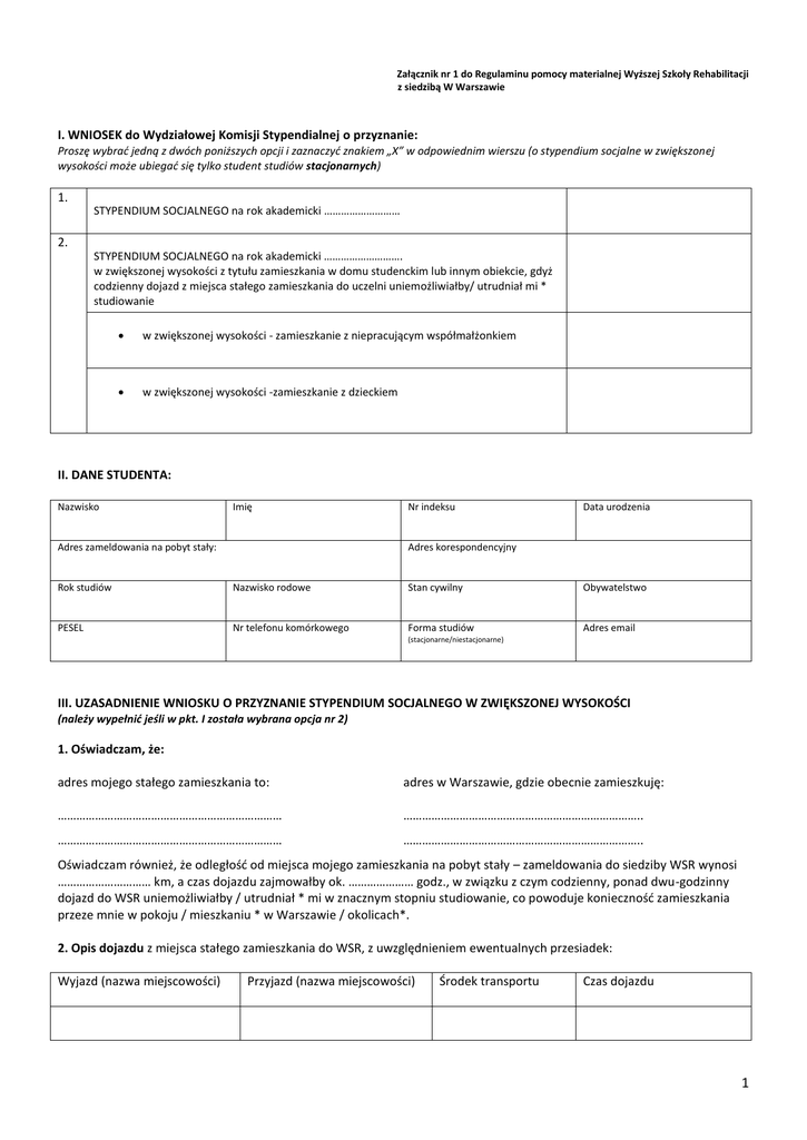 Załącznik nr 1 do Regulaminu pomocy materialnej Wyższej Szkoły Rehabilitacji z siedzibą W Warszawie I. WNIOSEK do Wydziałowej Komisji Stypendialnej o przyznanie: Proszę wybrać jedną z dwóch poniższych opcji i zaznaczyć znakiem „X” w odpowiednim wierszu (o stypendium socjalne w zwiększonej wysokości może ubiegać się tylko student studiów stacjonarnych) 1. STYPENDIUM SOCJALNEGO na rok akademicki ……………………… 2. STYPENDIUM SOCJALNEGO na rok akademicki ………………………. w zwiększonej wysokości z tytułu zamieszkania w domu studenckim lub innym obiekcie, gdyż codzienny dojazd z miejsca stałego zamieszkania do uczelni uniemożliwiałby/ utrudniał mi * studiowanie w zwiększonej wysokości - zamieszkanie z niepracującym współmałżonkiem w zwiększonej wysokości -zamieszkanie z dzieckiem II. DANE STUDENTA: Nazwisko Imię Adres zameldowania na pobyt stały: Nr indeksu Data urodzenia Adres korespondencyjny Rok studiów Nazwisko rodowe Stan cywilny Obywatelstwo PESEL Nr telefonu komórkowego Forma studiów Adres email (stacjonarne/niestacjonarne) III. UZASADNIENIE WNIOSKU O PRZYZNANIE STYPENDIUM SOCJALNEGO W ZWIĘKSZONEJ WYSOKOŚCI (należy wypełnić jeśli w pkt. I została wybrana opcja nr 2) 1. Oświadczam, że: adres mojego stałego zamieszkania to: adres w Warszawie, gdzie obecnie zamieszkuję: ……………………………………………………………… ………………………………………………………………….. ……………………………………………………………… ………………………………………………………………….. Oświadczam również, że odległość od miejsca mojego zamieszkania na pobyt stały – zameldowania do siedziby WSR wynosi ………………………… km, a czas dojazdu zajmowałby ok. ………………… godz., w związku z czym codzienny, ponad dwu-godzinny dojazd do WSR uniemożliwiałby / utrudniał * mi w znacznym stopniu studiowanie, co powoduje konieczność zamieszkania przeze mnie w pokoju / mieszkaniu * w Warszawie / okolicach*. 2. Opis dojazdu z miejsca stałego zamieszkania do WSR, z uwzględnieniem ewentualnych przesiadek: Wyjazd (nazwa miejscowości) Przyjazd (nazwa miejscowości) Środek transportu Czas dojazdu 1 Czas dojazdu razem * niepotrzebne skreślić 2 IV. OŚWIACZENIE STUDENTA ORAZ CZŁONKÓW JEGO RODZINY DOTYCZĄCE DOCHODÓW Z ROKU …………………. l.p. Członkowie rodziny studenta IMIĘ I NAZWISKO Stopień pokrewieństwa i wiek (dot. tylko dzieci i rodzeństwo) student SUMA DOCHODÓW NETTO X 1 1. Dochód (brutto) 2. Składki na ubezpieczenia społeczne, wg zaświadczenia z US 3. Składki na ubezpieczenie zdrowotne, wg zaświadczenia z ZUS 4. Podatek należny, wg zaświadczenia z US X X X 5. Dochód po odliczeniach – netto (od poz. 1 odjąć poz. 2, 3 i 4) 6. Dochody opodatkowane zryczałtowanym podatkiem dochodowym ZAŁĄCZNIK nr 1A 7. Dochody niepodlegające opodatkowaniu ZAŁĄCZNIK nr 1B 8. Alimenty przekazane przez danego członka rodziny na rzecz osoby spoza rodziny 9. Dochody netto razem (zsumować poz.5,6 i 7, odjąć poz.8) 2 3 4 5 X 10. ………………. MIESIĘCZNY DOCHÓD NETTO NA OSOBĘ W RODZINIE STUDENTA W ROKU ……………….: 11. Suma dochodów netto całej rodziny (przepisać kwotę z pole nr 10 – podsumowanie kolumny 9): = ……………………………………zł. …………………… gr. 12. Miesięczny dochód całej rodziny – kwota z pola nr 11 podzielona na 12 miesięcy: = ……………………………………….zł ……………………………gr. 13. Miesięczny dochód na osobę – kwota z pola nr 12 podzielona przez liczbę ww. osób w rodzinie: = ………………………………..zł …………………….. gr. MIESIĘCZNY DOCHÓD NETTO NA OSOBĘ W RODZINIE STUDENTA PO UWZGLĘDNIENIU DOCHODU UTRACONEGO I UZYSKANEGO: 14. Zsumowana miesięczna kwota tzw. „dochodu utraconego” w rodzinie: = ……………………………………………..zł ………………………………….gr. 15. Zsumowana miesięczna kwota tzw. „dochodu uzyskanego” w rodzinie : = …………………………………………..zł ………………………………………….gr. 16. Miesięczny dochód całej rodziny po uwzględnieniu dochodu utraconego i uzyskanego (kwota z pola nr 12 minus kwota z pola nr 14 plus kwota z pola nr 15): 17. Miesięczny dochód na osobę po uwzględnieniu doch. utraconego i uzyskanego – kwota z pola nr 16 podzielona przez liczbę ww. osób w rodzinie: = ………………………………………………..zł ………………………………….gr. = ………………………………………….zł …………………………………………..gr. …………………………………………………………………………………………. data i podpis studenta 3 V. OŚWIADCZENIA STUDENTA ORAZ INFORMACJE O SYTUACJI RODZINY Oświadczam, że wszystkie informacje podane we wniosku są zgodne z prawdą. Ponad to oświadczam, że : (proszę wpisać przy każdym oświadczeniu TAK, jeśli dane stwierdzenie jest prawdą lub NIE, jeśli dane stwierdzenie nie jest prawdą) TAK NIE 1. Jestem studentem samodzielnym finansowo i nie prowadzę gospodarstwa domowego z rodzicami, w związku z czym nie przedstawiam dochodów ich i rodzeństwa. Jeśli student zaznaczy TAK musi dołączyć dokumenty potwierdzające jego samodzielność finansową jeśli student nie udowadnia samodzielności finansowej i przedstawia we wniosku także dochody swoich rodziców i rodzeństwa – zaznacza NIE W przypadku zaznaczenia TAK proszę zaznaczyć z jakiego tytułu wynika samodzielność finansowa : ukończył 26. rok życia, pozostaje w związku małżeńskim, ma na utrzymaniu dzieci, o których mowa w art. 179 ust. 4 pkt 2, 2. Jestem świadomy, że stypendium socjalne mogę pobierać tylko na jednym kierunku studiów, jeśli 