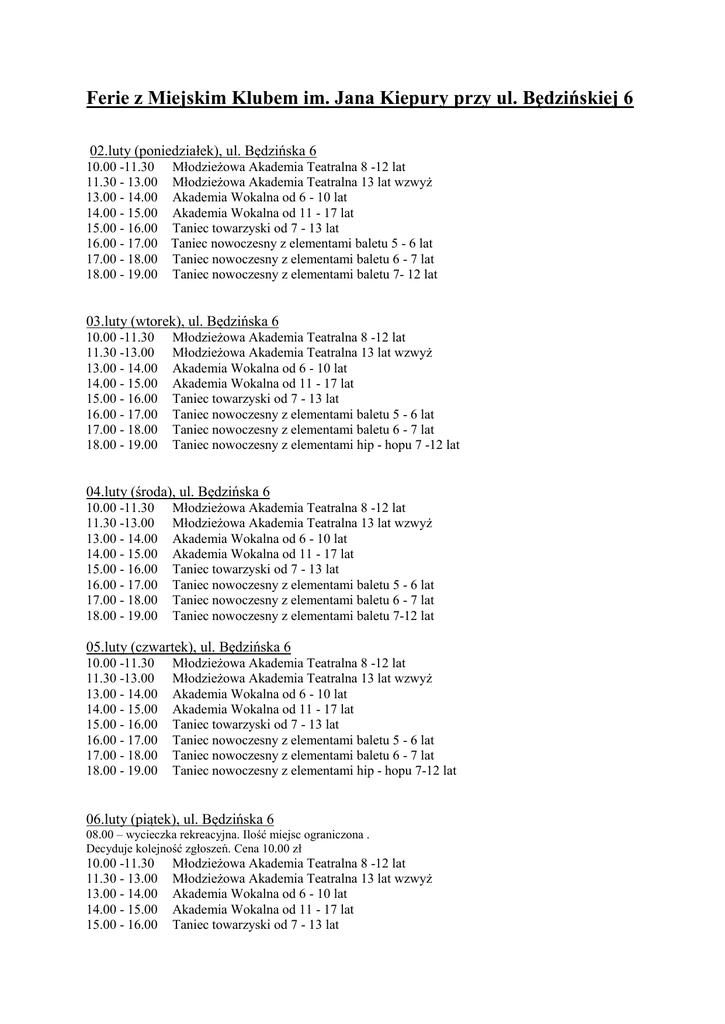 Ferie z Miejskim Klubem im. Jana Kiepury przy ul. Będzińskiej 6 02.luty (poniedziałek), ul. Będzińska 6 10.00 -11.30 11.30 - 13.00 13.00 - 14.00 14.00 - 15.00 15.00 - 16.00 16.00 - 17.00 17.00 - 18.00 18.00 - 19.00 Młodzieżowa Akademia Teatralna 8 -12 lat Młodzieżowa Akademia Teatralna 13 lat wzwyż Akademia Wokalna od 6 - 10 lat Akademia Wokalna od 11 - 17 lat Taniec towarzyski od 7 - 13 lat Taniec nowoczesny z elementami baletu 5 - 6 lat Taniec nowoczesny z elementami baletu 6 - 7 lat Taniec nowoczesny z elementami baletu 7- 12 lat 03.luty (wtorek), ul. Będzińska 6 10.00 -11.30 11.30 -13.00 13.00 - 14.00 14.00 - 15.00 15.00 - 16.00 16.00 - 17.00 17.00 - 18.00 18.00 - 19.00 Młodzieżowa Akademia Teatralna 8 -12 lat Młodzieżowa Akademia Teatralna 13 lat wzwyż Akademia Wokalna od 6 - 10 lat Akademia Wokalna od 11 - 17 lat Taniec towarzyski od 7 - 13 lat Taniec nowoczesny z elementami baletu 5 - 6 lat Taniec nowoczesny z elementami baletu 6 - 7 lat Taniec nowoczesny z elementami hip - hopu 7 -12 lat 04.luty (środa), ul. Będzińska 6 10.00 -11.30 11.30 -13.00 13.00 - 14.00 14.00 - 15.00 15.00 - 16.00 16.00 - 17.00 17.00 - 18.00 18.00 - 19.00 Młodzieżowa Akademia Teatralna 8 -12 lat Młodzieżowa Akademia Teatralna 13 lat wzwyż Akademia Wokalna od 6 - 10 lat Akademia Wokalna od 11 - 17 lat Taniec towarzyski od 7 - 13 lat Taniec nowoczesny z elementami baletu 5 - 6 lat Taniec nowoczesny z elementami baletu 6 - 7 lat Taniec nowoczesny z elementami baletu 7-12 lat 05.luty (czwartek), ul. Będzińska 6 10.00 -11.30 11.30 -13.00 13.00 - 14.00 14.00 - 15.00 15.00 - 16.00 16.00 - 17.00 17.00 - 18.00 18.00 - 19.00 Młodzieżowa Akademia Teatralna 8 -12 lat Młodzieżowa Akademia Teatralna 13 lat wzwyż Akademia Wokalna od 6 - 10 lat Akademia Wokalna od 11 - 17 lat Taniec towarzyski od 7 - 13 lat Taniec nowoczesny z elementami baletu 5 - 6 lat Taniec nowoczesny z elementami baletu 6 - 7 lat Taniec nowoczesny z elementami hip - hopu 7-12 lat 06.luty (piątek), ul. Będzińska 6 08.00 – wycieczka rekreacyjna. Ilość miejsc ograniczona . Decyduje kolejność zgłoszeń. Cena 10.00 zł 10.00 -11.30 11.30 - 13.00 13.00 - 14.00 14.00 - 15.00 15.00 - 16.00 Młodzieżowa Akademia Teatralna 8 -12 lat Młodzieżowa Akademia Teatralna 13 lat wzwyż Akademia Wokalna od 6 - 10 lat Akademia Wokalna od 11 - 17 lat Taniec towarzyski od 7 - 13 lat 16.00 - 17.00 17.00 - 18.00 18.00 - 19.00 Taniec nowoczesny z elementami baletu 5 - 6 lat Taniec nowoczesny z elementami baletu 6 - 7 lat Taniec nowoczesny z elementami baletu 7- 12 lat ____________________________________________________________________________- 09.luty (poniedziałek), ul. Będzińska 6 11.00 -12.00 12.00 -13.00 13.00 - 14.00 14.00 - 15.00 15.00 - 16.00 16.00 - 17.00 17.00 - 18.00 18.00 - 19.00 Disco Szkraby od 3 lat Rytmika dla smyka 2,5 - 6lat Taniec freestyle od 4 - 6 lat Taniec freestyle od 7 lat wzwyż Taniec towarzyski od 7 -13 lat Taniec nowoczesny z elementami baletu 5 - 6 lat Taniec nowoczesny z elementami baletu 6 - 7 lat Taniec nowoczesny z elementami baletu 7-12 lat 10.luty (wtorek), ul. Będzińska 6 11.00 -12.00 12.00 -13.00 13.00 - 14.00 14.00 - 15.00 15.00 - 16.00 16.00 - 17.00 17.00 - 18.00 18.00 - 19.00 Disco Szkraby od 3 lat Rytmika dla smyka 2,5 - 6lat Taniec freestyle od 4 – 6 lat Taniec freestyle od 7 lat wzwyż Taniec towarzyski od 7 -13 lat Taniec nowoczesny z elementami baletu 5 - 6 lat Taniec nowoczesny z elementami baletu 6 - 7 lat Taniec nowoczesny z elementami hip - hopu 7- 12 lat 11.luty (środa), ul. Będzińska 6 11.00 -12.00 12.00 -13.00 13.00 - 14.00 14.00 - 15.00 15.00 - 16.00 16.00 - 17.00 17.00 - 18.00 18.00 - 19.00 Disco Szkraby od 3 lat Rytmika dla smyka 2,5 - 6lat Taniec freestyle od 4 – 6 lat Taniec freestyle od 7 lat wzwyż Taniec towarzyski od 7 -13 lat Taniec nowoczesny z elementami baletu 5 - 6 lat Taniec nowoczesny z elementami baletu 6 - 7 lat Taniec nowoczesny z elementami baletu 7- 12 lat 12.luty (czwartek), ul. Będzińska 6 11.00 - 12.00 12.00 - 13.00 13.00 - 14.00 14.00 - 15.00 15.00 - 16.00 16.00 - 17.00 17.00 - 18.00 18.00 - 19.00 Disco Szkraby od 3 lat Rytmika dla smyka 2,5 – 6 lat Taniec freestyle od 4 – 6 lat Taniec freestyle od 7 lat wzwyż Taniec towarzyski od 7 -13 lat Taniec nowoczesny z elementami baletu 5 - 6 lat Taniec nowoczesny z elementami baletu 6 - 7 lat Taniec nowoczesny z elementami hip - hopu 7 - 12 lat 13.luty (piątek), ul. Będzińska 6 11.00 - 12.00 12.00 - 13.00 13.00 - 14.00 Disco Szkraby od 3 lat Rytmika dla smyka 2,5 - 6lat Taniec freestyle od 4 – 6 lat 14.00 - 15.00 15.00 - 16.00 16.00 - 17.00 17.00 - 18.00 18.00 - 19.00 Taniec freestyle od 7 lat wzwyż Taniec towarzyski od 7 -13 lat Taniec nowoczesny z elementami baletu 5 - 6 lat Taniec nowoczesny z elementami baletu 6 - 7 lat Taniec nowoczesny z elementami baletu 7 -12 lat Wszystkie zajęcia w czasie ferii są bezpłatne. Wyjątek stanowi wycieczka rekreacyjna w cenie 10zł.- Na wycieczkę ilość miejsc ograniczona. Decyduje kolejność zgłoszeń. Na zajęciach obowiązuje obuwie zmienne.!!! Serdecznie zapraszamy!!!