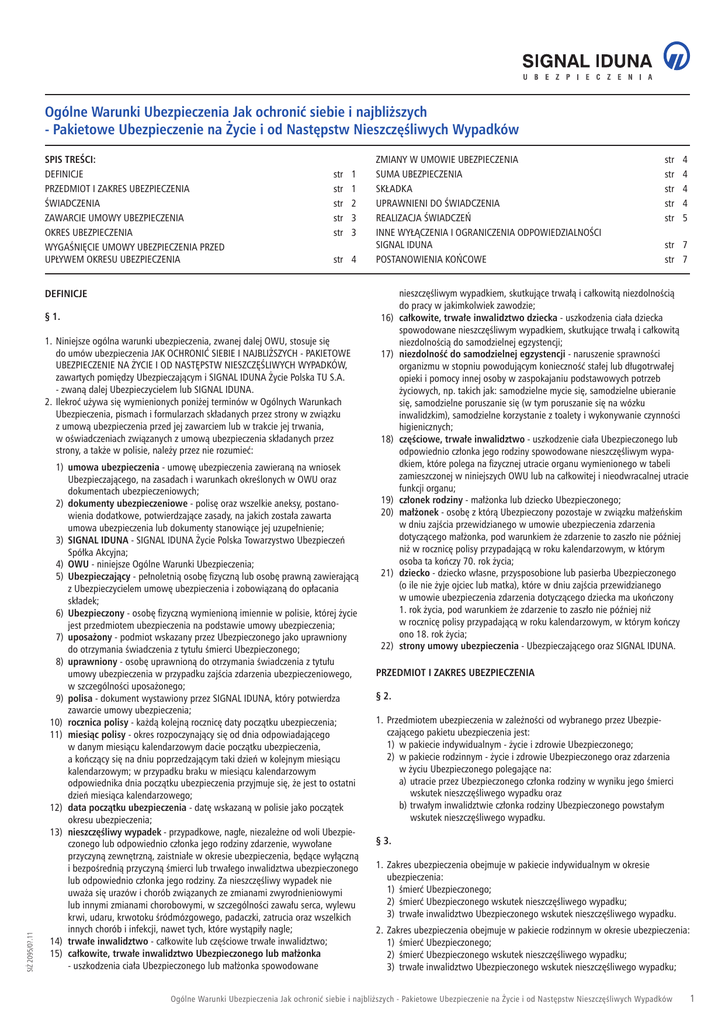 Ogólne Warunki Ubezpieczenia Jak ochronić siebie i najbliższych - Pakietowe Ubezpieczenie na Życie i od Następstw Nieszczęśliwych Wypadków SPIS TREŚCI: DEFINICJE PRZEDMIOT I ZAKRES UBEZPIECZENIA ŚWIADCZENIA ZAWARCIE UMOWY UBEZPIECZENIA OKRES UBEZPIECZENIA WYGAŚNIĘCIE UMOWY UBEZPIECZENIA PRZED UPŁYWEM OKRESU UBEZPIECZENIA str str str str str 1 1 2 3 3 str 4 DEFINICJE § 1. SIŻ 2095/0?.11 1.Niniejsze ogólna warunki ubezpieczenia, zwanej dalej OWU, stosuje się do umów ubezpieczenia JAK OCHRONIĆ SIEBIE I NAJBLIŻSZYCH - PAKIETOWE UBEZPIECZENIE NA ŻYCIE I OD NASTĘPSTW NIESZCZĘŚLIWYCH WYPADKÓW, zawartych pomiędzy Ubezpieczającym i SIGNAL IDUNA Życie Polska TU S.A. - zwaną dalej Ubezpieczycielem lub SIGNAL IDUNA. 2.Ilekroć używa się wymienionych poniżej terminów w Ogólnych Warunkach Ubezpieczenia, pismach i formularzach składanych przez strony w związku z umową ubezpieczenia przed jej zawarciem lub w trakcie jej trwania, w oświadczeniach związanych z umową ubezpieczenia składanych przez strony, a także w polisie, należy przez nie rozumieć: 1)umowa ubezpieczenia - umowę ubezpieczenia zawieraną na wniosek Ubezpieczającego, na zasadach i warunkach określonych w OWU oraz dokumentach ubezpieczeniowych; 2)dokumenty ubezpieczeniowe - polisę oraz wszelkie aneksy, postanowienia dodatkowe, potwierdzające zasady, na jakich została zawarta umowa ubezpieczenia lub dokumenty stanowiące jej uzupełnienie; 3)SIGNAL IDUNA - SIGNAL IDUNA Życie Polska Towarzystwo Ubezpieczeń Spółka Akcyjna; 4) OWU - niniejsze Ogólne Warunki Ubezpieczenia; 5) Ubezpieczający - pełnoletnią osobę fizyczną lub osobę prawną zawierającą z Ubezpieczycielem umowę ubezpieczenia i zobowiązaną do opłacania składek; 6) Ubezpieczony - osobę fizyczną wymienioną imiennie w polisie, której życie jest przedmiotem ubezpieczenia na podstawie umowy ubezpieczenia; 7) uposażony - podmiot wskazany przez Ubezpieczonego jako uprawniony do otrzymania świadczenia z tytułu śmierci Ubezpieczonego; 8) uprawniony - osobę uprawnioną do otrzymania świadczenia z tytułu umowy ubezpieczenia w przypadku zajścia zdarzenia ubezpieczeniowego, w szczególności uposażonego; 9) polisa - dokument wystawiony przez SIGNAL IDUNA, który potwierdza zawarcie umowy ubezpieczenia; 10) rocznica polisy - każdą kolejną rocznicę daty początku ubezpieczenia; 11)miesiąc polisy - okres rozpoczynający się od dnia odpowiadającego w danym miesiącu kalendarzowym dacie początku ubezpieczenia, a kończący się na dniu poprzedzającym taki dzień w kolejnym miesiącu kalendarzowym; w przypadku braku w miesiącu kalendarzowym odpowiednika dnia początku ubezpieczenia przyjmuje się, że jest to ostatni dzień miesiąca kalendarzowego; 12)data początku ubezpieczenia - datę wskazaną w polisie jako początek okresu ubezpieczenia; 13) nieszczęśliwy wypadek - przypadkowe, nagłe, niezależne od woli Ubezpieczonego lub odpowiednio członka jego rodziny zdarzenie, wywołane przyczyną zewnętrzną, zaistniałe w okresie ubezpieczenia, będące wyłączną i bezpośrednią przyczyną śmierci lub trwałego inwalidztwa ubezpieczonego lub odpowiednio członka jego rodziny. Za nieszczęśliwy wypadek nie uważa się urazów i chorób związanych ze zmianami zwyrodnieniowymi lub innymi zmianami chorobowymi, w szczególności zawału serca, wylewu krwi, udaru, krwotoku śródmózgowego, padaczki, zatrucia oraz wszelkich innych chorób i infekcji, nawet tych, które wystąpiły nagle; 14)trwałe inwalidztwo - całkowite lub częściowe trwałe inwalidztwo; 15)całkowite, trwałe inwalidztwo Ubezpieczonego lub małżonka - uszkodzenia ciała Ubezpieczonego lub małżonka spowodowane ZMIANY W UMOWIE UBEZPIECZENIA SUMA UBEZPIECZENIA SKŁADKA UPRAWNIENI DO ŚWIADCZENIA REALIZACJA ŚWIADCZEŃ INNE WYŁĄCZENIA I OGRANICZENIA ODPOWIEDZIALNOŚCI SIGNAL IDUNA POSTANOWIENIA KOŃCOWE str str str str str 4 4 4 4 5 str 7 str 7 nieszczęśliwym wypadkiem, skutkujące trwałą i całkowitą niezdolnością do pracy w jakimkolwiek zawodzie; 16)całkowite, trwałe inwalidztwo dziecka - uszkodzenia ciała dziecka spowodowane nieszczęśliwym wypadkiem, skutkujące trwałą i całkowitą niezdolnością do samodzielnej egzystencji; 17)niezdolność do samodzielnej egzystencji - naruszenie sprawności organizmu w stopniu powodującym konieczność stałej lub długotrwałej opieki i pomocy innej osoby w zaspokajaniu podstawowych potrzeb życiowych, np. takich jak: samodzielne mycie się, samodzielne ubieranie się, samodzielne poruszanie się (w tym poruszanie się na wózku inwalidzkim), samodzielne korzystanie z toalety i wykonywanie czynności higienicznych; 18)częściowe, trwałe inwalidztwo - uszkodzenie ciała Ubezpieczonego lub odpowiednio członka jego rodziny spowodowane nieszczęśliwym wypadkiem, które polega na fizycznej utracie organu wymienionego w tabeli zamieszczonej w niniejszych OWU lub na całkowitej i nieodwracalnej utracie funkcji organu; 19)członek rodziny - małżonka lub dziecko Ubezpieczonego; 20)małżonek - osobę z którą Ubezpieczony pozostaje w związku małżeńskim w dniu zajścia przewidzianego w umowie ubezpieczenia zdarzenia dotyczącego małżonka, pod warunkiem że zdarzenie to zaszło nie później niż w rocznicę polisy przypadającą w roku kalendarzowym, w którym osoba ta kończy 70. rok życia; 21)dziecko - dziecko własne, przysposobione lub pasierba Ubezpieczonego (o ile nie żyje ojciec lub matka), które w dniu zajścia przewidzianego w umowie ubezpieczenia zdarzenia dotyczącego dziecka ma ukończony 1. rok życia, pod warunkiem że zdarzenie to zaszło nie później niż w rocznicę polisy przypadającą w roku kalendarzowym, w którym kończy ono 18. rok życia; 22) strony umowy ubezpieczenia - Ubezpieczającego oraz SIGNAL IDUNA. PRZEDMIOT I ZAKRES UBEZPIECZENIA § 2. 1.Przedmiotem ubezpieczenia w zależności od wybranego przez Ubezpieczającego pakietu ubezpieczenia jes