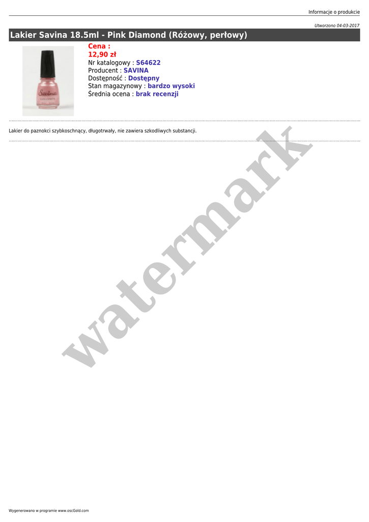 Informacje o produkcie Utworzono 04-03-2017 Lakier Savina 18.5ml - Pink Diamond (Różowy, perłowy) Cena : 12,90 zł Nr katalogowy : S64622 Producent : SAVINA Dostępność : Dostępny Stan magazynowy : bardzo wysoki Średnia ocena : brak recenzji w at er m ar k Lakier do paznokci szybkoschnący, długotrwały, nie zawiera szkodliwych substancji. Wygenerowano w programie www.oscGold.com