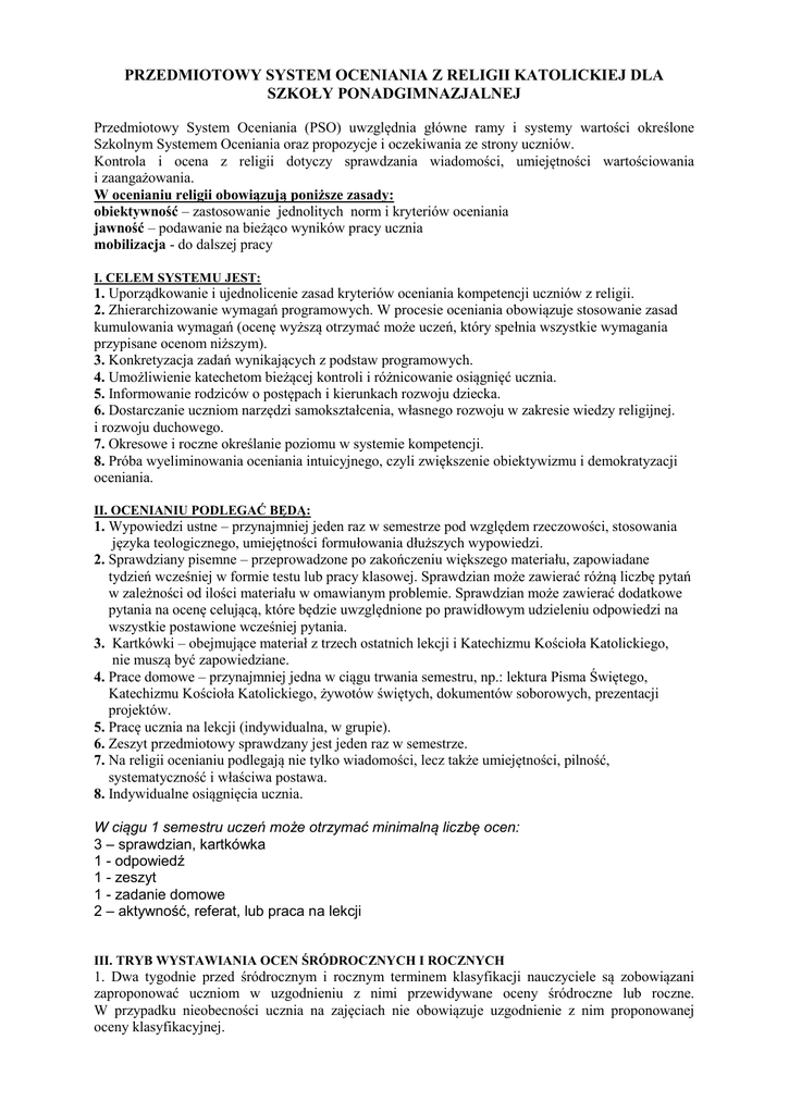 PRZEDMIOTOWY SYSTEM OCENIANIA Z RELIGII KATOLICKIEJ DLA SZKOŁY PONADGIMNAZJALNEJ Przedmiotowy System Oceniania (PSO) uwzględnia główne ramy i systemy wartości określone Szkolnym Systemem Oceniania oraz propozycje i oczekiwania ze strony uczniów. Kontrola i ocena z religii dotyczy sprawdzania wiadomości, umiejętności wartościowania i zaangażowania. W ocenianiu religii obowiązują poniższe zasady: obiektywność – zastosowanie jednolitych norm i kryteriów oceniania jawność – podawanie na bieżąco wyników pracy ucznia mobilizacja - do dalszej pracy I. CELEM SYSTEMU JEST: 1. Uporządkowanie i ujednolicenie zasad kryteriów oceniania kompetencji uczniów z religii. 2. Zhierarchizowanie wymagań programowych. W procesie oceniania obowiązuje stosowanie zasad kumulowania wymagań (ocenę wyższą otrzymać może uczeń, który spełnia wszystkie wymagania przypisane ocenom niższym). 3. Konkretyzacja zadań wynikających z podstaw programowych. 4. Umożliwienie katechetom bieżącej kontroli i różnicowanie osiągnięć ucznia. 5. Informowanie rodziców o postępach i kierunkach rozwoju dziecka. 6. Dostarczanie uczniom narzędzi samokształcenia, własnego rozwoju w zakresie wiedzy religijnej. i rozwoju duchowego. 7. Okresowe i roczne określanie poziomu w systemie kompetencji. 8. Próba wyeliminowania oceniania intuicyjnego, czyli zwiększenie obiektywizmu i demokratyzacji oceniania. II. OCENIANIU PODLEGAĆ BĘDĄ: 1. Wypowiedzi ustne – przynajmniej jeden raz w semestrze pod względem rzeczowości, stosowania języka teologicznego, umiejętności formułowania dłuższych wypowiedzi. 2. Sprawdziany pisemne – przeprowadzone po zakończeniu większego materiału, zapowiadane tydzień wcześniej w formie testu lub pracy klasowej. Sprawdzian może zawierać różną liczbę pytań w zależności od ilości materiału w omawianym problemie. Sprawdzian może zawierać dodatkowe pytania na ocenę celującą, które będzie uwzględnione po prawidłowym udzieleniu odpowiedzi na wszystkie postawione wcześniej pytania. 3. Kartkówki – obejmujące materiał z trzech ostatnich lekcji i Katechizmu Kościoła Katolickiego, nie muszą być zapowiedziane. 4. Prace domowe – przynajmniej jedna w ciągu trwania semestru, np.: lektura Pisma Świętego, Katechizmu Kościoła Katolickiego, żywotów świętych, dokumentów soborowych, prezentacji projektów. 5. Pracę ucznia na lekcji (indywidualna, w grupie). 6. Zeszyt przedmiotowy sprawdzany jest jeden raz w semestrze. 7. Na religii ocenianiu podlegają nie tylko wiadomości, lecz także umiejętności, pilność, systematyczność i właściwa postawa. 8. Indywidualne osiągnięcia ucznia. W ciągu 1 semestru uczeń może otrzymać minimalną liczbę ocen: 3 – sprawdzian, kartkówka 1 - odpowiedź 1 - zeszyt 1 - zadanie domowe 2 – aktywność, referat, lub praca na lekcji III. TRYB WYSTAWIANIA OCEN ŚRÓDROCZNYCH I ROCZNYCH 1. Dwa tygodnie przed śródrocznym i rocznym terminem klasyfikacji nauczyciele są zobowiązani zaproponować uczniom w uzgodnieniu z nimi przewidywane oceny śródroczne lub roczne. W przypadku nieobecności ucznia na zajęciach nie obowiązuje uzgodnienie z nim proponowanej oceny klasyfikacyjnej. 2. Nauczyciele są zobowiązani poinformować uczniów i ich rodziców o przewidywanych ocenach śródrocznych i rocznych poprzez umieszczenie odpowiedniego wpisu w zeszytach przedmiotowych. 3. Nauczyciel wystawia ocenę śródroczną i roczną jako średnią arytmetyczną. Roczna ocena klasyfikacyjna z obowiązkowych i dodatkowych zajęć jest średnią arytmetyczną ocen semestralnych. 4. Wystawione oceny śródroczne i roczne nie mogą być niższe od zaproponowanych dwa tygodnie przed śródrocznym lub rocznym terminem klasyfikacji. 5. Jeżeli uczeń na koniec semestru uzyskał ocenę niedostateczną musi przystąpić do jej poprawy w ciągu miesiąca od zakończenia ferii zimowych, w terminie ustalonym z nauczycielem. Forma poprawy jest pisemna. Poprawę uważa się za zaliczoną, jeżeli uczeń spełnił wymagania edukacyjne niezbędne do uzyskania oceny dopuszczającej. IV. KRYTERIA OCEN Z RELIGII. OCENA CELUJĄCA: Uczeń swoją wiedzą i umiejętnościami wykracza poza program katechezy przewidziany dla danego poziomu ( grupy wiekowej ). OCENA BARDZO DOBRA: Uczeń wykazuje pełen zakres wiadomości i umiejętności określone programem katechezy przewidzianym dla danego poziomu ( grupy wiekowej ). OCENA DOBRA : Uczeń posiada wiadomości i umiejętności pozwalające na rozumienie większości relacji między poszczególnymi jednostkami lekcyjnymi oraz między elementami wiedzy religijnej. OCENA DOSTATECZNA: Uczeń opanował wiadomości na poziomie poniżej wymagań. Uczeń wykazuje luki w wiadomościach. OCENA DOPUSZCZAJĄCA: Uczeń prezentuje wiadomości i umiejętności i postawy, które stanowią minimum programowe. OCENA NIEDOSTATECZNA: Uczeń nie opanował minimum programowego w stopniu wystarczającym na ocenę dopuszczającą Odmawia wszelkiej współpracy. Ma lekceważący stosunek do przedmiotu i wiary. WARUNKI UZYSKANIA OCENY: WYMAGANIA OCENA WARUNKI UZYSKANIA OCENY - WYKRACZAJĄCE CELUJĄCA - - - ROZSZERZAJĄCE BARDZO DOBRA - - uczeń spełnia wymagania określone w zakresie oceny bardzo dobrej, wykazuje się wiadomościami wykraczającymi poza program religii własnego poziomu nauczania, angażuje się w prace pozalekcyjne np. gazetki religijne, pomoce katechetyczne, uczestniczy w olimpiadach i konkursach wiedzy religijnej, uczeń spełnia wymagania określone w zakresie oceny jego pilność i systematyczność, zainteresowanie, stosunek do przedmiotu nie budzi żadnych zastrzeżeń, poznane prawdy wiary stosuje w życiu posiada inne osiągnięcia indywidualne zasługujące na ocenę celującą. uczeń opanował pełny zakres wiedzy, postaw i umiejętności, określony poziomem nauczania religii, wykazuje się pełną znajomością pacierza wzorowo prowadzi zeszyt i odrabia prace domowe, ak