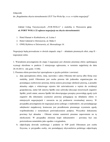 Załącznik do „Regulaminu zbycia nieruchomości ZUT Tur-Wola Sp. z o.o. w trybie negocjacji” Zakład Usług Turystycznych „TUR-WOLA” z siedzibą w Warszawie przy ul. FORT WOLA 22 ogłasza negocjacje na zbycie nieruchomości: 1. Hotel Harnaś w Korbielowie, ul. Leśna 1 2. Hotel Admirał w Dziwnowie, ul. Mała 4 3. OWK Rybitwa w Dziwnowie, ul. Słowackiego 16 Negocjacje będą prowadzone w dwóch etapach: etap I – składanie pisemnych ofert, etap II – negocjacje ustne. 1. Warunkiem przystąpienia do etapu I negocjacji jest złożenie pisemnej oferty spełniającej wymogi określone w punkcie 2 niniejszego ogłoszenia, w terminie najpóźniej do dnia 28.10.2011r. (do godz. 15.00). 2. Pisemna oferta powinna być sporządzona w języku polskim i zawierać: a. datę sporządzenia oferty, imię, nazwisko i adres Oferenta lub nazwę albo firmę oraz siedzibę, jeżeli Oferentem jest osoba prawna lub jednostka organizacyjna nie posiadająca osobowości prawnej, której ustawa przyznaje zdolność prawną, a ponadto aktualny odpis z właściwego rejestru lub zaświadczenie o wpisie do ewidencji gospodarczej, statut lub umowę Spółki oraz uchwałę (decyzję) stosownych organów Spółki, jeżeli statut, umowa Spółki lub obowiązujące przepisy przewidują zgody tych organów dla dokonania czynności prawnej polegającej na składaniu oferty w niniejszych negocjacjach i zawarciu na jej podstawie ewentualnej umowy. W przypadku przystąpienia do negocjacji przez jednego z małżonków, nie posiadającego odrębności majątkowej, konieczne jest przedłożenie pisemnego wyrażenia zgody współmałżonka z notarialnym poświadczeniem podpisu. Wszystkie dokumenty powinny być aktualne - Oferent winien zamieścić pisemne zapewnienie na tę okoliczność. W przypadku złożenia kopii dokumentów - powinny być one potwierdzone notarialnie jako zgodne z oryginałem, b. odpis/kopię dowodu osobistego i podanie nr NIP jeżeli Oferentem jest osoba fizyczna, w przypadku osoby, nie posiadającej obywatelstwa polskiego odpis/kopię paszportu, w przypadku zaś podmiotu zagranicznego, nie posiadającego siedziby na terenie Polski, właściwy dokument rejestrowy, wskazujący nazwę podmiotu, formę prawną, siedzibę, skład organu zarządzającego i sposób reprezentacji, ewentualnie pełnomocnictwo dla osób działających w imieniu tego podmiotu, jeżeli osoby te nie są członkami organu zarządzającego, wszystkie wymienione dokumenty wraz z tłumaczeniem przysięgłym na język polski, c. stosowne pełnomocnictwa dla osoby upoważnionej do prowadzenia negocjacji, jeżeli do postępowania negocjacyjnego zostanie dopuszczona jednostka organizacyjna nie posiadająca podmiotowości prawnej w rozumieniu przepisów prawa polskiego (np. spółka cywilna, konsorcjum, holding lub grupa podmiotów gospodarczych), d. stosowne pełnomocnictwa, jeżeli prawo do reprezentowania Oferenta nie wynika z dokumentów, o których mowa powyżej, e. oświadczenie o zobowiązaniu Oferenta do pokrycia wszystkich kosztów związanych z nabyciem nieruchomości, w tym opłat notarialnych i sądowych oraz stosownych podatków oraz kosztów pracy tłumacza przysięgłego (w przypadku podmiotu nie posługującego się językiem polskim), f. oświadczenie o zobowiązaniu się do wpłaty wadium w przypadku zakwalifikowania się do etapu II - negocjacji ustnych, g. oświadczenie Oferenta o zapoznaniu się z warunkami negocjacji oraz materiałem informacyjnym i że przyjmuje te warunki bez zastrzeżeń, jak również oświadczenie, że zapoznał się ze stanem faktycznym i prawnym nieruchomości i nie wnosi do tego żadnych zastrzeżeń, h. w przypadku osób fizycznych oświadczenie o następującej treści: „Wyrażam zgodę na przetwarzanie danych osobowych zawartych w mojej ofercie dla potrzeb niezbędnych do realizacji transakcji kupna-sprzedaży środka trwałego (zgodnie z ustawą z dnia 29 sierpnia 1997 r. o ochronie danych osobowych Dz.U. Nr 33, poz. 883)”, i. oferowaną cenę nabycia i sposób jej zapłaty, j. proponowany sposób realizacji dodatkowych warunków negocjacji. 3. Treść oferty oraz załączone dokumenty powinny być sporządzone w języku polskim (tłumaczenia powinny być dokonane przez tłumacza przysięgłego), wszystkie dokumenty powinny być złożone w oryginałach lub poświadczonych notarialnie kopiach oraz powinny mieć stosowne podpisy osób upoważnionych, składane dokumenty i oświadczenia powinny być właściwe dla formy prawnej podmiotu i prowadzonej przez niego działalności. 4. Rozpatrzenie ofert odbywa się na posiedzeniu niejawnym najpóźniej w terminie 7 dni od terminu złożenia ofert pisemnych. Wybór oferentów zakwalifikowanych do II etapu – negocjacji ustnych zatwierdza Zarząd Spółki. 5. Oferenci zostaną powiadomieni pisemnie o wynikach rozpatrzenia złożonych ofert. 6. Oferenci, których oferty zostały zakwalifikowane do II etapu – negocjacji ustnych, zostaną powiadomieni pisemnie o terminie negocjacji. 7. Oferenci, którzy zostali zakwalifikowani do II etapu – negocjacji ustnych mają obowiązek wpłaty wadium w wysokości 5% oferowanej ceny na rachunek wskazany przez Spółkę przed przystąpieniem do negocjacji ustnych. 8. Przed przystąpieniem do negocjacji ustnych, uczestnik negocjacji zobowiązany jest do okazania oryginału dowodu wpłaty wadium oraz do okazania członkom Komisji negocjacyjnej dokumentu tożsamości oraz umocowania do działania w imieniu oferenta. 9. Wadium złożone przez oferentów zaproszonych do II etapu – negocjacji ustnych, których oferty nie zostaną przyjęte, zostanie zwrócone bez odsetek na wskazany rachunek bezpośrednio po poinformowaniu o dokonaniu wyboru oferty. 10. Dodatkowe propozycje uczestników negocjacji złożone w trakcie negocjacji nie mogą być mniej korzystne od zawartych w pisemnej ofercie. 11. Wadium wpłacone przez nabywcę (wybranego oferenta), zostanie zarachowane na poczet ceny nabycia. 12.Wadium