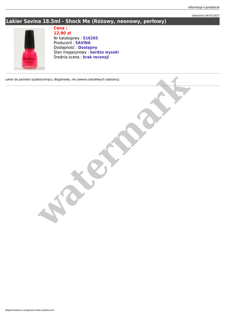 Informacje o produkcie Utworzono 04-03-2017 Lakier Savina 18.5ml - Shock Me (Różowy, neonowy, perłowy) Cena : 12,90 zł Nr katalogowy : S16265 Producent : SAVINA Dostępność : Dostępny Stan magazynowy : bardzo wysoki Średnia ocena : brak recenzji w at er m ar k Lakier do paznokci szybkoschnący, długotrwały, nie zawiera szkodliwych substancji. Wygenerowano w programie www.oscGold.com