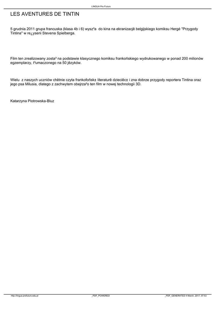 LINGUA Pro Futuro LES AVENTURES DE TINTIN 5 grudnia 2011 grupa francuska (klasa 4b i 6) wysz³a do kina na ekranizacjê belgijskiego komiksu Hergé "Przygody Tintina" w re¿yserii Stevena Spielberga. Film ten zrealizowany zosta³ na podstawie klasycznego komiksu frankoñskiego wydrukowanego w ponad 200 milionów egzemplarzy, t³umaczonego na 50 jêzyków. Wielu z naszych uczniów chêtnie czyta frankofoñsk± literaturê dzieciêc± i zna dobrze przygody reportera Tintina oraz jego psa Milusia, dlatego z zachwytem obejrza³o ten film w nowej technologii 3D. Katarzyna Piotrowska-Bluz http://lingua.profuturo.edu.pl _PDF_POWERED _PDF_GENERATED 4 March, 2017, 07:53