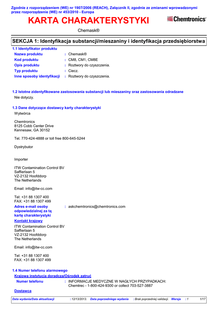 Zgodnie z rozporządzeniem (WE) nr 1907/2006 (REACH), Załącznik II, zgodnie ze zmianami wprowadzonymi przez rozporządzenie (WE) nr 453/2010 - Europa KARTA CHARAKTERYSTYKI Chemask® SEKCJA 1: Identyfikacja substancji/mieszaniny i identyfikacja przedsiębiorstwa 1.1 Identyfikator produktu Nazwa produktu : Chemask® Kod produktu : CM8, CM1, CM8E : Roztwory do czyszczenia. Opis produktu Typ produktu Inne sposoby identyfikacji : Ciecz. : Roztwory do czyszczenia. 1.2 Istotne zidentyfikowane zastosowania substancji lub mieszaniny oraz zastosowania odradzane Nie dotyczy. 1.3 Dane dotyczące dostawcy karty charakterystyki Wytwórca Chemtronics 8125 Cobb Center Drive Kennesaw, GA 30152 Tel. 770-424-4888 or toll free 800-645-5244 Dystrybutor Importer ITW Contamination Control BV Saffierlaan 5 VZ-2132 Hoofddorp The Netherlands Email: [email protected] Tel: +31 88 1307 400 FAX: +31 88 1307 499 Adres e-mail osoby odpowiedzialnej za tą kartę charakterystyki : [email protected] Kontakt krajowy ITW Contamination Control BV Saffierlaan 5 VZ-2132 Hoofddorp The Netherlands Email: [email protected] Tel: +31 88 1307 400 FAX: +31 88 1307 499 1.4 Numer telefonu alarmowego Krajowa instytucja doradcza/Ośrodek zatruć Numer telefonu : INFORMACJE MEDYCZNE W NAGŁYCH PRZYPADKACH: Chemtrec - 1-800-424-9300 or collect 703-527-3887 Dostawca Data wydania/Data aktualizacji : 12/13/2013. Data poprzedniego wydania : Brak poprzedniej validacji. Wersja :1 1/17 Spełnia wymagania przepisów EC 1907/2006 (REACH), Załącznik II - Europa Chemask® SEKCJA 1: Identyfikacja substancji/mieszaniny i identyfikacja przedsiębiorstwa Numer telefonu : Chemtronics Product Information: 800-TECH-401 (800-832-4401) Chemtronics Customer Service: 800-645-5244 Chemtrec 800-424-9300 Godziny pracy : Chemtrec - 1-800-424-9300 or collect 703-527-3887 Dla osób udzielających pomocy 24/7 : INFORMACJE MEDYCZNE W NAGŁYCH PRZYPADKACH: INFORMACJE O POSTĘPOWANIU W RAZIE ROZLANIA: Informacje o transporcie Ograniczenia dotyczące informacji SEKCJA 2: Identyfikacja zagrożeń 2.1 Klasyfikacja substancji lub mieszaniny : Mieszanina Definicja produktu Klasyfikacja według rozporządzenia (EC) Nr 1272/2008 [CLP/GHS] Acute Tox. 3, H301 Acute Tox. 2, H310 Acute Tox. 2, H330 Skin Sens. 1, H317 Aquatic Chronic 2, H411 Produkt został sklasyfikowany jako niebezpieczny według rozporządzenia (WE) 1272/2008 ze zmianami. : Procentowa zawartość w mieszaninie składnika/składników o nieznanej Składniki o nieznanej toksyczności: 98.5% toksyczności : Procentowa zawartość w mieszaninie składnika/składników o nieznanym zagrożeniu Skłądniki o nieznanej dla środowiska wodnego: 98.5% ekotoksyczności Klasyfikacja według Dyrektywy 1999/45/WE [DPD] Produkt ten jest sklasyfikowany jako niebezpieczny w rozumieniu Dyrektywy 1999/45/EC wraz z jej późniejszymi zmianami. Klasyfikacja : R43 N; R51/53 : Może powodować uczulenie w kontakcie ze skórą. Zagrożenia ludzkiego zdrowia : Działa toksycznie na organizmy wodne; może powodować długo utrzymujące się Zagrożenia dla niekorzystne zmiany w środowisku wodnym. środowiska Pełny tekst powyższych zwrotów R lub uwag H podano w punkcie 16. Bardziej szczegółowe informacje dotyczące wpływu na stan zdrowia oraz ewentualnych objawów można znaleźć w rozdziale 11. 2.2 Elementy oznakowania Piktogramy zagrożeń : Hasło ostrzegawcze : Niebezpieczeństwo Zwroty wskazujące rodzaj zagrożenia : Grozi śmiercią w kontakcie ze skórą lub w następstwie wdychania. Działa toksycznie po połknięciu. Może powodować reakcję alergiczną skóry. Działa toksycznie na organizmy wodne, powodując długotrwałe skutki. Zwroty wskazujące środki ostrożności Zapobieganie Data wydania/Data aktualizacji : Stosować rękawice ochronne. Unikać uwolnienia do środowiska. Nie wprowadzać do oczu, na skórę lub na odzież. Nie wdychać pary. : 12/13/2013. Data poprzedniego wydania : Brak poprzedniej validacji. Wersja :1 2/17 Spełnia wymagania przepisów EC 1907/2006 (REACH), Załącznik II - Europa Chemask® SEKCJA 2: Identyfikacja zagrożeń Reagowanie Przechowywanie Usuwanie Niebezpieczne składniki Uzupełniające elementy etykiety : W PRZYPADKU DOSTANIA SIĘ DO DRÓG ODDECHOWYCH: Wyprowadzić lub wynieść poszkodowanego na świeże powietrze i zapewnić mu warunki do swobodnego oddychania. Natychmiast skontaktować się z OŚRODKIEM ZATRUĆ lub wezwać lekarza. W PRZYPADKU POŁKNIĘCIA: Natychmiast skontaktować się z OŚRODKIEM ZATRUĆ lub wezwać lekarza. W PRZYPADKU KONTAKTU ZE SKÓRĄ: Natychmiast skontaktować się z OŚRODKIEM ZATRUĆ lub wezwać lekarza. : Przechowywać pod zamknięciem. : Zawartość pojemnika jak i pojemnik utylizować zgodnie z lokalnymi, regionalnymi, narodowymi oraz międzynarodowymi przepisami. : bis(dibutyloditiokarbaminian) cynku metanol : WYŁĄCZNIE DO UŻYTKU PRZEMYSŁOWEGO : Nie dotyczy. Ograniczenia dotyczące produkcji, wprowadzania do obrotu i stosowania niektórych niebezpiecznych substancji, preparatów i wyrobów Specjalne wymagania dotyczące pakowania : Nie dotyczy. Pojemniki powinny być wyposażone w zamknięcia uniemożliwiające otworzenie ich przez dzieci : Nie dotyczy. Dotykowe ostrzeżenia przed niebezpieczeństwem 2.3 Inne zagrożenia Inne zagrożenia nie odzwierciedlone w klasyfikacji : Nie znane. SEKCJA 3: Skład/informacja o składnikach 3.2 Mieszaniny : Mieszanina Klasyfikacja Nazwa produktu/ składnika bis Identyfikatory WE: 205-232-8 (dibutyloditiokarbaminian) CAS: 136-23-2 cynku Indeks: 006-081-00-9 metanol WE: 200-659-6 CAS: 67-56-1 Indeks: 603-001-00-X Data wydania/Data aktualizacji : 12/13/2013. % 67/548/EWG >=2.5 <5 Xi; R36/37/38 R43 N; R50/53 <3 F; R11 T; R23/24/25, R39/23/24/25 Data poprzedniego wydania Rozporządzenie (WE) Nr 1272/2008 [CLP] Skin Irrit. 2, H315 Eye Irrit. 2, H319 Skin Sens. 1, H317 STOT SE 3, H335 (Działanie drażniące na drogi oddechowe) Aquatic Acute 1, H400 Aquatic Chronic 1, H410 Flam. Liq. 2, H225 Acute Tox. 3, H