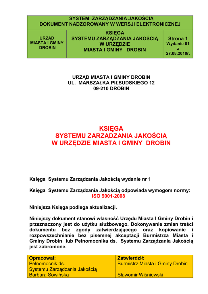 SYSTEM ZARZĄDZANIA JAKOŚCIĄ DOKUMENT NADZOROWANY W WERSJI ELEKTRONICZNEJ URZĄD MIASTA I GMINY DROBIN KSIĘGA SYSTEMU ZARZĄDZANIA JAKOŚCIĄ W URZĘDZIE MIASTA I GMINY DROBIN Strona 1 Wydanie 01 z 27.08.2010r. URZĄD MIASTA I GMINY DROBIN UL. MARSZAŁKA PIŁSUDSKIEGO 12 09-210 DROBIN KSIĘGA SYSTEMU ZARZĄDZANIA JAKOŚCIĄ W URZĘDZIE MIASTA I GMINY DROBIN Księga Systemu Zarządzania Jakością wydanie nr 1 Księga Systemu Zarządzania Jakością odpowiada wymogom normy: ISO 9001-2008 Niniejsza Księga podlega aktualizacji. Niniejszy dokument stanowi własność Urzędu Miasta I Gminy Drobin i przeznaczony jest do użytku służbowego. Dokonywanie zmian treści dokumentu bez zgody zatwierdzającego oraz kopiowanie i rozpowszechnianie bez pisemnej akceptacji Burmistrza Miasta i Gminy Drobin lub Pełnomocnika ds. Systemu Zarządzania Jakością jest zabronione. Opracował: Pełnomocnik ds. Systemu Zarządzania Jakością Barbara Sowińska Zatwierdził: Burmistrz Miasta i Gminy Drobin Sławomir Wiśniewski SYSTEM ZARZĄDZANIA JAKOŚCIĄ DOKUMENT NADZOROWANY W WERSJI ELEKTRONICZNEJ URZĄD MIASTA I GMINY DROBIN KSIĘGA SYSTEMU ZARZĄDZANIA JAKOŚCIĄ W URZĘDZIE MIASTA I GMINY DROBIN Strona 2 Wydanie 01 z 27.08.2010r. SPIS TREŚCI: 1. Wprowadzenie 1. 1. Prezentacja środowiska organizacji 1. 2. O Księdze Systemu Zarządzania Jakością 1. 3. Słownik pojęć używanych w Księdze Systemu Zarządzania Jakością 2. Opis organizacji 2. 1. Podstawy prawne działalności 2. 2. Charakterystyka i zakres działalności 2. 3. Przedmiot działalności 2. 4. Struktura organizacyjna 2. 5. Zakres Systemu Zarządzania Jakością w Urzędzie 2. 5. 1. Zarządzanie jakością 3. Informacja o produktach 4. Odpowiedzialność kierownictwa 4. 1. Deklaracja Kierownictwa 4. 2. Polityka Jakości 4. 3. Wdrażanie Polityki Jakości 4. 4. Odpowiedzialność i uprawnienia 4. 5. Zasoby 4. 6. Przedstawiciel kierownictwa 4. 7. Powiązania organizacyjne Opracował: Pełnomocnik ds. Systemu Zarządzania Jakością Barbara Sowińska Zatwierdził: Burmistrz Miasta i Gminy Drobin Sławomir Wiśniewski SYSTEM ZARZĄDZANIA JAKOŚCIĄ DOKUMENT NADZOROWANY W WERSJI ELEKTRONICZNEJ URZĄD MIASTA I GMINY DROBIN KSIĘGA SYSTEMU ZARZĄDZANIA JAKOŚCIĄ W URZĘDZIE MIASTA I GMINY DROBIN Strona 3 Wydanie 01 z 27.08.2010r. 5. System Zarządzania Jakością 5. 1. Schemat Systemu Zarządzania Jakością 5. 2. Mapa procesów 5. 3. Księga Procesów 5. 4. Orientacja na klienta 5. 5. Komunikacja wewnętrzna i zewnętrzna 5. 6. Przegląd systemu przez kierownictwo 5. 7. Kompetencje, świadomość i szkolenia personelu organizacji 5. 8. Nadzorowanie wymagań prawnych 6. Doskonalenie Systemu Zarządzania Jakością 6. 1. Cele Systemu Zarządzania Jakością w odniesieniu do procesów 6. 2. Grupy procesów 6. 2. 1. Proces doskonalenia systemu 6. 2. 2. Instrukcje ogólne 6. 2. 3. Proces obsługi klienta 6. 2. 4. Proces zarządzania zasobami ludzkimi 6. 2. 5. Proces obsługi ustawowej 7. Nadzorowanie wyposażenia do pomiarów 8. Wykaz skrótów i symboli używanych w Księdze Systemu Zarządzania Jakością oraz Księdze Procesów 1. Wprowadzenie 1. 1. Prezentacja środowiska organizacji Drobin – miasto w powiecie płockim, woj. mazowieckie, siedziba władz gminy miejsko-wiejskiej. Ośrodkiem założenia miejskiego jest duży, prostokątny rynek, na środku którego stoi kościół gotycki z 1477r. Za datę otrzymania praw miejskich uważa się bezspornie rok 1487. Na mocy decyzji władz zaborczych, aktem prawnym z 1 czerwca 1869 r., Drobin utracił prawa miejskie i dnia 1 stycznia 1870 r. stał się osadą. Ponownie Drobin otrzymał prawa miejskie 1 czerwca 1994r. decyzją Premiera RP Waldemara Pawlaka. Opracował: Pełnomocnik ds. Systemu Zarządzania Jakością Barbara Sowińska Zatwierdził: Burmistrz Miasta i Gminy Drobin Sławomir Wiśniewski SYSTEM ZARZĄDZANIA JAKOŚCIĄ DOKUMENT NADZOROWANY W WERSJI ELEKTRONICZNEJ URZĄD MIASTA I GMINY DROBIN KSIĘGA SYSTEMU ZARZĄDZANIA JAKOŚCIĄ W URZĘDZIE MIASTA I GMINY DROBIN Strona 4 Wydanie 01 z 27.08.2010r. Drobin położony jest 100 km od Warszawy. Tu krzyżują się dwa ważne szlaki komunikacyjne: droga nr 10 łącząca Warszawę z całym Pomorzem Zachodnim oraz droga nr 60 stanowiąca szlak tranzytowy do krajów bałtyckich. Gminę Drobin o pow. 143 km2 położoną w północnozachodniej części Niziny Mazowieckiej zamieszkuje 8.585 osób. Historia miasta i gminy Drobin Pierwszą wzmiankę o Drobinie spotykamy w „Historii Polski” samego Jana Długosza. Pochodzi ona z 1172 r. Od połowy XV wieku, Drobin był we władaniu rodu Kryskich. W 1444 roku bracia Ninogniew i Paweł Kryscy kupili Drobin od – jak pisze Jerzy Łempicki w „Herbarzu Mazowieckim” – „swoich współrodowców Gulczewskich.”Synowie Ninogniewa: Ninogniew II, późniejszy wojewoda płocki, i Jan z Gradzanowa, kanonik płocki, odziedziczyli prawa do Drobina po ojcu. Ksiądz Jan, w 1478 r. odstąpił bratu prawa do Drobina, wzmiankowanego wówczas jako miasto. Miasto przechodziło różne koleje losu nierozerwalnie związane z historią Polski. Przez Drobin król Jagiełło prowadził swoje wojska pod Grunwald, nie ominął nas potop szwedzki, powstanie styczniowe. W 1511r. Drobin otrzymał przywilej królewski dotyczący jarmarków. Do dnia dzisiejszego zachował się zwyczaj i w każdy czwartek zjeżdżają do nas okoliczni mieszkańcy na jarmark. Drobin był w posiadaniu Kryskich do schyłku XVII wieku. Po śmierci Stanisława Kryskiego kasztelana raciążskiego prawa do Drobina, od macochy Jadwigi z Mostowskich Kryskiej, wykupiła Zofia z Kryskich Kępska, żona Mikołaja. W ich posiadaniu był do 1715 roku. Następnie prawa do Drobina wykupił w 1715 r. Adam Jeżewski, podkomorzy płocki; w jego rękach pozostawał do 1719 r. Bracia Jerzy i Józef Tyszkiewicze zaczęli wykupywać dobra drobińskie w latach 17211722. Później dziedzicem został Franciszek Skarbek, chorąży łęczycki. W roku 1750 dobra 