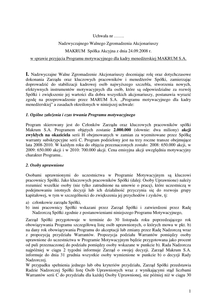 Uchwała nr ……. Nadzwyczajnego Walnego Zgromadzenia Akcjonariuszy MAKRUM Spółka Akcyjna z dnia 24.09.2008 r. w sprawie przyjęcia Programu motywacyjnego dla kadry menedżerskiej MAKRUM S.A. I. Nadzwyczajne Walne Zgromadzenie Akcjonariuszy doceniając rolę oraz dotychczasowe dokonania Zarządu oraz kluczowych pracowników i menedżerów Spółki, zamierzając doprowadzić do stabilizacji kadrowej osób najwyższego szczebla, stworzenia nowych, efektywnych instrumentów motywacyjnych dla osób, które są odpowiedzialne za rozwój Spółki i zwiększenie jej wartości dla dobra wszystkich akcjonariuszy, postanawia wyrazić zgodę na przeprowadzenie przez MARUM S.A. „Programu motywacyjnego dla kadry menedżerskiej” a zasadach określonych w niniejszej uchwale: 1. Ogólne założenia i czas trwania Programu motywacyjnego Program skierowany jest do Członków Zarządu oraz kluczowych pracowników spółki Makrum S.A. Programem objętych zostanie 2.000.000 (słownie: dwa miliony) akcji zwykłych na okaziciela serii H obejmowanych w zamian za wyemitowane przez Spółkę warranty subskrypcyjne serii C. Program podzielony jest na trzy roczne transze obejmujące lata 2008-2010. W każdym roku do objęcia przeznaczonych zostało: 2008: 650.000 akcji, w 2009: 650.000 akcji i w 2010: 700.000 akcji. Cena emisyjna akcji uwzględnia motywacyjny charakter Programu.. 2. Osoby uprawnione Osobami uprawnionymi do uczestnictwa w Programie Motywacyjnym są kluczowi pracownicy Spółki. Jako kluczowych pracowników Spółki (dalej: Osoby Uprawnione) należy rozumieć wszelkie osoby (nie tylko zatrudnione na umowie o pracę), które uczestniczą w podejmowaniu istotnych decyzji lub ich działalność przyczynia się do rozwoju grupy kapitałowej, w tym w szczególności do zwiększenia jej przychodów i zysków, tj: a) członkowie zarządu Spółki, b) inni pracownicy Spółki wskazani przez Zarząd Spółki i zatwierdzeni przez Radę Nadzorczą Spółki zgodnie z postanowieniami niniejszego Programu Motywacyjnego, Zarząd Spółki przygotowuje w terminie do 30 listopada roku poprzedzającego rok obowiązywania Programu szczegółową listę osób uprawnionych, o których mowa w pkt. b) na dany rok obowiązywania Programu do akceptacji lub zmiany przez Radę Nadzorczą wraz z propozycją przydziału Warrantów. Propozycja podziału Warrantów pomiędzy osoby uprawnione do uczestnictwa w Programie Motywacyjnym będzie przygotowana jako procent od puli przeznaczonej do podziału pomiędzy osoby wskazane w punkcie b). Rada Nadzorcza najpóźniej w ciągu 2 tygodni informuje Zarząd o swojej decyzji. Zarząd Makrum S.A. informuje do dnia 31 grudnia wszystkie osoby wymienione w punkcie b) o decyzji Rady Nadzorczej. W przypadku spełnienia jednego lub obu kryteriów przydziału, Zarząd Spółki przedstawia Radzie Nadzorczej Spółki listę Osób Uprawnionych wraz z wynikającymi stąd liczbami Warrantów serii C do przydziału dla każdej Osoby Uprawnionej, nie później niż w ciągu 30 1 dni od dnia zatwierdzenia przez Walne Zgromadzenie Akcjonariuszy sprawozdania finansowego Spółki, w celu zatwierdzenia jej przez Radę Nadzorczą. W ciągu 14 dni od zatwierdzenia listy Zarząd wysyła do Osób Uprawnionych pisma, w których oferuje objęcie Warrantów subskrypcyjnych. Zważywszy na to, że dla pierwszego roku obowiązywania Programu Motywacyjnego tj. 2008 spełnienie powyższej procedury nie będzie możliwe ustala się jak poniżej: 1. Zarząd Spółki przygotowuje w terminie 14 dni od dnia uchwalenia przez NWZA niniejszego Programu listę osób, o której mowa w pkt b) wraz z propozycją podziału Warrantów, 2. Rada Nadzorcza najpóźniej w ciągu 2 tygodni od dnia otrzymania powyższej propozycji informuje Zarząd o swojej decyzji. 3. Zarząd Makrum S.A., w ciągu 2 tygodni od dnia otrzymania decyzji Rady Nadzorczej, powiadomi wszystkie osoby wymienione w punkcie b) o decyzji Rady Nadzorczej. 3. Emisja warrantów subskrypcyjnych Spółka wyemituje łącznie 2 mln (słownie: dwa miliony) warrantów subskrypcyjnych serii C uprawniających ich posiadaczy do objęcia w zamian za posiadane warranty akcji serii H. Emisja warrantów zostanie dokonana poza ofertą publiczną, o której mowa w ustawie z dnia 29.07.2005 r. o ofercie publicznej i warunkach wprowadzania instrumentów finansowych do zorganizowanego systemu obrotu oraz o spółkach publicznych. Liczba osób, do których zostanie skierowana propozycja nabycia warrantów serii C nie przekroczy 99 osób. Warranty tej serii będą subskrybowane nieodpłatnie. Każdy warrant serii C uprawnia jego posiadacza do objęcia 1 (słownie: jednej) akcji na okaziciela serii H po cenie emisyjnej równej średniej cenie rynkowej z okresu 3 miesięcy przed momentem uchwalenia Programu motywacyjnego umniejszonej o 5%. Średni kurs rynkowy akcji Spółki na okaziciela notowanych na rynku regulowanym prowadzonym przez Giełdę Papierów Wartościowych w Warszawie S.A. za powyższy okres liczony będzie jako iloraz sumy kursów zamknięcia na sesjach giełdowych, na których choć 1 akcja Spółki zmieniła właściciela, i liczby sesji, na których choć 1 akcja Spółki zmieniła właściciela. Zarząd Spółki dokonuje wyliczenia średniego kursu rynkowego akcji i przedstawia go Radzie Nadzorczej. Warranty będą przydzielane proporcjonalnie za każdy rok trwania Programu Motywacyjnego, tj. w następujący sposób: a) za 2008 rok – 650.000 (słownie: sześćset pięćdziesiąt tysięcy) warrantów, b) za 2009 rok – 650.000 (słownie: sześćset pięćdziesiąt tysięcy) warrantów, c) za 2010 rok – 700.000 (słownie: siedemset tysięcy) warrantów. 4. Przydział Warrantów subskrypcyjnych 60,0% Warrantów subskrypcyjnych serii C przeznacza się do objęcia przez Członków Zarządu Spółki, z tym zastrzeżeniem, że o przydziale konkretnej liczby Warrantów dla danego Członka Zarządu, decyduje Rada Nadzorcza; nie wszystkie Warranty z tej puli muszą zos