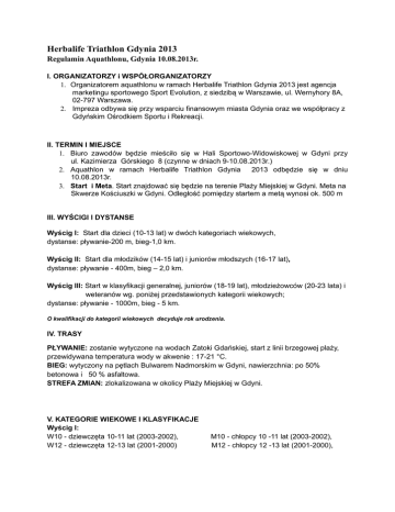 Herbalife Triathlon Gdynia 2013 Regulamin Aquathlonu, Gdynia 10.08.2013r. I. ORGANIZATORZY i WSPÓŁORGANIZATORZY 1. Organizatorem aquathlonu w ramach Herbalife Triathlon Gdynia 2013 jest agencja marketingu sportowego Sport Evolution, z siedzibą w Warszawie, ul. Wernyhory 8A, 02-797 Warszawa. 2. Impreza odbywa się przy wsparciu finansowym miasta Gdynia oraz we współpracy z Gdyńskim Ośrodkiem Sportu i Rekreacji. II. TERMIN I MIEJSCE 1. Biuro zawodów będzie mieściło się w Hali Sportowo-Widowiskowej w Gdyni przy ul. Kazimierza Górskiego 8 (czynne w dniach 9-10.08.2013r.) 2. Aquathlon w ramach Herbalife Triathlon Gdynia 2013 odbędzie się w dniu 10.08.2013r. 3. Start i Meta. Start znajdować się będzie na terenie Plaży Miejskiej w Gdyni. Meta na Skwerze Kościuszki w Gdyni. Odległość pomiędzy startem a metą wynosi ok. 500 m III. WYŚCIGI I DYSTANSE Wyścig I: Start dla dzieci (10-13 lat) w dwóch kategoriach wiekowych, dystanse: pływanie-200 m, bieg-1,0 km. Wyścig II: Start dla młodzików (14-15 lat) i juniorów młodszych (16-17 lat), dystanse: pływanie - 400m, bieg – 2,0 km. Wyścig III: Start w klasyfikacji generalnej, juniorów (18-19 lat), młodzieżowców (20-23 lata) i weteranów wg. poniżej przedstawionych kategorii wiekowych; dystanse: pływanie - 1000m, bieg - 5 km. O kwalifikacji do kategorii wiekowych decyduje rok urodzenia. IV. TRASY PŁYWANIE: zostanie wytyczone na wodach Zatoki Gdańskiej, start z linii brzegowej plaży, przewidywana temperatura wody w akwenie : 17-21 °C. BIEG: wytyczony na pętlach Bulwarem Nadmorskim w Gdyni, nawierzchnia: po 50% betonowa i 50 % asfaltowa. STREFA ZMIAN: zlokalizowana w okolicy Plaży Miejskiej w Gdyni. V. KATEGORIE WIEKOWE I KLASYFIKACJE Wyścig I: W10 - dziewczęta 10-11 lat (2003-2002), W12 - dziewczęta 12-13 lat (2001-2000) M10 - chłopcy 10 -11 lat (2003-2002), M12 - chłopcy 12 -13 lat (2001-2000), Wyścig II: W14 - młodziczki 14-15 lat (1999-1998), W16 - juniorki młodsze 16-17 lat (1997-1996), Wyścig III: W - klasyfikacja generalna kobiet, W 18 – juniorki 18-19 lat (1995-1994), W 20 – młodzieżówki 20-23 lat (1993-90), W24 – senior 24-39 lat (1989-1974) W 40 – weteranki 40 - 49 lat (1973-1964) W +50 – weteranki 50 lat i więcej (1963-…) . M14 - młodzicy 14 -15 lat (1999-1998), M16 – juniorzy młodsi 16 -17 lat (1997-96) M - klasyfikacja generalna mężczyzn, M18 - juniorzy 18 -19 lat (1995-1994), M20 – młodzieżowcy 20-23 lata (1993-90) M24 – senior 24-39 lat (1989-1974) M40 – weterani 40-49 lat (1973-64) M50 – weterani 50-59 lat (1963-54) KG- najlepsza Gdynianka, VI. NAGRODY M+60 –weterani 60 lat i więcej (1953 - …) MG- najlepszy Gdynianin Po zakończeniu aquathlonu zostaną przyznane i wręczone następujące nagrody i wyróżnienia: 1) Puchary i symboliczne nagrody za zajęcie I – III miejsca w klasyfikacji generalnej kobiet i mężczyzn oraz w poszczególnych kategoriach wiekowych i klasyfikacji Gdynian. 2) Nagrody dublują się, co oznacza, ze zawodnik otrzymujący nagrodę za miejsce zajęte w klasyfikacji generalnej aquathlonu otrzymuje nagrodę również za miejsce zajęte w ramach prowadzonej kategorii wiekowej. 3).Wszyscy zawodnicy i zawodniczki zostaną wyróżnieni okolicznościowymi medalami za ukończenie aquathlonu VII. PROGRAM ZAWODÓW 09.00 - 11.00 Weryfikacja zgłoszeń, odbiór pakietów startowych. 11:45 - Odprawa Techniczna przed startem do wyścigu nr I. 12:00 - Start do wyścigu nr I (200m pływanie – 1,0km bieg) 12:15 - Odprawa Techniczna przed startem do wyścigu nr II. 12:30 - Start do wyścigu nr II (400m pływanie - 2,0 km bieg ) 13:00 - Rozpoczęcie ceremonii dekoracji wyścigu I 13:00 - Odprawa Techniczna przed startem do wyścigu nr III. 13:15 - Start do wyścigu nr III (1000m pływanie - 5,0 km bieg) 15:00 - Rozpoczęcie ceremonii dekoracji wyścigów II i III i uroczyste zakończenie zawodów. VII. WARUNKI UCZESTNICTWA 1. Osoby niepełnoletnie zobowiązane są do posiadania pozwolenia na udział od rodziców lub prawnych opiekunów, z ich podpisem i nr PESEL. Warunkiem dopuszczenia ich do startu jest obecność rodzica lub opiekuna wraz z dowodem osobistym w momencie weryfikacji zawodnika w biurze zawodów. 2. Osoby pełnoletnie startują na własną odpowiedzialności pod warunkiem, że podpiszą oświadczenie o braku przeciwwskazań medycznych do udziału w imprezie 3. W przypadku wysokiej frekwencji w poszczególnych startach, Sędzia Główny może zadecydować o puszczeniu dziewcząt (kobiet) i chłopców (mężczyzn) w osobnych seriach. 4. Zawodnicy muszą posiadać sprzęt pływacki (strój pływacki, przy temp. wody poniżej 21°C dozwolone jest pływanie w piankach triathlonowych ) oraz strój biegowy (niedozwolone jest bieganie bez koszulki). Czepek z numerem zapewnia organizator. VIII. ZGŁOSZENIA I OPŁATA STARTOWA 1. Zgłoszenia do aquathlonu w ramach Herbalife Triathlon Gdynia będą przyjmowane poprzez formularz zgłoszeniowy dostępny na stronie internetowej www.herbalifetriathlon.com (od 26 listopada). 2. Zgłoszenia on-line będą przyjmowane do dnia 31 lipca 2013. Po tym terminie zgłoszenie będzie możliwe jedynie w Biurze Zawodów w dniach 9-10 sierpnia 2013. 3. Za zgłoszenie uważa się dostarczenie prawidłowo wypełnionego formularza zgłoszeniowego i podpisanego oświadczenia oraz uiszczenie opłaty startowej (w wyjątkiem osób zwolnionych z opłaty startowej). 4. Limit uczestników aquathlonu w ramach Herbalife Triathlon Gdynia wynosi 1000 osób. Organizator zastrzega sobie prawo wcześniejszego zamknięcia zapisów w przypadku wypełnienia się limitu zgłoszeń. 5. Opłata startowa za udział w Herbalife Triathlon Gdynia w zależności od terminu wpłaty wynosi: do 31 stycznia 2013 25,00 PLN do 31 marca 2013 35,00 PLN do 30 czerwca 2013 40,00 PLN do 30 lipca 2013 60,00 PLN od 9 do 10 sierpnia 2013 80,00 PLN 6. Rozliczenia transakcji kartą kredytową i e-przelewem przeprowadzane są za pośrednictwem Centr