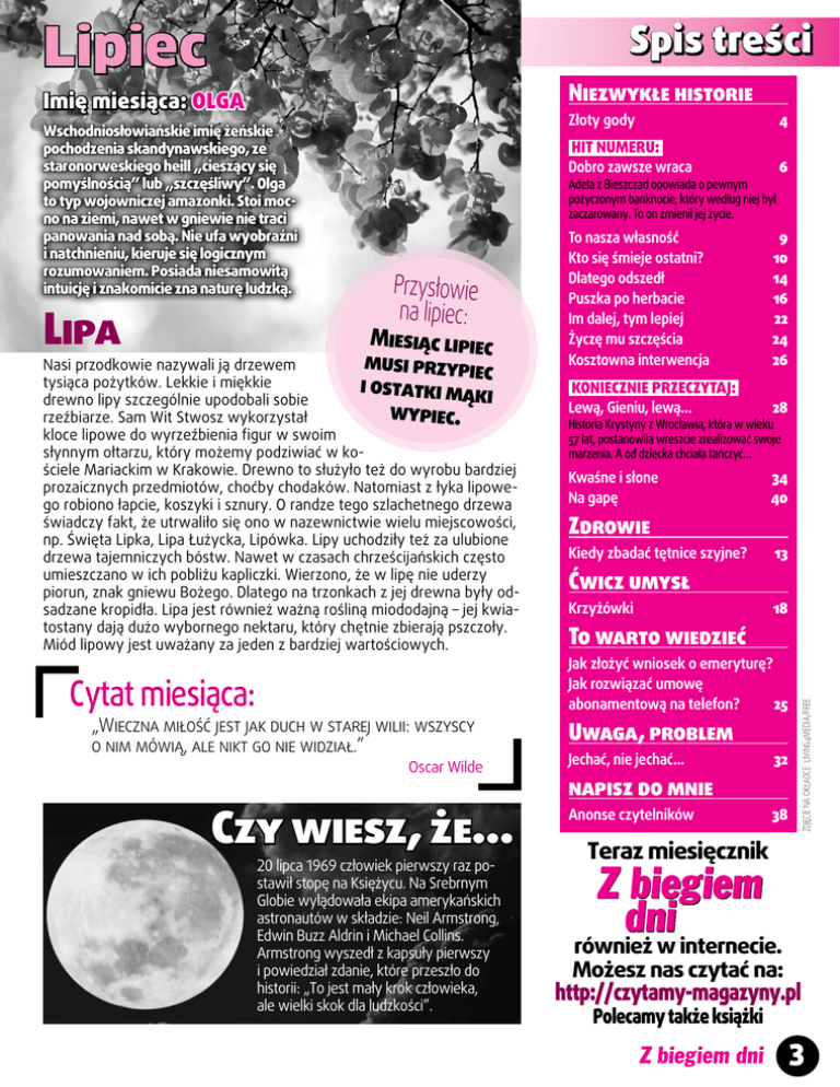 Spis treści Lipiec Niezwykłe historie Imię miesiąca: OLGA Wschodniosłowiańskie imię żeńskie pochodzenia skandynawskiego, ze staronorweskiego heill „cieszący się pomyślnością” lub „szczęśliwy”. Olga to typ wojowniczej amazonki. Stoi mocno na ziemi, nawet w gniewie nie traci panowania nad sobą. Nie ufa wyobraźni i natchnieniu, kieruje się logicznym rozumowaniem. Posiada niesamowitą intuicję i znakomicie zna naturę ludzką. 4 HIT NUMERU: Dobro zawsze wraca 6 Adela z Bieszczad opowiada o pewnym pożyczonym banknocie, który według niej był zaczarowany. To on zmienił jej życie. Przysłowie na lipiec: Miesiąc lipiec musi przypiec i ostatki mąki wypiec. Nasi przodkowie nazywali ją drzewem tysiąca pożytków. Lekkie i miękkie drewno lipy szczególnie upodobali sobie rzeźbiarze. Sam Wit Stwosz wykorzystał kloce lipowe do wyrzeźbienia figur w swoim słynnym ołtarzu, który możemy podziwiać w kościele Mariackim w Krakowie. Drewno to służyło też do wyrobu bardziej prozaicznych przedmiotów, choćby chodaków. Natomiast z łyka lipowego robiono łapcie, koszyki i sznury. O randze tego szlachetnego drzewa świadczy fakt, że utrwaliło się ono w nazewnictwie wielu miejscowości, np. Święta Lipka, Lipa Łużycka, Lipówka. Lipy uchodziły też za ulubione drzewa tajemniczych bóstw. Nawet w czasach chrześcijańskich często umieszczano w ich pobliżu kapliczki. Wierzono, że w lipę nie uderzy piorun, znak gniewu Bożego. Dlatego na trzonkach z jej drewna były odsadzane kropidła. Lipa jest również ważną rośliną miododajną – jej kwiatostany dają dużo wybornego nektaru, który chętnie zbierają pszczoły. Miód lipowy jest uważany za jeden z bardziej wartościowych. To nasza własność Kto się śmieje ostatni? Dlatego odszedł Puszka po herbacie Im dalej, tym lepiej Życzę mu szczęścia Kosztowna interwencja 9 10 14 16 22 24 26 KONIECZNIE PRZECZYTAJ: Lewą, Gieniu, lewą… 28 Historia Krystyny z Wrocławia, która w wieku 57 lat, postanowiła wreszcie zrealizować swoje marzenia. A od dziecka chciała tańczyć… Kwaśne i słone Na gapę 34 40 Zdrowie Kiedy zbadać tętnice szyjne? 13 Ćwicz umysł Krzyżówki 18 To warto wiedzieć Jak złożyć wniosek o emeryturę? Jak rozwiązać umowę abonamentową na telefon? 25 Cytat miesiąca: „Wieczna miłość jest jak duch w starej wilii: wszyscy o nim mówią, ale nikt go nie widział.” Oscar Wilde Czy wiesz, że… 20 lipca 1969 człowiek pierwszy raz postawił stopę na Księżycu. Na Srebrnym Globie wylądowała ekipa amerykańskich astronautów w składzie: Neil Armstrong, Edwin Buzz Aldrin i Michael Collins. Armstrong wyszedł z kapsuły pierwszy i powiedział zdanie, które przeszło do historii: „To jest mały krok człowieka, ale wielki skok dla ludzkości”. ZDJĘCIE NA OKŁADCE: LIVING4MEDIA/FREE Lipa Złoty gody Uwaga, problem Jechać, nie jechać… 32 napisz do mnie Anonse czytelników 38 Teraz miesięcznik również w internecie. Możesz nas czytać na: http://czytamy-magazyny.pl Polecamy także książki 3