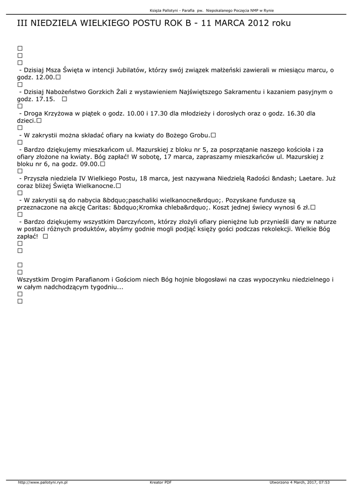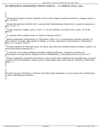 Księża Pallotyni - Parafia pw. Niepokalanego Poczęcia NMP w Rynie III NIEDZIELA WIELKIEGO POSTU ROK B - 11 MARCA 2012 roku - Dzisiaj Msza Święta w intencji Jubilatów, którzy swój związek małżeński zawierali w miesiącu marcu, o godz. 12.00. - Dzisiaj Nabożeństwo Gorzkich Żali z wystawieniem Najświętszego Sakramentu i kazaniem pasyjnym o godz. 17.15. - Droga Krzyżowa w piątek o godz. 10.00 i 17.30 dla młodzieży i dorosłych oraz o godz. 16.30 dla dzieci. - W zakrystii można składać ofiary na kwiaty do Bożego Grobu. - Bardzo dziękujemy mieszkańcom ul. Mazurskiej z bloku nr 5, za posprzątanie naszego kościoła i za ofiary złożone na kwiaty. Bóg zapłać! W sobotę, 17 marca, zapraszamy mieszkańców ul. Mazurskiej z bloku nr 6, na godz. 09.00. - Przyszła niedziela IV Wielkiego Postu, 18 marca, jest nazywana Niedzielą Radości – Laetare. Już coraz bliżej Święta Wielkanocne. - W zakrystii są do nabycia „paschaliki wielkanocne”. Pozyskane fundusze są przeznaczone na akcję Caritas: „Kromka chleba”. Koszt jednej świecy wynosi 6 zł. - Bardzo dziękujemy wszystkim Darczyńcom, którzy złożyli ofiary pieniężne lub przynieśli dary w naturze w postaci różnych produktów, abyśmy godnie mogli podjąć księży gości podczas rekolekcji. Wielkie Bóg zapłać! Wszystkim Drogim Parafianom i Gościom niech Bóg hojnie błogosławi na czas wypoczynku niedzielnego i w całym nadchodzącym tygodniu... http://www.pallotyni.ryn.pl Kreator PDF Utworzono 4 March, 2017, 07:53