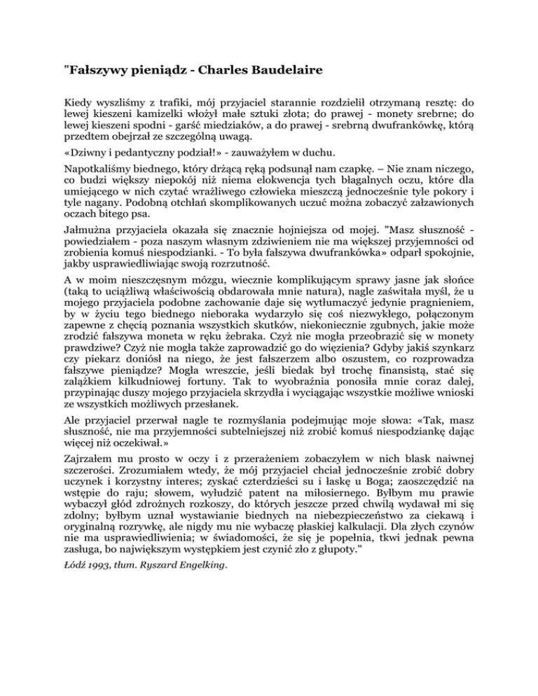 "Fałszywy pieniądz - Charles Baudelaire Kiedy wyszliśmy z trafiki, mój przyjaciel starannie rozdzielił otrzymaną resztę: do lewej kieszeni kamizelki włożył małe sztuki złota; do prawej - monety srebrne; do lewej kieszeni spodni - garść miedziaków, a do prawej - srebrną dwufrankówkę, którą przedtem obejrzał ze szczególną uwagą. «Dziwny i pedantyczny podział!» - zauważyłem w duchu. Napotkaliśmy biednego, który drżącą ręką podsunął nam czapkę. – Nie znam niczego, co budzi większy niepokój niż niema elokwencja tych błagalnych oczu, które dla umiejącego w nich czytać wrażliwego człowieka mieszczą jednocześnie tyle pokory i tyle nagany. Podobną otchłań skomplikowanych uczuć można zobaczyć załzawionych oczach bitego psa. Jałmużna przyjaciela okazała się znacznie hojniejsza od mojej. "Masz słuszność powiedziałem - poza naszym własnym zdziwieniem nie ma większej przyjemności od zrobienia komuś niespodzianki. - To była fałszywa dwufrankówka» odparł spokojnie, jakby usprawiedliwiając swoją rozrzutność. A w moim nieszczęsnym mózgu, wiecznie komplikującym sprawy jasne jak słońce (taką to uciążliwą właściwością obdarowała mnie natura), nagle zaświtała myśl, że u mojego przyjaciela podobne zachowanie daje się wytłumaczyć jedynie pragnieniem, by w życiu tego biednego nieboraka wydarzyło się coś niezwykłego, połączonym zapewne z chęcią poznania wszystkich skutków, niekoniecznie zgubnych, jakie może zrodzić fałszywa moneta w ręku żebraka. Czyż nie mogła przeobrazić się w monety prawdziwe? Czyż nie mogła także zaprowadzić go do więzienia? Gdyby jakiś szynkarz czy piekarz doniósł na niego, że jest fałszerzem albo oszustem, co rozprowadza fałszywe pieniądze? Mogła wreszcie, jeśli biedak był trochę finansistą, stać się zalążkiem kilkudniowej fortuny. Tak to wyobraźnia ponosiła mnie coraz dalej, przypinając duszy mojego przyjaciela skrzydła i wyciągając wszystkie możliwe wnioski ze wszystkich możliwych przesłanek. Ale przyjaciel przerwał nagle te rozmyślania podejmując moje słowa: «Tak, masz słuszność, nie ma przyjemności subtelniejszej niż zrobić komuś niespodziankę dając więcej niż oczekiwał.» Zajrzałem mu prosto w oczy i z przerażeniem zobaczyłem w nich blask naiwnej szczerości. Zrozumiałem wtedy, że mój przyjaciel chciał jednocześnie zrobić dobry uczynek i korzystny interes; zyskać czterdzieści su i łaskę u Boga; zaoszczędzić na wstępie do raju; słowem, wyłudzić patent na miłosiernego. Byłbym mu prawie wybaczył głód zdrożnych rozkoszy, do których jeszcze przed chwilą wydawał mi się zdolny; byłbym uznał wystawianie biednych na niebezpieczeństwo za ciekawą i oryginalną rozrywkę, ale nigdy mu nie wybaczę płaskiej kalkulacji. Dla złych czynów nie ma usprawiedliwienia; w świadomości, że się je popełnia, tkwi jednak pewna zasługa, bo największym występkiem jest czynić zło z głupoty." Łódź 1993, tłum. Ryszard Engelking.