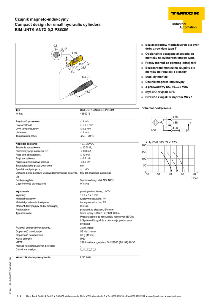 Czujnik magneto-indukcyjny Compact design for small hydraulic cylinders BIM-UNTK-AN7X-0,3-PSG3M ■ Bez akcesoriów montażowych dla cylindrów z rowkiem typu T ■ Opcjonalnie dostępne akcesoria do montażu na cylindrach innego typu. ■ Prosty montaż za pomocą jednej ręki ■ Bezpośredni montaż na czujniku elementów do regulacji i blokady ■ Stabilny montaż ■ Czujnik magneto-indukcyjny ■ 3-przewodowy DC, 10…30 VDC ■ Styk NO, wyjście NPN Edition • 2016-02-19T22:02:50+01:00 ■ Przewód z męskim złączem M8 x 1 Typ Nr kat. BIM-UNTK-AN7X-0,3-PSG3M 4686012 Prędkość przesuwu Powtarzalność Dryft temperaturowy Histereza Temperatura pracy ð 3 m/s ï ± 0.3 mm ð 0.3 mm ð 1 mm -25…+70 °C Napięcie zasilania Tętnienia szczątkowe Nominalny prąd zasilania DC Prąd bez obciążenia I0 Prąd szczątkowy Napięcie znamionowe izolacji Zabezpieczenie przed zwarciem Spadek napięcia przy Ie Ochrona przed przerwą w obwodzie/odwrotną polaryzacją Funkcja wyjścia Częstotliwość przełączania 10… 30VDC ð 10 % Uss ð 100 mA ð 10 mA ð 0.1 mA ð 0.5 kV nie ð 1.4 V tak/ tak (napięcie zasilania) Wykonanie Wymiary Materiał obudowy Materiał powierzchni aktywnej Moment dokręcający śruby mocującej Podłączenie Typ przewodu prostopadłościenna, UNTK 19.7 x 5 x 6 mm tworzywo sztuczne, PP tworzywo sztuczne, PP 0.4 Nm przewód ze złączem, Ø 8 mm 3mm, szary, Lif9Y-11Y, PUR, 0.3 m Przeznaczenie do łańcuchów kablowych (E-ChainSystems®) zgodnie z deklaracją producenta H1063M Przekrój poprzeczny przewodu: Odporność na wibracje Odporność na uderzenia Klasa ochrony MTTF Montaż na następujących profilach Cylindrical design 3 x 0.14mm 55 Hz (1 mm) 30 g (11 ms) IP67 2283 rok/lata zgodnie z SN 29500 (Ed. 99) 40 °C . ENKF Wskaźnik stanu przełączenia LED żółta 1/4 Schemat podłączenia 3-przewodowy, styk NO, NPN 0.3 kHz 2 Hans Turck GmbH & Co.KG ñ D-45472 Mülheim an der Ruhr ñ Witzlebenstraße 7 ñ Tel. 0208 4952-0 ñ Fax 0208 4952-264 ñ [email protected] ñ www.turck.com Czujnik magneto-indukcyjny Compact design for small hydraulic cylinders BIM-UNTK-AN7X-0,3-PSG3M Włożyć czujnik od góry do rowka. Zamocować czujnik zgodnie z poniższym opisem (za pomocą opatentowanej śruby motylkowej): Śruba posiada lewy żeński gwint. Śruba utrzymywana jest we właściwej pozycji przez dwie listewki z tworzywa sztucznego gwarantując gotowość czujnika do instalacji. Przekręcić śrubę zgodnie z kierunkiem obrotu wskazówek zegara. Śruba wychodzi z gwintu i blokuje skrzydełka o górną część rowka. Dzięki temu czujnik jest dociskany i blokowany. Śrubę należy przekręcić o jedną czwartą obrotu za pomocą śrubokręta, zwykłego lub imbusowego 1,5mm. Moment dokręcający 0,4 Nm wystarcza do bezpiecznego montażu i nie naraża czujnik na uszkodzenie. Czujnik wytrzymuje naprężenia radialne i osiowe oddziaływujące na przewód do F=100N. W zestawie znajduje się zacisk kablowy. Umożliwia on poprowadzenie w rowku niewielkiego przewodu. Inne elementy montażowe przeznaczone dla cylindrów o różnych rozmiarach trzeba zama- Edition • 2016-02-19T22:02:50+01:00 wiać osobno. 2/4 Hans Turck GmbH & Co.KG ñ D-45472 Mülheim an der Ruhr ñ Witzlebenstraße 7 ñ Tel. 0208 4952-0 ñ Fax 0208 4952-264 ñ [email protected] ñ www.turck.com Czujnik magneto-indukcyjny Compact design for small hydraulic cylinders BIM-UNTK-AN7X-0,3-PSG3M Akcesoria montażowe Typ Nr kat. UNT-Stopper 4685751 Rysunek wymiarowy Akcesoria zabezpieczające punkt przełączania N na cylindrach z rowkiem typu T; montaż zatrzaskowy na obudowie czujników BIM-UNT; materiał: Tworzywo sztuczne KLZ1-INT 6970410 Akcesoria do instalacji czujników BIM-INT i BIM-UNT na cylindrach cięgnowych; średnica cylindra: 32…40 mm; materiał: Aluminium; na zamówienie inne akcesoria montażowe dla cylindrów o różnych średnicach KLZ2-INT 6970411 Akcesoria do instalacji czujników BIM-INT i BIM-UNT na cylindrach cięgnowych; średnica cylindra: 50…63 mm; materiał: Aluminium; na zamówienie inne akcesoria montażowe dla cylindrów o różnych średnicach UNT-Justage 4685750 Akcesoria do precyzyjnego ustawienia punktu przełączania na cylindrach z rowkami typu T; montaż zatrzaskowy na czujniku BIM-UNT; przeznaczony do wielokrotnego użycia; materiał: Metal/tworzywo sztuczne KLDT-UNT2 6913351 Akcesoria montażowe dla czujnika BIM-UNT montowanego na K cylindrach z rowkiem trapezowym; szerokość rowka: 7 Edition • 2016-02-19T22:02:50+01:00 mm; materiał: PPS 3/4 Hans Turck GmbH & Co.KG ñ D-45472 Mülheim an der Ruhr ñ Witzlebenstraße 7 ñ Tel. 0208 4952-0 ñ Fax 0208 4952-264 ñ [email protected] ñ www.turck.com Czujnik magneto-indukcyjny Compact design for small hydraulic cylinders BIM-UNTK-AN7X-0,3-PSG3M Akcesoria montażowe Typ Nr kat. KLDT-UNT3 6913352 Rysunek wymiarowy Akcesoria montażowe dla czujnika BIM-UNT montowanego na K cylindrach z rowkiem trapezowym; szerokość rowka: 9.4 mm; materiał: PPS KLDT-UNT6 6913355 Montaż na K cylindrach z rowkiem trapezowym; szerokość Edition • 2016-02-19T22:02:50+01:00 rowka: 7.35 mm; materiał: PPS 4/4 Hans Turck GmbH & Co.KG ñ D-45472 Mülheim an der Ruhr ñ Witzlebenstraße 7 ñ Tel. 0208 4952-0 ñ Fax 0208 4952-264 ñ [email protected] ñ www.turck.com