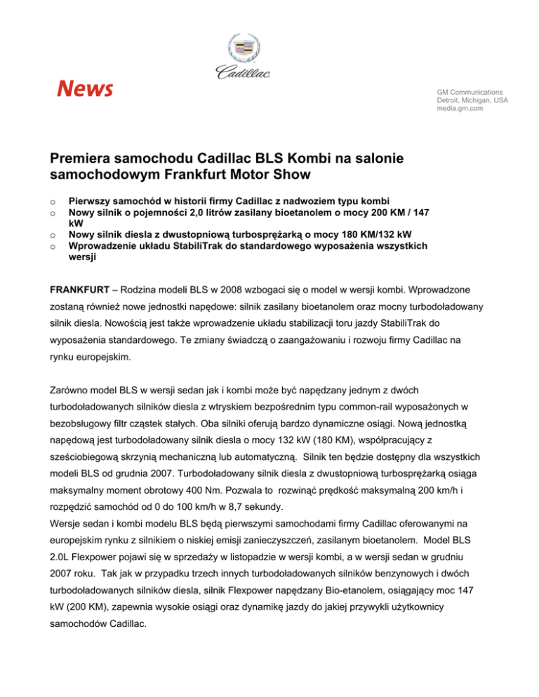 GM Communications Detroit, Michigan, USA media.gm.com Premiera samochodu Cadillac BLS Kombi na salonie samochodowym Frankfurt Motor Show o o o o Pierwszy samochód w historii firmy Cadillac z nadwoziem typu kombi Nowy silnik o pojemności 2,0 litrów zasilany bioetanolem o mocy 200 KM / 147 kW Nowy silnik diesla z dwustopniową turbosprężarką o mocy 180 KM/132 kW Wprowadzenie układu StabiliTrak do standardowego wyposażenia wszystkich wersji FRANKFURT – Rodzina modeli BLS w 2008 wzbogaci się o model w wersji kombi. Wprowadzone zostaną również nowe jednostki napędowe: silnik zasilany bioetanolem oraz mocny turbodoładowany silnik diesla. Nowością jest także wprowadzenie układu stabilizacji toru jazdy StabiliTrak do wyposażenia standardowego. Te zmiany świadczą o zaangażowaniu i rozwoju firmy Cadillac na rynku europejskim. Zarówno model BLS w wersji sedan jak i kombi może być napędzany jednym z dwóch turbodoładowanych silników diesla z wtryskiem bezpośrednim typu common-rail wyposażonych w bezobsługowy filtr cząstek stałych. Oba silniki oferują bardzo dynamiczne osiągi. Nową jednostką napędową jest turbodoładowany silnik diesla o mocy 132 kW (180 KM), współpracujący z sześciobiegową skrzynią mechaniczną lub automatyczną. Silnik ten będzie dostępny dla wszystkich modeli BLS od grudnia 2007. Turbodoładowany silnik diesla z dwustopniową turbosprężarką osiąga maksymalny moment obrotowy 400 Nm. Pozwala to rozwinąć prędkość maksymalną 200 km/h i rozpędzić samochód od 0 do 100 km/h w 8,7 sekundy. Wersje sedan i kombi modelu BLS będą pierwszymi samochodami firmy Cadillac oferowanymi na europejskim rynku z silnikiem o niskiej emisji zanieczyszczeń, zasilanym bioetanolem. Model BLS 2.0L Flexpower pojawi się w sprzedaży w listopadzie w wersji kombi, a w wersji sedan w grudniu 2007 roku. Tak jak w przypadku trzech innych turbodoładowanych silników benzynowych i dwóch turbodoładowanych silników diesla, silnik Flexpower napędzany Bio-etanolem, osiągający moc 147 kW (200 KM), zapewnia wysokie osiągi oraz dynamikę jazdy do jakiej przywykli użytkownicy samochodów Cadillac. Nadwozie: pełne ekspresji wzornictwo i wszechstronność samochodu kombi Jako pierwszy samochód typu kombi w 104-letniej historii firmy Cadillac, model BLS jest ważnym produktem w europejskiej strategii handlowej amerykańskiego producenta. Dzięki charakterystycznym dla modeli Cadillac, prostym, wyraźnym i ostrym konturom nadwozia z linią szyb bocznych w formie klina, model BLS Kombi to niezwykle ciekawa propozycja w segmencie samochodów kombi klasy średniej wyższej. „Model BLS Kombi stanowi uzupełnienie oferty firmy Cadillac, skierowanej do klientów poszukujących charakterystycznych samochodów luksusowych, które oferują wszechstronność i osiągi na równi z przyjemnością płynącą z jazdy oraz doskonałymi właściwościami jezdnymi.” mówi Dyrektor Generalny firmy Cadillac Jim Taylor. „Jesteśmy przekonani, że doskonale sobie poradzi na europejskich rynkach i zdobędzie uznanie klientów zainteresowanych samochodami wszechstronnymi i funkcjonalnymi.” Długość modelu BLS Kombi, mierzona od przedniego zderzaka i charakterystycznej chromowanej atrapy przedniej w kształcie litery V do typowych dla samochodów Cadillac pionowych lamp tylnych wykonanych w technologii LED i tylnego zderzaka, wynosi 4716 mm. Dla porównania długość modelu BLS w wersji sedan to 4680 mm. Przy szerokości 2038 mm (łącznie z lusterkami zewnętrznymi) i wysokości 1543 mm (z anteną i relingami dachowymi) BLS łączy w sobie sportową i zwartą sylwetkę z funkcjonalnością i uniwersalnością. Zarówno wersja sedan jak i kombi posiada światła przednie przypominające formą odbłyśników diament, lampy przeciwmgłowe wbudowane w zderzak w kolorze nadwozia oraz szeroki wlot powietrza znajdujący się poniżej atrapy. Wąska, chromowana listwa ozdobna poprowadzona została wzdłuż linii podszybia. Wnętrze: atmosfera luksusu i najnowocześniejszy system multimedialny Cadillac BLS Kombi posiada przestronne i luksusowe wnętrze. Przy rozłożonych fotelach drugiego rzędu przestrzeń bagażowa osiąga pojemność 419 litrów. Pod podłogą znajduje się dodatkowy schowek o pojemności 12 litrów. Przy złożonych fotelach drugiego rzędu pojemność elastycznej i wszechstronnej przestrzeni bagażowej wzrasta do 1285 litrów. Wyposażenie dodatkowe wersji kombi składa się ze srebrnych relingów, przyciemnianych szyb tylnych (za środkowym słupkiem dachowym), srebrnego progu drzwi bagażnika, rolety bagażnika, siatki zabezpieczającej ładunek oraz chromowanych uchwytów do mocowania ładunku. Wnętrze modelu BLS w wersji sedan i kombi wyróżnia się trójramienną, skórzaną kierownicą i zegarem analogowym umieszczonym na konsoli środkowej. Wskaźniki mają czarne tło, białe cyfry i czerwone strzałki. Opcjonalnie dostępne są skórzane fotele i system podgrzewania foteli. Do wyboru są cztery wersje wyposażenia: Business, Elegance, Sport i Luxury. W podstawowej wersji Business znajdują się: 16-calowe tarcze kół ze stopów lekkich, układ stabilizacji toru jazdy StabiliTrak, immobilizer silnika, poduszki powietrzne przednie, poduszki powietrzne boczne, kurtyny powietrzne, komputer pokładowy, trójramienna skórzana kierownica z przyciskami sterującymi, układ automatycznej kontroli prędkości (tempomat), klimatyzacja, zestaw audio z odtwarzaczem płyt CD i siedmioma głośnikami oraz panele wykończenia wnętrza w tonacji „Piano Black”. Poziom wyposażenia Elegance, w porównaniu z wersją Business zawiera dodatkowo: czujnik deszczu, elektrycznie sterowane fotele z regulacją w ośmiu płaszczyznach, dwustrefową klimatyzację i 17-calowe tarcze kół ze stopów lekkich. Wykończenie wnętrza uzupełnia okleina z drewna orzechowego. Cadillac BLS Sport, w porównaniu z poprzednimi wersjami, posiada dodatkowo: 18-calowe tarcze k