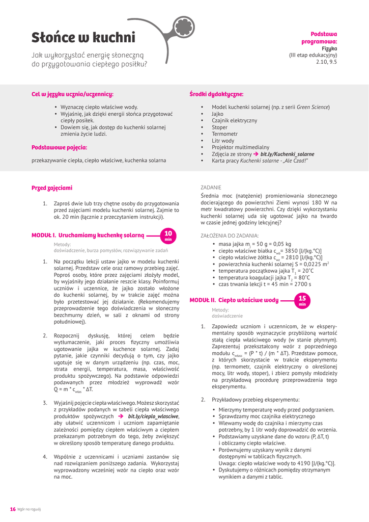 Słońce w kuchni Podstawa programowa: Fizyka (III etap edukacyjny) 2.10, 9.5 Jak wykorzystać energię słoneczną do przygotowania ciepłego posiłku? Cel w języku ucznia/uczennicy: Środki dydaktyczne: yyWyznaczę ciepło właściwe wody. yyWyjaśnię, jak dzięki energii słońca przygotować ciepły posiłek. yyDowiem się, jak dostęp do kuchenki solarnej zmienia życie ludzi. Model kuchenki solarnej (np. z serii Green Science) Jajko Czajnik elektryczny Stoper Termometr Litr wody Projektor multimedialny Zdjęcia ze strony bit.ly/Kuchenki_solarne Karta pracy Kuchenki solarne - „Ale Czad!” przekazywanie ciepła, ciepło właściwe, kuchenka solarna yy yy yy yy yy yy yy yy yy Przed zajęciami ZADANIE Podstawowe pojęcia: 1. Zaproś dwie lub trzy chętne osoby do przygotowania przed zajęciami modelu kuchenki solarnej. Zajmie to ok. 20 min (łącznie z przeczytaniem instrukcji). MODUŁ I. Uruchamiamy kuchenkę solarną 10 min Metody: doświadczenie, burza pomysłów, rozwiązywanie zadań 1. Na początku lekcji ustaw jajko w modelu kuchenki solarnej. Przedstaw cele oraz ramowy przebieg zajęć. Poproś osoby, które przez zajęciami złożyły model, by wyjaśniły jego działanie reszcie klasy. Poinformuj uczniów i uczennice, że jajko zostało włożone do kuchenki solarnej, by w trakcie zajęć można było przetestować jej działanie. (Rekomendujemy przeprowadzenie tego doświadczenia w słoneczny bezchmurny dzień, w sali z oknami od strony południowej). 2. Rozpocznij dyskusję, której celem będzie wytłumaczenie, jaki proces fizyczny umożliwia ugotowanie jajka w kuchence solarnej. Zadaj pytanie, jakie czynniki decydują o tym, czy jajko ugotuje się w danym urządzeniu (np. czas, moc, strata energii, temperatura, masa, właściwość produktu spożywczego). Na podstawie odpowiedzi podawanych przez młodzież wyprowadź wzór Q = m * cwłas * ∆T. 3. Wyjaśnij pojęcie ciepła właściwego. Możesz skorzystać z przykładów podanych w tabeli ciepła właściwego produktów spożywczych bit.ly/cieplo_wlasciwe, aby ułatwić uczennicom i uczniom zapamiętanie zależności pomiędzy ciepłem właściwym a ciepłem przekazanym potrzebnym do tego, żeby zwiększyć w określony sposób temperaturę danego produktu. 4. Wspólnie z uczennicami i uczniami zastanów się nad rozwiązaniem poniższego zadania. Wykorzystaj wyprowadzony wcześniej wzór na ciepło oraz wzór na moc. 16 Wzór na rozwój Średnia moc (natężenie) promieniowania słonecznego docierającego do powierzchni Ziemi wynosi 180 W na metr kwadratowy powierzchni. Czy dzięki wykorzystaniu kuchenki solarnej uda się ugotować jajko na twardo w czasie jednej godziny lekcyjnej? ZAŁOŻENIA DO ZADANIA: yymasa jajka mj = 50 g = 0,05 kg yyciepło właściwe białka cwb= 3850 [J/(kg.°C)] yyciepło właściwe żółtka cwz = 2810 [J/(kg.°C)] yypowierzchnia kuchenki solarnej S = 0,0225 m2 yytemperatura początkowa jajka T1 = 20˚C yytemperatura koagulacji jajka T2 = 80˚C yyczas trwania lekcji t = 45 min = 2700 s MODUŁ II. Ciepło właściwe wody Metody: doświadczenie 15 min 1. Zapowiedz uczniom i uczennicom, że w eksperymentalny sposób wyznaczycie przybliżoną wartość stałą ciepła właściwego wody (w stanie płynnym). Zaprezentuj przekształcony wzór z poprzedniego modułu cwłasc = (P * t) / (m * ∆T). Przedstaw pomoce, z których skorzystacie w trakcie eksperymentu (np. termometr, czajnik elektryczny o określonej mocy, litr wody, stoper), i zbierz pomysły młodzieży na przykładową procedurę przeprowadzenia tego eksperymentu. 2. Przykładowy przebieg eksperymentu: yyMierzymy temperaturę wody przed podgrzaniem. yySprawdzamy moc czajnika elektrycznego yyWlewamy wodę do czajnika i mierzymy czas potrzebny, by 1 litr wody doprowadzić do wrzenia. yyPodstawiamy uzyskane dane do wzoru (P, ∆T, t) i obliczamy ciepło właściwe. yyPorównujemy uzyskany wynik z danymi dostępnymi w tablicach fizycznych. Uwaga: ciepło właściwe wody to 4190 [J/(kg.°C)]. yyDyskutujemy o różnicach pomiędzy otrzymanym wynikiem a danymi z tablic. MODUŁ III. Kuchenka solarna – „Ale Czad!” 15 min Metody: praca w małych grupach, praca ze zdjęciami, prezentacja na forum 1. Zapowiedz, że kolejne zadanie przybliży sytuacje, w których kuchenki solarne dobrze się sprawdzają, a ich wykorzystanie w znaczący sposób wpływa na jakość życia ludzi. 2. Podziel grupę na trzy zespoły i zapowiedz, że każda grupa zajmie się ułożeniem opowieści o tej samej sytuacji, ale z naciskiem na różne wątki przewodnie (możesz podzielić dużą grupę na sześć zespołów – wtedy jednym tematem zajmą się równolegle dwa zespoły). yyWątki społeczno-kulturowe yyWątki środowiskowe yyWątki ekonomiczne 3. Przekaż każdemu z zespołów kartę pracy Kuchenki solarne – „Ale Czad!”. Zadaniem każdego z zespołów jest wybranie tych elementów rozsypanki, które mogą wzbogacić opowieść o wykorzystaniu kuchenek solarnych w obozach dla uchodźców i uchodźczyń w Czadzie (pamiętając o tym, że opowieść ma skupiać się na określonym zagadnieniu). W międzyczasie pokazuj kolejne zdjęcia przedstawiające kuchenki solarne i zachęć do tego, by układane opowieści odnosiły się do wybranych fotografii i objaśniały ich znaczenie bit.ly/Kuchenki_solarne. 4. Poproś kolejne zespoły o przedstawienie przygotowanych przez nie opowieści. Każdą z historii warto nagrodzić brawami. 5. W podsumowaniu możesz ponownie zapytać, jak młodzież ocenia przydatność kuchenek solarnych i wykorzystanie energii słońca do przygotowania posiłku. 6. Na zakończenie wspólnie sprawdźcie, czy udało się ugotować jajko. W zależności od nasłonecznienia efekty tego doświadczenia mogą być różne – dopytaj młodzież od czego zależało powodzenie lub niepowodzenie eksperymentu. Porównajcie wynik eksperymentu z wynikami zadania trzeciego z modułu pierwszego. EWALUACJA ZAJĘĆ 5 min Metody: praca indywidu