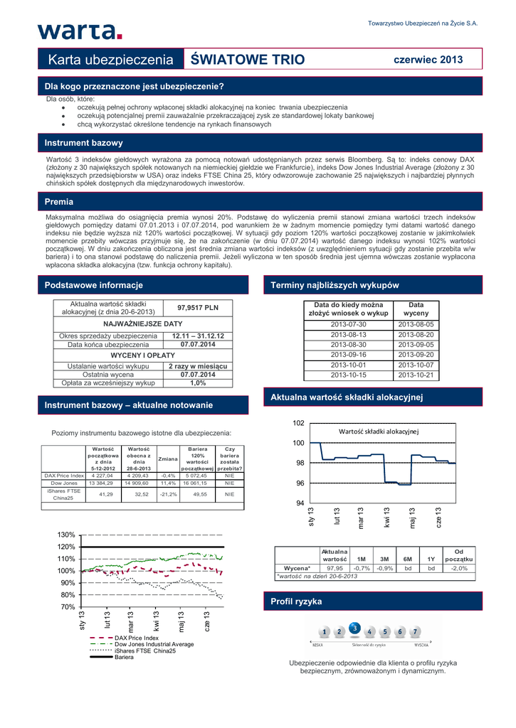 Towarzystwo Ubezpieczeń na Życie S.A. ŚWIATOWE TRIO Karta ubezpieczenia czerwiec 2013 Dla kogo przeznaczone jest ubezpieczenie? Dla osób, które: oczekują pełnej ochrony wpłaconej składki alokacyjnej na koniec trwania ubezpieczenia oczekują potencjalnej premii zauważalnie przekraczającej zysk ze standardowej lokaty bankowej chcą wykorzystać określone tendencje na rynkach finansowych Instrument bazowy Wartość 3 indeksów giełdowych wyrażona za pomocą notowań udostępnianych przez serwis Bloomberg. Są to: indeks cenowy DAX (złożony z 30 największych spółek notowanych na niemieckiej giełdzie we Frankfurcie), indeks Dow Jones Industrial Average (złożony z 30 największych przedsiębiorstw w USA) oraz indeks FTSE China 25, który odwzorowuje zachowanie 25 największych i najbardziej płynnych chińskich spółek dostępnych dla międzynarodowych inwestorów. Premia Maksymalna możliwa do osiągnięcia premia wynosi 20%. Podstawę do wyliczenia premii stanowi zmiana wartości trzech indeksów giełdowych pomiędzy datami 07.01.2013 i 07.07.2014, pod warunkiem że w żadnym momencie pomiędzy tymi datami wartość danego indeksu nie będzie wyższa niż 120% wartości początkowej. W sytuacji gdy poziom 120% wartości początkowej zostanie w jakimkolwiek momencie przebity wówczas przyjmuje się, że na zakończenie (w dniu 07.07.2014) wartość danego indeksu wynosi 102% wartości początkowej. W dniu zakończenia obliczona jest średnia zmiana wartości indeksów (z uwzględnieniem sytuacji gdy zostanie przebita w/w bariera) i to ona stanowi podstawę do naliczenia premii. Jeżeli wyliczona w ten sposób średnia jest ujemna wówczas zostanie wypłacona wpłacona składka alokacyjna (tzw. funkcja ochrony kapitału). Terminy najbliższych wykupów Podstawowe informacje Aktualna wartość składki alokacyjnej (z dnia 20-6-2013) 97,9517 PLN Data do kiedy można złożyć wniosek o wykup Data wyceny 2013-07-30 2013-08-13 2013-08-30 2013-09-16 2013-10-01 2013-10-15 2013-08-05 2013-08-20 2013-09-05 2013-09-20 2013-10-07 2013-10-21 NAJWAŻNIEJSZE DATY 12.11 – 31.12.12 07.07.2014 Okres sprzedaży ubezpieczenia Data końca ubezpieczenia WYCENY I OPŁATY 2 razy w miesiącu 07.07.2014 1,0% Ustalanie wartości wykupu Ostatnia wycena Opłata za wcześniejszy wykup Aktualna wartość składki alokacyjnej Instrument bazowy – aktualne notowanie 102 Wartość składki alokacyjnej Poziomy instrumentu bazowego istotne dla ubezpieczenia: Wartość początkowa z dnia 5-12-2012 DAX Price Index 4 227,04 Dow Jones Industrial iShares FTSE China25 Wartość obecna z dnia 28-6-2013 4 209,43 100 Zmiana -0,4% Bariera Czy 120% bariera wartości została początkowej przebita? 5 072,45 NIE 13 384,29 14 909,60 11,4% 16 061,15 NIE 41,29 32,52 -21,2% 49,55 NIE 98 96 cze 13 maj 13 kwi 13 mar 13 lut 13 sty 13 94 130% 120% Aktualna wartość 110% 1M Wycena* 97,95 -0,7% *wartość na dzień 20-6-2013 100% 3M 6M 1Y Od początku -0,9% bd bd -2,0% 90% 80% Profil ryzyka DAX Price Index Dow Jones Industrial Average iShares FTSE China25 Bariera cze 13 maj 13 kwi 13 mar 13 lut 13 sty 13 70% Ubezpieczenie odpowiednie dla klienta o profilu ryzyka bezpiecznym, zrównoważonym i dynamicznym. Komentarz rynkowy Rok 2013 okazał się być dobry dla indeksów akcji krajów rozwiniętych oraz nienajlepszy dla indeksów akcji krajów rozwijających się. Ta tendencja jest widoczna w tabelce z wynikami poszczególnych indeksów składających się na produkt, jaka jest zamieszczona na poprzedniej stronie. Indeks amerykański zyskał od momentu startu produktu ponad 10%, niemiecki niemal nie zmienił wartości (choć przez większość czasu był na plusie), a chiński stracił niemal 20%. Duża część spadków indeksu iShares FTSE China25 miała miejsce począwszy od maja 2013, kiedy amerykański bank centralny (FED) zapowiedział możliwość ograniczenia programu drukowania pieniądza. To wraz z problemami na chińskim rynku pożyczek międzybankowych i obaw o kondycje tamtejszych banków doprowadziło do spadków. Oba te negatywne czynniki zaczęły jednak w ostatnim czasie słabnąć. FED sprostował swoje wcześniejsze wypowiedzi sugerując, że wycofanie z programu dodruku może nastąpić później niż rynek zaczął oczekiwać, a sytuacja na rynku bankowym w Chinach unormowała się. Wszystko to pozwala mieć nadzieje, że po słabszym maju i czerwcu najbliższy czas przyniesie przynajmniej częściowe odreagowanie niedawnych spadków. Kontakt Informacje na temat ubezpieczeń TUnŻ WARTA S.A. można uzyskać pod numerem infolinii: z telefonu stacjonarnego 801 308 308 z telefonu komórkowego +48 502 308 308 Nota prawna i informacje o firmie TUnŻ WARTA S.A. NOTA PRAWNA Wszelkie opinie i oceny zawarte w niniejszym opracowaniu wyrażają opinie Ubezpieczyciela w dniu jego wydania. Opracowanie przygotowano dochowując należytej staranności, wykorzystując źródła informacji, które Ubezpieczyciel uważa za wiarygodne i dokładne, jednakże nie istnieje gwarancja, iż są one wyczerpujące i w pełni odzwierciedlają stan faktyczny. Wykresy i diagramy przedstawione w niniejszym opracowaniu mają charakter wyłącznie ilustracyjny, nie są one ani doradztwem inwestycyjnym, ani prognozą. Ubezpieczyciel nie świadczy usług doradztwa inwestycyjnego, ani nie udziela porad inwestycyjnych, a informacje nie mają w żadnym wypadku charakteru porady inwestycyjnej. Szczegółowe informacje dotyczące umowy ubezpieczenia znajdują się w Ogólnych Warunkach Ubezpieczenia dostępnych w placówkach Ubezpieczyciela i/lub stronie internetowej www.warta.pl. Przed zawarciem umowy Klient samodzielnie określa poziom akceptowalnego przez siebie ryzyka, potencjalne korzyści oraz straty z nią związane, jak również w szczególności charakterystykę, konsekwencje prawne, podatkowe i księgowe umowy. Powielanie bądź publikowanie niniejszego opracowania lub jego części bez pisemnej zgody Ubezpieczyciela jest zabronion