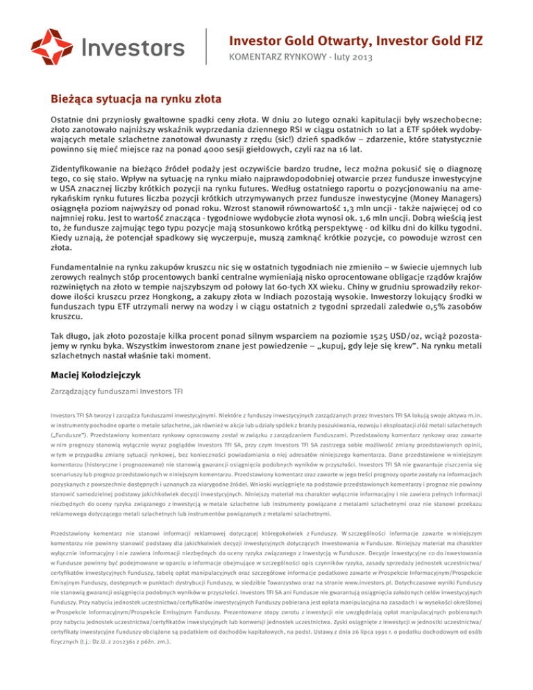 Investor Gold Otwarty, Investor Gold FIZ KOMENTARZ RYNKOWY - luty 2013 Bieżąca sytuacja na rynku złota Ostatnie dni przyniosły gwałtowne spadki ceny złota. W dniu 20 lutego oznaki kapitulacji były wszechobecne: złoto zanotowało najniższy wskaźnik wyprzedania dziennego RSI w ciągu ostatnich 10 lat a ETF spółek wydobywających metale szlachetne zanotował dwunasty z rzędu (sic!) dzień spadków – zdarzenie, które statystycznie powinno się mieć miejsce raz na ponad 4000 sesji giełdowych, czyli raz na 16 lat. Zidentyfikowanie na bieżąco źródeł podaży jest oczywiście bardzo trudne, lecz można pokusić się o diagnozę tego, co się stało. Wpływ na sytuację na rynku miało najprawdopodobniej otwarcie przez fundusze inwestycyjne w USA znacznej liczby krótkich pozycji na rynku futures. Według ostatniego raportu o pozycjonowaniu na amerykańskim rynku futures liczba pozycji krótkich utrzymywanych przez fundusze inwestycyjne (Money Managers) osiągnęła poziom najwyższy od ponad roku. Wzrost stanowił równowartość 1,3 mln uncji - także najwięcej od co najmniej roku. Jest to wartość znacząca - tygodniowe wydobycie złota wynosi ok. 1,6 mln uncji. Dobrą wieścią jest to, że fundusze zajmując tego typu pozycje mają stosunkowo krótką perspektywę - od kilku dni do kilku tygodni. Kiedy uznają, że potencjał spadkowy się wyczerpuje, muszą zamknąć krótkie pozycje, co powoduje wzrost cen złota. Fundamentalnie na rynku zakupów kruszcu nic się w ostatnich tygodniach nie zmieniło – w świecie ujemnych lub zerowych realnych stóp procentowych banki centralne wymieniają nisko oprocentowane obligacje rządów krajów rozwiniętych na złoto w tempie najszybszym od połowy lat 60-tych XX wieku. Chiny w grudniu sprowadziły rekordowe ilości kruszcu przez Hongkong, a zakupy złota w Indiach pozostają wysokie. Inwestorzy lokujący środki w funduszach typu ETF utrzymali nerwy na wodzy i w ciągu ostatnich 2 tygodni sprzedali zaledwie 0,5% zasobów kruszcu. Tak długo, jak złoto pozostaje kilka procent ponad silnym wsparciem na poziomie 1525 USD/oz, wciąż pozostajemy w rynku byka. Wszystkim inwestorom znane jest powiedzenie – „kupuj, gdy leje się krew”. Na rynku metali szlachetnych nastał właśnie taki moment. Maciej Kołodziejczyk Zarządzający funduszami Investors TFI Investors TFI SA tworzy i zarządza funduszami inwestycyjnymi. Niektóre z funduszy inwestycyjnych zarządzanych przez Investors TFI SA lokują swoje aktywa m.in. w instrumenty pochodne oparte o metale szlachetne, jak również w akcje lub udziały spółek z branży poszukiwania, rozwoju i eksploatacji złóż metali szlachetnych („Fundusze”). Przedstawiony komentarz rynkowy opracowany został w związku z zarządzaniem Funduszami. Przedstawiony komentarz rynkowy oraz zawarte w nim prognozy stanowią wyłącznie wyraz poglądów Investors TFI SA, przy czym Investors TFI SA zastrzega sobie możliwość zmiany przedstawionych opinii, w tym w przypadku zmiany sytuacji rynkowej, bez konieczności powiadamiania o niej adresatów niniejszego komentarza. Dane przedstawione w niniejszym komentarzu (historyczne i prognozowane) nie stanowią gwarancji osiągnięcia podobnych wyników w przyszłości. Investors TFI SA nie gwarantuje ziszczenia się scenariuszy lub prognoz przedstawionych w niniejszym komentarzu. Przedstawiony komentarz oraz zawarte w jego treści prognozy oparte zostały na informacjach pozyskanych z powszechnie dostępnych i uznanych za wiarygodne źródeł. Wnioski wyciągnięte na podstawie przedstawionych komentarzy i prognoz nie powinny stanowić samodzielnej podstawy jakichkolwiek decyzji inwestycyjnych. Niniejszy materiał ma charakter wyłącznie informacyjny i nie zawiera pełnych informacji niezbędnych do oceny ryzyka związanego z inwestycją w metale szlachetne lub instrumenty powiązane z metalami szlachetnymi oraz nie stanowi przekazu reklamowego dotyczącego metali szlachetnych lub instrumentów powiązanych z metalami szlachetnymi. Przedstawiony komentarz nie stanowi informacji reklamowej dotyczącej któregokolwiek z Funduszy. W szczególności informacje zawarte w niniejszym komentarzu nie powinny stanowić podstawy dla jakichkolwiek decyzji inwestycyjnych dotyczących inwestowania w Fundusze. Niniejszy materiał ma charakter wyłącznie informacyjny i nie zawiera informacji niezbędnych do oceny ryzyka związanego z inwestycją w Fundusze. Decyzje inwestycyjne co do inwestowania w Fundusze powinny być podejmowane w oparciu o informacje obejmujące w szczególności opis czynników ryzyka, zasady sprzedaży jednostek uczestnictwa/ certyfikatów inwestycyjnych Funduszy, tabelę opłat manipulacyjnych oraz szczegółowe informacje podatkowe zawarte w Prospekcie Informacyjnym/Prospekcie Emisyjnym Funduszy, dostępnych w punktach dystrybucji Funduszy, w siedzibie Towarzystwa oraz na stronie www.investors.pl. Dotychczasowe wyniki Funduszy nie stanowią gwarancji osiągnięcia podobnych wyników w przyszłości. Investors TFI SA ani Fundusze nie gwarantują osiągnięcia założonych celów inwestycyjnych Funduszy. Przy nabyciu jednostek uczestnictwa/certyfikatów inwestycyjnych Funduszy pobierana jest opłata manipulacyjna na zasadach i w wysokości określonej w Prospekcie Informacyjnym/Prospekcie Emisyjnym Funduszy. Prezentowane stopy zwrotu z inwestycji nie uwzględniają opłat manipulacyjnych pobieranych przy nabyciu jednostek uczestnictwa/certyfikatów inwestycyjnych lub konwersji jednostek uczestnictwa. Zyski osiągnięte z inwestycji w jednostki uczestnictwa/ certyfikaty inwestycyjne Funduszy obciążone są podatkiem od dochodów kapitałowych, na podst. Ustawy z dnia 26 lipca 1991 r. o podatku dochodowym od osób fizycznych (t.j.: Dz.U. z 2012361 z późn. zm.). 1/4