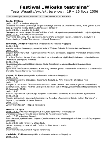 Festiwal „Wioska teatralna” Teatr Węgajty/projekt terenowy, 19 – 26 lipca 2006 Cz.I: WEWNĘTRZNE POGRANICZE - THE INNER BORDERLAND środa, 19 lipca godz. 18.00, w teatrze Węgajty Otwarcie festiwalu: promocja książki Andrzeja Suryna pt. Posłaniec słowa, wyd. jokov 2006 oraz powitanie rzeźby Jacka Adamasa pt. Strażnik godz. 20.00, w drodze do Godek Domograj, widowisko grupy „Strażników Północy” z Godek, oparte na opowieściach ludzi z najbliższej okolicy godz. 21.30, plac wiejski w Godkach muzyczno-taneczny finał spektaklu Domograj z udziałem kapeli „Jazgodki”, muzyków z Cieszyńskiego Studia Teatralnego i „Kapeli Terenowej” czwartek, 20 lipca (wszystkie wydarzenia w teatrze Węgajty) godz. 10.30 warsztat projektu terenowego, prowadzą Justyna Wielgus, Erdmute Sobaszek, Wacław Sobaszek godz. 18.00 projekt terenowy 2006 –wprowadzenie: Wacław Sobaszek, zdjęcia: Franciszek Strzeszewski godz. 18.00 In stillen Teichen lauern Krokodile (W cichych stawach czyhają Krokodyle) filmowa instalacja Marcela Odenbacha, poświęcona Rwandzie godz. 19.00 Kawkaskij priwiet, spektakl Cieszyńskiego Studia Teatralnego w reżyserii Bogdana Słupczyńskiego godz. 22.00 spotkanie z twórcami spektaklu Kawkaskij priwiet, pokaz materiałów filmowych o działalności Ośrodka Teatru Kultur w Morochowie piątek, 21 lipca (wszystkie wydarzenia w teatrze Węgajty) godz. 10.30 warsztat teatralny, prowadzą: Katarzyna Regulska, Amy Howard i Christine Fink godz. 17.00 Balagan – dokument filmowy o działalności Acco Theatre Centre na pograniczu izraelskopalestyńskim, autor: Andres Veiel prod. Niemcy 1993 (Uwaga, pokaz może zostać przeniesiony na 23. lipca, godz. 23.00) godz. 18.45 Ścieżki pogranicza – promocja książki i spotkanie z autorem, Krzysztofem Czyżewskim godz. 20.15 Kroniki sejneńskie, spektakl stworzony w Ośrodku „Pogranicze Sztuk, Kultur, Narodów” w Sejnach, reżyseria: Bożena Szreder godz. 21.00 „Ostry kurs tańca” – Kapela Terenowa sobota, 22 lipca godz. 10.30 w teatrze Węgajty lub na „łące cyrkowej” w Węgajtach warsztat samby, prowadzi João Carlos do Nascimento Maria. godz. 17.30 w teatrze Węgajty Rasa pieczątek, spektakl teatru „Migrator”, realizowany z przez mieszkających w Polsce uchodźców, reżyseria: Simon Mol godz. 20.00 koło remizy w Węgajtach pokaz capoeiry, prowadzi João Carlos do Nascimento Maria. godz. 21.00 Ostry kurs tańca, koncert Kapeli Terenowej niedziela, 23 lipca (wszystkie wydarzenia w teatrze Węgajty) godz. 10.30 pokaz pracy Danieli Altieri (Włochy) godz. 12.00 spotkanie z Simonem Molem, poetą z Kamerunu i reżyserem Rasy pieczątek oraz zespołem „Migrator” Cz. II: PEDAGOGIKA TEATRALNA W AKCJI godz. 17.00 Myszy istnieją, spektakl w wykonaniu Oli Kosakowskiej i Janka Sobaszka, muz.: Wacław Sobaszek, dla dzieci i dorosłych według baśni indiańskiej, „remake” spektaklu „Pracowni Olsztyńskiej” z r. 1981 godz. 17.30 Gry teatralne i łagodny kurs tańca – dla dzieci godz. 18.00 koncert dla dzieci w wykonaniu zespołu „Sol et Luna” godz. 19.00 Krzysztof Łepkowski – od Pracowni Olsztyńskiej” do „Strażników Północy, wspomnienie: Anna Wyka Das Carla Chamäleon Nordstadt-Buch – prezentacja projektu, realizowanego z udziałem dzieci północnych dzielnic Dortmundu, zamieszkałych w dużej mierze przez imigrantów różnych narodowości (Basia Szpunier i Emilia Hagelganz) _______________________________________________________________ godz. 21.30 Performanse Artura Grabowskiego – pokaz DVD: Menu polskie, Visiting guest, Oktober Fest, Sukcesor Cz. III: TRADYCJE poniedziałek, 24 lipca godz. 10.30 warsztat śpiewu, prowadzi Mieczysław Litwiński godz. 18.00 Ostry Kurs Tańca – kontynuacja godz. 20.00 spotkanie z Krzysztofem Renikiem, znawcą teatru Dalekiego Wschodu, pokaz filmów Krzysztofa Renika i Elżbiety Dziuk spotkanie z mnichami z Tybetu: A-Jam Lugzi i Sherap Dhargye starają się w Polsce o status uchodźcy. Cz.: IV IMPROWIZACJE wtorek, 25 lipca godz. 10.30 warsztat wokalnej improwizacji, prowadzi Zofia Bartoszewicz godz. 19.00 improwizacje wokalne: spotkanie-koncert Zofii Bartoszewicz godz. 21.00 Multigodki – wydarzenie multimedialno-poetycko-muzyczne, realizacja: „Rajd Maszyn” na łące w Godkach ŚRODA, 26 lipca: ZAKOŃCZENIE FESTIWALU Rezerwujemy czas na działanie warsztatowe, którego formuła powstanie w trakcie festiwalu, we współpracy z osobami, prowadzącymi warsztaty. Podziękowania: Marcel Odenbach, Tadeusz Burniewicz, Tomasz Łepkowski iArtur Grabowski, Adam Jankiewicz Organizatorzy: Centrum Edukacji i Inicjatyw Kulturalnych w Olsztynie Stowarzyszenie „Teatr Węgajty” Kontakt i biuro organizacyjne: 11-042 Jonkowo, wieś Węgajty 18 tel./fax.: 089 512 92 97, e-mail: [email protected] Patronat: Prezydent Miasta Olsztyn Czesław Jerzy Małkowski Sponsorzy: Ministerstwo Kultury i Dziedzictwa Narodowego Program „Rozwój inicjatyw lokalnych” Fundacja PZU Warmiński Bank Spółdzielczy w Jonkowie Urząd Marszałkowski województwa warmińsko-mazurskiego Barbara Rang