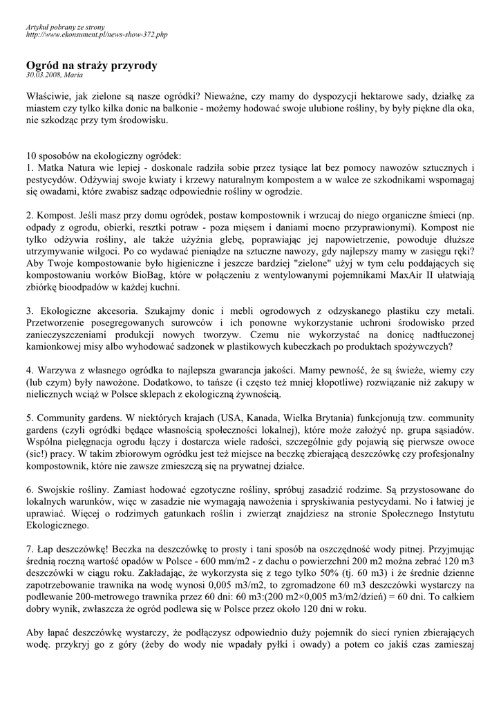 Artykuł pobrany ze strony http://www.ekonsument.pl/news-show-372.php Ogród na straży przyrody 30.03.2008, Maria Właściwie, jak zielone są nasze ogródki? Nieważne, czy mamy do dyspozycji hektarowe sady, działkę za miastem czy tylko kilka donic na balkonie - możemy hodować swoje ulubione rośliny, by były piękne dla oka, nie szkodząc przy tym środowisku. 10 sposobów na ekologiczny ogródek: 1. Matka Natura wie lepiej - doskonale radziła sobie przez tysiące lat bez pomocy nawozów sztucznych i pestycydów. Odżywiaj swoje kwiaty i krzewy naturalnym kompostem a w walce ze szkodnikami wspomagaj się owadami, które zwabisz sadząc odpowiednie rośliny w ogrodzie. 2. Kompost. Jeśli masz przy domu ogródek, postaw kompostownik i wrzucaj do niego organiczne śmieci (np. odpady z ogrodu, obierki, resztki potraw - poza mięsem i daniami mocno przyprawionymi). Kompost nie tylko odżywia rośliny, ale także użyźnia glebę, poprawiając jej napowietrzenie, powoduje dłuższe utrzymywanie wilgoci. Po co wydawać pieniądze na sztuczne nawozy, gdy najlepszy mamy w zasięgu ręki? Aby Twoje kompostowanie było higieniczne i jeszcze bardziej "zielone" użyj w tym celu poddających się kompostowaniu worków BioBag, które w połączeniu z wentylowanymi pojemnikami MaxAir II ułatwiają zbiórkę bioodpadów w każdej kuchni. 3. Ekologiczne akcesoria. Szukajmy donic i mebli ogrodowych z odzyskanego plastiku czy metali. Przetworzenie posegregowanych surowców i ich ponowne wykorzystanie uchroni środowisko przed zanieczyszczeniami produkcji nowych tworzyw. Czemu nie wykorzystać na donicę nadtłuczonej kamionkowej misy albo wyhodować sadzonek w plastikowych kubeczkach po produktach spożywczych? 4. Warzywa z własnego ogródka to najlepsza gwarancja jakości. Mamy pewność, że są świeże, wiemy czy (lub czym) były nawożone. Dodatkowo, to tańsze (i często też mniej kłopotliwe) rozwiązanie niż zakupy w nielicznych wciąż w Polsce sklepach z ekologiczną żywnością. 5. Community gardens. W niektórych krajach (USA, Kanada, Wielka Brytania) funkcjonują tzw. community gardens (czyli ogródki będące własnością społeczności lokalnej), które może założyć np. grupa sąsiadów. Wspólna pielęgnacja ogrodu łączy i dostarcza wiele radości, szczególnie gdy pojawią się pierwsze owoce (sic!) pracy. W takim zbiorowym ogródku jest też miejsce na beczkę zbierającą deszczówkę czy profesjonalny kompostownik, które nie zawsze zmieszczą się na prywatnej działce. 6. Swojskie rośliny. Zamiast hodować egzotyczne rośliny, spróbuj zasadzić rodzime. Są przystosowane do lokalnych warunków, więc w zasadzie nie wymagają nawożenia i spryskiwania pestycydami. No i łatwiej je uprawiać. Więcej o rodzimych gatunkach roślin i zwierząt znajdziesz na stronie Społecznego Instytutu Ekologicznego. 7. Łap deszczówkę! Beczka na deszczówkę to prosty i tani sposób na oszczędność wody pitnej. Przyjmując średnią roczną wartość opadów w Polsce - 600 mm/m2 - z dachu o powierzchni 200 m2 można zebrać 120 m3 deszczówki w ciągu roku. Zakładając, że wykorzysta się z tego tylko 50% (tj. 60 m3) i że średnie dzienne zapotrzebowanie trawnika na wodę wynosi 0,005 m3/m2, to zgromadzone 60 m3 deszczówki wystarczy na podlewanie 200-metrowego trawnika przez 60 dni: 60 m3:(200 m2×0,005 m3/m2/dzień) = 60 dni. To całkiem dobry wynik, zwłaszcza że ogród podlewa się w Polsce przez około 120 dni w roku. Aby łapać deszczówkę wystarczy, że podłączysz odpowiednio duży pojemnik do sieci rynien zbierających wodę. przykryj go z góry (żeby do wody nie wpadały pyłki i owady) a potem co jakiś czas zamieszaj zawartość, by ją utlenić. Taka woda doskonale nadaje się do podlewania trawnika, roślin w ogródku czy mycia samochodu. 8. Racjonalne podlewanie. Wystarczy przyswoić kilka prostych zasad, by zmniejszyć zużycie wody przy podlewaniu ogrodu. Po pierwsze: zrób to rano, dzięki czemu woda nie będzie intensywnie parować i wiatr nie rozdmucha jej na ścieżki i trawniki. Po drugie, warto pamiętać, że to korzenie roślin potrzebują nawadniania (polewanie liści to zwykle tylko niepotrzebne rozlewanie wody). Korzystnie jest też ułożyć na ziemi warstewkę nawozu, który odżywi rośliny i dłużej utrzyma wilgotne podłoże. 9. Pszczoły i motyle. Działanie pszczół ma wpływ na 35% globalnych zasiewów - przyczyniają się one do zwiększenia plonów w przypadku 87 upraw najważniejszych gatunków na świecie. Od kilku lat Europa i USA przeżywają epidemię braku pszczół. Hodując kwiaty takie jak dziewanna, niecierpiec i niezapominajki, stwarzamy tym owadom oazę w gąszczu spryskiwanych pestycydami upraw. 10. Zagospodaruj nieużytki - jeśli w pobliżu Twoja domu jest pusta działka lub parcela, można wraz z sąsiadami postarać się o prawo do zazielenienia jej. Tak się stało w głośnej sprawie samowolnego założenia parku przez mieszkańców warszawskich Kabat (więcej o inicjatywie na www.naszpark.pl). Co dalej? - Podziel się wiedzą! Skoro już nabyłeś wiedzę i doświadczenie jako ekologiczny działkowicz, czemu nie przekazać jej innym? Opowiedz o tym rodzinie, znajomym i sąsiadom, którzy będą chcieli Cię wysłuchać. - Uzdatnianie wody nie jest już wyłącznie domeną oczyszczalni ścieków. Wodę zużytą podczas zmywania lub kąpieli można przefiltrować i wykorzystać w ogrodzie. Technologia pozwala na najwymyślniejsze przydomowe systemy oczyszczania - jedynym ograniczeniem jest zasobność portfela. Ciekawostki - Mark Harris, autor książki Embracing the Earth, obliczył, że statystyczny Amerykanin wyrzuca rocznie około 700 kg śmieci. Kompostując śmieci organiczne można zmniejszyć tę ilość do ok. 170 kg. - Badania American Journal of Public Health z 1995 roku wskazują na to, że dzieci z domów, w których korzysta się z chemicznych środków owado- i chwastobójczych, w dorosłym życiu