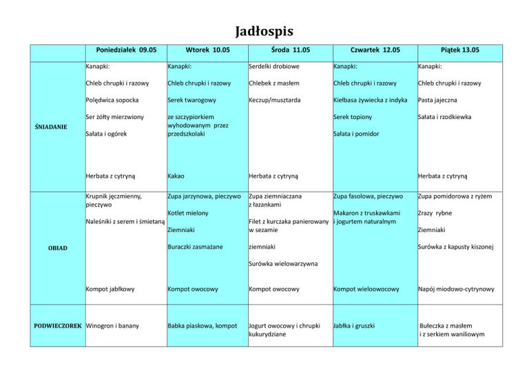 Jadłospis Poniedziałek 09.05 Wtorek 10.05 Środa 11.05 Czwartek 12.05 Piątek 13.05 Kanapki: Kanapki: Serdelki drobiowe Kanapki: Kanapki: Chleb chrupki i razowy Chleb chrupki i razowy Chlebek z masłem Chleb chrupki i razowy Chleb chrupki i razowy Polędwica sopocka Serek twarogowy Keczup/musztarda Kiełbasa żywiecka z indyka Pasta jajeczna Ser żółty mierzwiony Serek topiony Sałata i rzodkiewka Sałata i ogórek ze szczypiorkiem wyhodowanym przez przedszkolaki Herbata z cytryną Kakao Herbata z cytryną Krupnik jęczmienny, pieczywo Zupa jarzynowa, pieczywo Zupa ziemniaczana z łazankami Kotlet mielony Zrazy rybne Ziemniaki Makaron z truskawkami Filet z kurczaka panierowany i jogurtem naturalnym w sezamie Buraczki zasmażane ziemniaki Surówka z kapusty kiszonej ŚNIADANIE Naleśniki z serem i śmietaną OBIAD Sałata i pomidor Herbata z cytryną Zupa fasolowa, pieczywo Zupa pomidorowa z ryżem Ziemniaki Surówka wielowarzywna Kompot jabłkowy PODWIECZOREK Winogron i banany Kompot owocowy Kompot owocowy Kompot wieloowocowy Napój miodowo-cytrynowy Babka piaskowa, kompot Jogurt owocowy i chrupki kukurydziane Jabłka i gruszki Bułeczka z masłem i z serkiem waniliowym