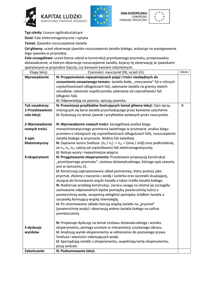 [Wpisz tekst] Typ szkoły: Liceum ogólnokształcące Dział: Fale elektromagnetyczne i optyka Temat: Zjawisko rozszczepienia światła Cel główny: uczeo obserwuje zjawisko rozszczepienia światła białego, wskazuje na występowanie tego zjawiska w przyrodzie. Cele szczegółowe: uczeo bierze udział w konstrukcji prymitywnego pryzmatu, przeprowadza doświadczenie, w którym obserwuje rozszczepienie światła, kojarzy tę obserwację ze zjawiskami spotykanymi w przyrodzie (tęcza), czy barwami kamieni szlachetnych. Etapy lekcji Czynności: nauczyciel (N), uczeo (U). Wprowadzenie N: Przypomnienie najważniejszych pojęd i treści niezbędnych do zrozumienia omawianego tematu: światło białe, „mieszanina” fal o różnych częstotliwościach (długościach fal), załamanie światła na granicy dwóch ośrodków, zależnośd współczynnika załamania od częstotliwości fali (długości fali). U: Odpowiadają na pytania, opisują zjawiska. Tok zasadniczy: N: Prezentacja przykładów ilustrujących temat główny lekcji: Opis tęczy, 1-Przedstawienie mieniących się barw światła przechodzącego przez kamienie szlachetne. celu lekcji. U: Dyskutują na temat zjawisk i przykładów podanych przez nauczyciela. 2-Wprowadzenie nowych treści. 3-opis Matematyczny 4-eksperyment 5-dyskusja wyników Zakooczenie N: Wprowadzenie nowych treści: Szczegółowa analiza biegu monochromatycznego promienia świetlnego w pryzmacie, analiza biegu promieni o różniących się częstotliwościach (długościach fali), rozszczepienie światła białego w pryzmacie. Widmo fali świetlnej. N: Zapisanie wzoru Sneliusa (n2 / n1) = n21 = (sinα / sinβ) oraz podkreślenie, że n2, n1, n21 zależą od częstotliwości fali elektromagnetycznej. U: Notuje wzory i najważniejsze pojęcia. N: Przygotowanie eksperymentu: Przedstawia propozycję konstrukcji „prymitywnego pryzmatu”, zestawu doświadczalnego, którego opis zawarty jest w dwiczeniu 15. U: Konstruują zaproponowany układ pomiarowy, który posłuży jako pryzmat, złożony z naczynia z wodą i lusterka oraz soczewki skupiającej, służącej do formowania wiązki światła a także źródła światła białego. N: Nadzoruje przebieg konstrukcji, zwraca uwagę na istotne jej szczegóły: zachowanie odpowiednich kątów pomiędzy powierzchnią lustra a powierzchnią wody, wzajemną odległośd pomiędzy źródłem światła a soczewką formującą wiązkę równoległą. U: Po zmontowaniu układu kierują wiązkę światła na „pryzmat” (powierzchnię wody) i obserwują widmo światła białego na suficie pomieszczenia. N: Proponuje dyskusję na temat zestawu doświadczalnego i wyniku eksperymentu, pomaga uczniom w interpretacji uzyskanego obrazu. U: Analizują wyniki eksperymentu w odniesieniu do poznanego prawa Sneliusa i własności załamujących wody. U: Sporządzają notatki z eksperymentu, wypełniają kartę eksperymentu, piszą wnioski. N: Podsumowanie lekcji. Zakres R [Wpisz tekst] Karta eksperymentu Temat eksperymentu Instrukcja wykonania Obserwacje (opisujemy w punktach przebieg eksperymentu: przyczyna skutek) Wnioski (odniesienie do teorii) Rozszczepienie światła Sporządzamy układ pomiarowy, który posłuży jako pryzmat, złożony z: naczynia z wodą i lusterka, oraz soczewki skupiającej, służącej do formowania wiązki światła i źródła światła białego, zgodnie z opisem dwiczenia 15. Kierujemy wiązkę światła białego na powierzchnię wody i obserwujemy na ekranie (sufit) barwną wstęgę.