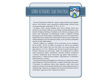 GMINA Ostrowiec Świętokrzyski Ostrowiec Świętokrzyski to blisko 80 – tysięczne, drugie po Kielcach, pod względem obszaru i liczby ludności, miasto województwa świętokrzyskiego. Położenie miasta wyznaczają następujące współrzędne: 50° 56’ N; 21° 23’ E. Od północy miasto otaczają kompleksy leśne Puszczy Iłżeckiej. Zwarte bory, świadectwo pierwotnego krajobrazu puszczańskiego, porastają kilkadziesiąt tysięcy hektarów Przedgórza Iłżeckiego. Od południa zaś do Ostrowca przylegają wyżynne obszary Ziemi Opatowskiej. Od południowego zachodu w krajobrazie dominują lesiste kopuły pasm: Jeleniowskiego i Łysogórskiego prastarych Gór Świętokrzyskich. Dopełnieniem osnowy krajobrazu jest rzeka Kamienna, która od czasów zlodowacenia środkowopolskiego wytworzyła przełomową dolinę, na zboczach której amfiteatralnie rozłożyły się kępy siedzib ludzkich. Ostrowiec znajduje się w odległości 170 km od Warszawy, 65 km od Radomia, 60 km od Kielc i 120 km od Lublina. W promieniu ok. 200 km leżą największe aglomeracje Polski: Kraków, Łódź oraz Górny Śląsk. Przez miasto przebiega ważna droga krajowa nr 9 (E 371) z Radomia, przez Rzeszów do przejścia granicznego ze Słowacją w Barwinku. Inna ważna droga – droga nr 42, przebiega przez trzy główne miasta przemysłowe północy województwa: Skarżysko Kamienną, Starachowice i Ostrowiec Świętokrzyski, łącząc równocześnie jego główne drogi tranzytowe – drogę krajową nr 7 (Kraków-Warszawa-Gdańsk) z drogą krajową nr 74 (Łódź-Kielceprzejście graniczne z Ukrainą). Dwutorowa linia kolejowa przebiegająca przez miasto łączy je z jednej strony z dużym węzłem kolejowym w Skarżysku-Kamiennej, a z drugiej z Tarnobrzegiem, Rzeszowem i Przemyślem. Na współczesne oblicze miasta największy wpływ miała decyzja o budowie w Ostrowcu (na terenie Kątów Denkowskich) nowego zakładu przetwórstwa metalurgicznego. Pojawienie się tej gigantycznej inwestycji spowodowało lawinowy rozwój miasta z jego pozytywnymi i negatywnymi skutkami. COMMUNE Ostrowiec Świętokrzyski Ostrowiec Świętokrzyski is nearly an 80 – thousand city of Świętokrzyskie Province, the second after Kielce in terms of area and population. The location of the city is designated by the following coordinates: 50° 56’N; 21° 23’ E. From the North the city is surrounded by forest complexes of Puszcza Iłżecka. Dense wildwoods, the evidence of original primeval forest landscape, cover a few dozen thousand hectares of Przedgórze Iłżeckie. From the South Ostrowiec borders on upland areas of the land of Opatów. Their dynamic relief represented in twists and turns of defiles and ravines, gorge valleys of the rivers Kamionka and Świślina, is a strong accent of the loess height, developed agriculturally for over six thousand years. In South-West the landscape is dominated by woody ranges: Jeleniowskie and Łysogórskie of primeval Świętokrzyskie Mountains. The landscape is made complete by the river Kamienna, which from the times of the Central Polish glaciation created a gorge valley, on slopes of which clusters of human seats were distributed in an amphitheatrical way. Ostrowiec is located within the distance of 170 km from Warsaw, 65 km from Radom, 60 km from Kielce and 120 km from Lublin. Within a radius of about 200 km there are the largest agglomerations of Poland: Cracow, Łódź and Upper Silesia. An important national road no. 9 (E 371) runs across city from Radom, through Rzeszów to the border crossing point with Slovakia in Barwinek. Another important road no. 42 passes through three main industrial cities in the North of the province: Skarżysko Kamienna, Starachowice and Ostrowiec Świętokrzyski, joining at the same time its main transit roads – national road no. 7 (Cracow-Warsaw-Gdańsk) with national road no. 74 (Łódź-Kielce-border crossing point with Ukraine). Double-track railway line passing through the city joins it from one side with a great railway interchange in Skarżysko-Kamienna and from the other side with Tarnobrzeg, Rzeszów and Przemyśl. The contemporary city was influenced mostly by the decision to build in Ostrowiec (within Kąty Denkowskie) a new metallurgical processing plant. The emergence of this great investment projects resulted in a rapid development of the city with its positive and negative effects.