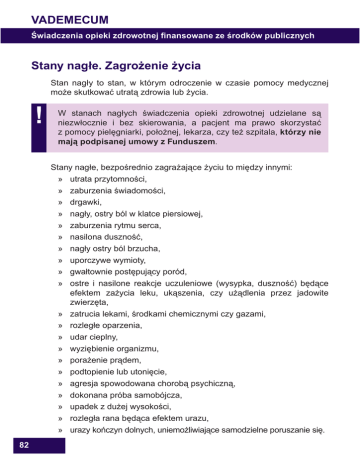 VADEMECUM wiadczenia opieki zdrowotnej Þnansowane ze !rodków publicznych Stany nag"e. Zagro#enie #ycia Stan nag y to stan, w którym odroczenie w czasie pomocy medycznej mo!e skutkowa" utrat# zdrowia lub !ycia. ! W stanach nag ych $wiadczenia opieki zdrowotnej udzielane s# niezw ocznie i bez skierowania, a pacjent ma prawo skorzysta" z pomocy piel%gniarki, po o!nej, lekarza, czy te! szpitala, którzy nie maj$ podpisanej umowy z Funduszem. Stany nag e, bezpo$rednio zagra!aj#ce !yciu to mi%dzy innymi: » utrata przytomno$ci, » zaburzenia $wiadomo$ci, » drgawki, » nag y, ostry ból w klatce piersiowej, » zaburzenia rytmu serca, » nasilona duszno$", » nag y ostry ból brzucha, » uporczywe wymioty, » gwa townie post%puj#cy poród, » ostre i nasilone reakcje uczuleniowe (wysypka, duszno$") b%d#ce efektem za!ycia leku, uk#szenia, czy u!#dlenia przez jadowite zwierz%ta, » zatrucia lekami, $rodkami chemicznymi czy gazami, » rozleg e oparzenia, » udar cieplny, » wyzi%bienie organizmu, » pora!enie pr#dem, » podtopienie lub utoni%cie, » agresja spowodowana chorob# psychiczn#, » dokonana próba samobójcza, » upadek z du!ej wysoko$ci, » rozleg a rana b%d#ca efektem urazu, » urazy ko&czyn dolnych, uniemo!liwiaj#ce samodzielne poruszanie si%. 82 Stany nag"e. Zagro#enie #ycia W sytuacjach bezpo$redniego zagro!enia !ycia pacjenta, nale!y wezwa" karetk% pogotowia ratunkowego. Aby wezwa" pogotowie ratunkowe, nale!y zadzwoni": » z telefonu stacjonarnego na numer 999, » z telefonu komórkowego na numer 999 lub 112. Najwa!niejsze informacje, które nale!y poda" po zg oszeniu dyspozytora: » dok adne miejsce zdarzenia (adres, orientacyjne), » powód wezwania, » kto potrzebuje pomocy, » kto wzywa zespó ratownictwa medycznego. lokalizacja, punkty Nale!y odpowiada" na pytania dyspozytora, dostosowa" si% do jego zalece& w zakresie udzielenia pierwszej pomocy. Przyj%te wezwanie powinno zosta" potwierdzone przez dyspozytora. Ratownictwo medyczne Zadania zwi#zane bezpo$rednio z ratowaniem zdrowia i !ycia w stanach nag ych realizowane s# w ramach systemu ratownictwa medycznego. Po przyje'dzie na miejsce wezwania, ratownicy udzielaj# choremu pierwszej pomocy i – gdy jest taka potrzeba – zawo!# go do szpitala. Pacjent nie ma wp ywu na to, do którego szpitala zostanie przewieziony. Udzielaj#cy pomocy dora'nej zespó ratownictwa medycznego transportuje bowiem chorego do najbli!szej placówki, wskazanej przez dyspozytora lub koordynatora medycznego. Izba przyj%& W przypadku subiektywnego poczucia zagro!enia !ycia lub w sytuacjach nag ych pacjent ma prawo skorzysta" z pomocy dora'nej w szpitalnej izbie przyj%" bez skierowania. W razie konieczno$ci pacjent jest w izbie zabezpieczany medycznie i transportowany do innej, specjalistycznej placówki. Izba przyj%" nie jest miejscem, w którym udzielane s# porady planowe. (wiadczenia planowe pacjent mo!e otrzyma" w ci#gu dnia, w trybie ambulatoryjnym, u swojego lekarza rodzinnego lub lekarza specjalisty. W izbie przyj%" udzielane s# $wiadczenia wy #cznie w trybie nag ym. 83