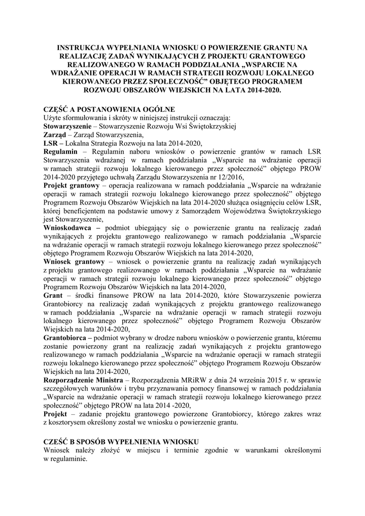 INSTRUKCJA WYPEŁNIANIA WNIOSKU O POWIERZENIE GRANTU NA REALIZACJĘ ZADAŃ WYNIKAJĄCYCH Z PROJEKTU GRANTOWEGO REALIZOWANEGO W RAMACH PODDZIAŁANIA „WSPARCIE NA WDRAŻANIE OPERACJI W RAMACH STRATEGII ROZWOJU LOKALNEGO KIEROWANEGO PRZEZ SPOŁECZNOŚĆ” OBJĘTEGO PROGRAMEM ROZWOJU OBSZARÓW WIEJSKICH NA LATA 2014-2020. CZĘŚĆ A POSTANOWIENIA OGÓLNE Użyte sformułowania i skróty w niniejszej instrukcji oznaczają: Stowarzyszenie – Stowarzyszenie Rozwoju Wsi Świętokrzyskiej Zarząd – Zarząd Stowarzyszenia, LSR – Lokalna Strategia Rozwoju na lata 2014-2020, Regulamin – Regulamin naboru wniosków o powierzenie grantów w ramach LSR Stowarzyszenia wdrażanej w ramach poddziałania „Wsparcie na wdrażanie operacji w ramach strategii rozwoju lokalnego kierowanego przez społeczność” objętego PROW 2014-2020 przyjętego uchwałą Zarządu Stowarzyszenia nr 12/2016, Projekt grantowy – operacja realizowana w ramach poddziałania „Wsparcie na wdrażanie operacji w ramach strategii rozwoju lokalnego kierowanego przez społeczność” objętego Programem Rozwoju Obszarów Wiejskich na lata 2014-2020 służąca osiągnięciu celów LSR, której beneficjentem na podstawie umowy z Samorządem Województwa Świętokrzyskiego jest Stowarzyszenie, Wnioskodawca – podmiot ubiegający się o powierzenie grantu na realizację zadań wynikających z projektu grantowego realizowanego w ramach poddziałania „Wsparcie na wdrażanie operacji w ramach strategii rozwoju lokalnego kierowanego przez społeczność” objętego Programem Rozwoju Obszarów Wiejskich na lata 2014-2020, Wniosek grantowy – wniosek o powierzenie grantu na realizację zadań wynikających z projektu grantowego realizowanego w ramach poddziałania „Wsparcie na wdrażanie operacji w ramach strategii rozwoju lokalnego kierowanego przez społeczność” objętego Programem Rozwoju Obszarów Wiejskich na lata 2014-2020, Grant – środki finansowe PROW na lata 2014-2020, które Stowarzyszenie powierza Grantobiorcy na realizację zadań wynikających z projektu grantowego realizowanego w ramach poddziałania „Wsparcie na wdrażanie operacji w ramach strategii rozwoju lokalnego kierowanego przez społeczność” objętego Programem Rozwoju Obszarów Wiejskich na lata 2014-2020, Grantobiorca – podmiot wybrany w drodze naboru wniosków o powierzenie grantu, któremu zostanie powierzony grant na realizację zadań wynikających z projektu grantowego realizowanego w ramach poddziałania „Wsparcie na wdrażanie operacji w ramach strategii rozwoju lokalnego kierowanego przez społeczność” objętego Programem Rozwoju Obszarów Wiejskich na lata 2014-2020, Rozporządzenie Ministra – Rozporządzenia MRiRW z dnia 24 września 2015 r. w sprawie szczegółowych warunków i trybu przyznawania pomocy finansowej w ramach poddziałania „Wsparcie na wdrażanie operacji w ramach strategii rozwoju lokalnego kierowanego przez społeczność” objętego PROW na lata 2014 -2020, Projekt – zadanie projektu grantowego powierzone Grantobiorcy, którego zakres wraz z kosztorysem określony został we wniosku o powierzenie grantu. CZEŚĆ B SPOSÓB WYPEŁNIENIA WNIOSKU Wniosek należy złożyć w miejscu i terminie zgodnie w warunkami określonymi w regulaminie. Wniosek należy wypełnić komputerowo na formularzu udostępnionym na stronie Internetowej www.lgd-srws.pl wg. poniższych wytycznych. Sekcja I GRANTÓW INFORMACJE DOTYCZĄCE KONKURSU O POWIERZENIE Sekcja wypełniania jest przez pracownika Stowarzyszenia. Sekcja II - IDENTYFIKACJA WNIOSKODAWCY Pole 3 RODZAJ WNIOSKODAWCY Należy wstawić X przy odpowiedniej rubryce wskazując tym samym na formę prawną wnioskodawcy. Pole 4 DANE IDENTYFIKACYJNE WNIOSKODAWCY Pole 4.1 Nazwa Należy wpisać pełną, zgodną z dokumentem rejestrowym, nazwę podmiotu wnioskującego o powierzenie grantu. Pole 4.2 Numer NIP Należy podać NIP nadany przez właściwy urząd skarbowy. Pole 4.3 Nr KRS/Nr w rejestrze prowadzonym przez właściwy organ Należy podać numer KRS lub inny numer nadany w rejestrze prowadzonym przez właściwy organ. Pole 4.4 Numer identyfikacyjny Należy podać numer identyfikacyjny nadany przez Agencję Restrukturyzacji i Modernizacji Rolnictwa zgodnie z przepisami ustawy z dnia 18 grudnia 2003 r. o krajowym systemie ewidencji producentów, ewidencji gospodarstw rolnych oraz ewidencji wniosków o przyznanie płatności (Dz.U. z 2015 r. poz. 807 i 1419). Dane identyfikacyjne podmiotu ubiegającego się o powierzenie grantu we wniosku powinny być zgodne z danymi, jakie zostały podane we wniosku o wpis do ewidencji producentów. W przypadku, gdy dane identyfikacyjne podmiotu ubiegającego się o powierzenie grantu są inne niż dane w EP, podmiot ubiegający się o powierzenie grantu powinien niezwłocznie zgłosić aktualizację tych danych do właściwego Biura Powiatowego ARiMR. Brak zgodności danych na etapie wypłaty środków finansowych będzie powodował konieczność złożenia wyjaśnień. W sytuacji, gdy podmiot nie posiada nadanego numeru identyfikacyjnego pole należy pozostawić niewypełnione, a wraz z wnioskiem należy złożyć Wniosek o wpis do ewidencji producentów (EP) lub jego kopię w przypadku, gdy wniosek o nadanie numeru identyfikacyjnego został złożony we wcześniejszym terminie a podmiot, do chwili złożenia wniosku o powierzenie grantu w ramach podmiotowego środka wsparcia, nie otrzymał wymaganego numeru. Do dnia zawarcia umowy o powierzenie grantu należy dostarczyć Decyzję o wpisie producenta do ewidencji producentów. Pole 4.5 REGON Należy wpisać numer statystyczny podmiotu gospodarczego zarejestrowanego w Krajowym Rejestrze Urzędowym Podmiotów Gospodarki Narodowej. Pole 5 ADRES SIEDZIBY OSOBY PRAWNEJ Należy podać adres podmiotu wnioskującego o powierzenie grantu zgodne ze stanem faktycznym oraz inne dane teleadresowe podmiotu wnioskującego o przyznanie pomocy, przy czym numery telefonu/faxu należy podawać wraz 