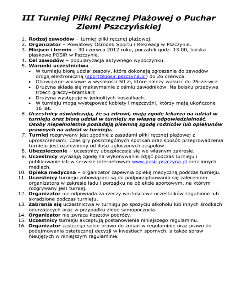 III Turniej Piłki Ręcznej Plażowej o Puchar Ziemi Pszczyńskiej 1. Rodzaj zawodów – turniej piłki ręcznej plażowej. 2. Organizator – Powiatowy Ośrodek Sportu i Rekreacji w Pszczynie. 3. Miejsce i termin – 30 czerwca 2012 roku, początek godz. 13.00, boiska piaskowe POSiR w Pszczynie. 4. Cel zawodów – popularyzacja aktywnego wypoczynku. 5. Warunki uczestnictwa W turnieju biorą udział zespoły, które dokonają zgłoszenia do zawodów drogą elektroniczną ([email protected]) do 26 czerwca Obowiązuje wpisowe w wysokości 50 zł, które należy wpłacić do 26czerwca Drużyna składa się maksymalnie z ośmiu zawodników. Na boisku przebywa trzech graczy+bramkarz Drużyna występuje w jednolitych koszulkach. W turnieju mogą występować kobiety i mężczyźni, którzy mają ukończone 16 lat. 6. Uczestnicy oświadczają, że są zdrowi, mają zgodę lekarza na udział w turnieju oraz biorą udział w turnieju na własną odpowiedzialność. Osoby niepełnoletnie posiadają pisemną zgodę rodziców lub opiekunów prawnych na udział w turnieju. 7. Turniej rozgrywany jest zgodnie z zasadami piłki ręcznej plażowej z uproszczeniami. Czas gry poszczególnych spotkań oraz sposób przeprowadzenia turnieju jest uzależniony od ilości zgłoszonych zespołów. 8. Ubezpieczenie – uczestnicy ubezpieczają się we własnym zakresie. 9. Uczestnicy wyrażają zgodę na wykonywanie zdjęć podczas turnieju i publikowanie ich w serwisie internetowym www.posir.pszczyna.pl oraz innych mediach. 10. Opieka medyczna – organizator zapewnia opiekę medyczną podczas turnieju. 11. Uczestnicy turnieju zobowiązani są do podporządkowania się zaleceniom organizatora w zakresie ładu i porządku na obiekcie sportowym, na którym rozgrywany jest turniej. 12. Organizator nie odpowiada za rzeczy wartościowe uczestników zagubione lub skradzione podczas turnieju. 13. Zabrania się uczestnictwa w turnieju po spożyciu alkoholu lub innych środkach odurzających oraz w przypadku złego samopoczucia. 14. Organizator nie zwraca kosztów podróży. 15. Uczestnicy turnieju akceptują postanowienia niniejszego regulaminu. 16. Organizator zastrzega sobie prawo do zmian w regulaminie oraz prawo do podejmowania ostatecznej decyzji w kwestiach spornych, a także spraw nieujętych w niniejszym regulaminie.