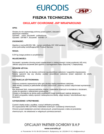 OKULARY OCHRONNE JSP WRAPAROUND OPIS: Okulary te nie zapewniają ochrony przed pyłami, cieczami i stopionym metalem. Oprawki: nylon, Soczewki: polikarbonat Oprawki: EN166 F, Soczewki: EN166 1.F ZGODNOŚĆ: Zgodne z normą BS EN 166, numer certyfikatu CE 1202 wydany przez jednostkę certyfikującą BSi Product Service. WAGA: 0,04 kg (waga podana w przybliżeniu) WŁAŚCIWOŚCI: Soczewki i oprawka chronią przed cząsteczkami o niskiej energii i dużej szybkości (45 m/s). Jakość optyczna soczewek jest zgodna z wymaganiami klasy optycznej 1 (najwyższej). SPOSÓB UŻYCIA: Należy upewnić się, że okulary ochronne są prawidłowo założone i wygodnie dopasowane. Należy upewnić się czy okulary zostały prawidłowo założone przed wejściem do strefy niebezpiecznej. INSTRUKCJA UŻYTKOWANIA: Ochrona zostanie zapewniona tylko gdy okulary będą prawidłowo założone. Jeśli okulary zostaną w jakikolwiek sposób zniszczone, powinny zostać natychmiast wymienione na nowe. Nie stosować farb, rozpuszczalników, klejów, materiałów ściernych w kontakcie z okularami, chyba że zgodnie z zaleceniami producenta. Okulary w kontakcie ze skórą osób wrażliwych mogą wywoływać reakcje alergiczne. W takim przypadku należy opuścić niebezpieczna strefę, zdjąć okulary i skonsultować się z lekarzem. CZYSZCZENIE I UTRZYMANIE: Czyścić ciepłą woda z mydłem, suszyć delikatną szmatką. Do czyszczenia NIE UŻYWAĆ materiałów ściernych i substancji chemicznych. Chronić przed działaniem promieni słonecznych, przechowywać z dala od produktów chemicznych, nie składować w wilgotnych pomieszczeniach.