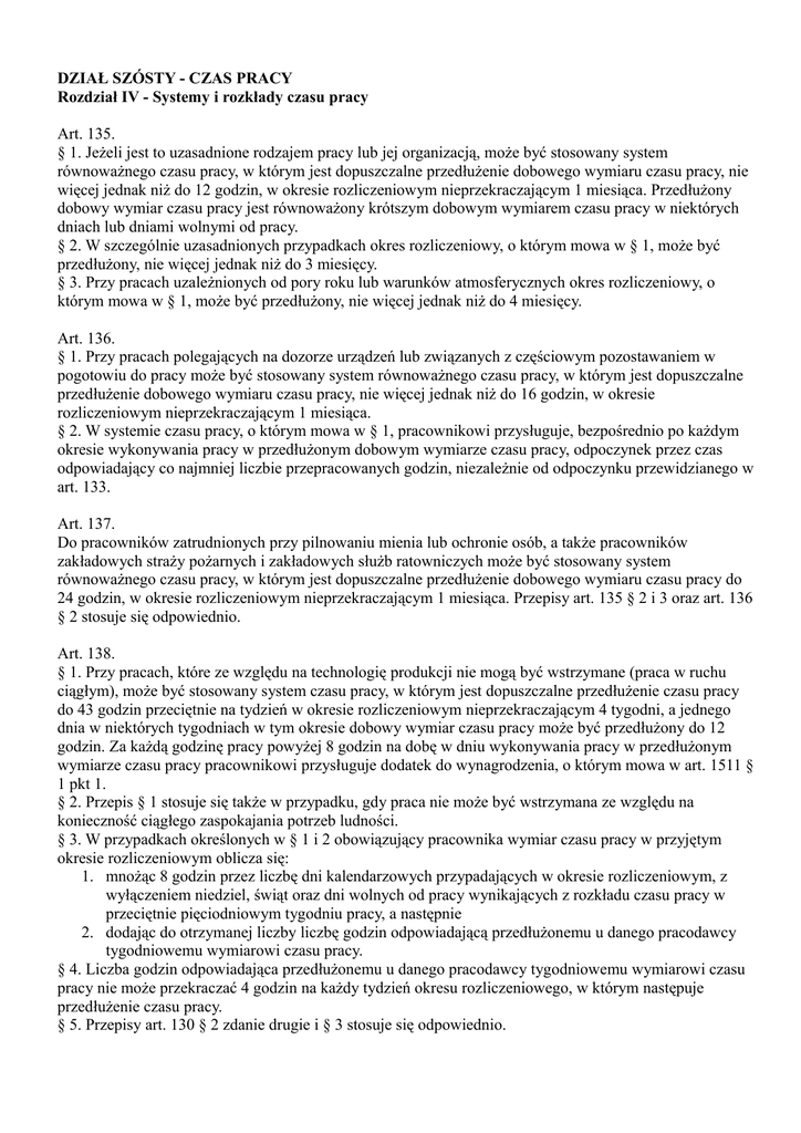 DZIAŁ SZÓSTY - CZAS PRACY Rozdział IV - Systemy i rozkłady czasu pracy Art. 135. § 1. Jeżeli jest to uzasadnione rodzajem pracy lub jej organizacją, może być stosowany system równoważnego czasu pracy, w którym jest dopuszczalne przedłużenie dobowego wymiaru czasu pracy, nie więcej jednak niż do 12 godzin, w okresie rozliczeniowym nieprzekraczającym 1 miesiąca. Przedłużony dobowy wymiar czasu pracy jest równoważony krótszym dobowym wymiarem czasu pracy w niektórych dniach lub dniami wolnymi od pracy. § 2. W szczególnie uzasadnionych przypadkach okres rozliczeniowy, o którym mowa w § 1, może być przedłużony, nie więcej jednak niż do 3 miesięcy. § 3. Przy pracach uzależnionych od pory roku lub warunków atmosferycznych okres rozliczeniowy, o którym mowa w § 1, może być przedłużony, nie więcej jednak niż do 4 miesięcy. Art. 136. § 1. Przy pracach polegających na dozorze urządzeń lub związanych z częściowym pozostawaniem w pogotowiu do pracy może być stosowany system równoważnego czasu pracy, w którym jest dopuszczalne przedłużenie dobowego wymiaru czasu pracy, nie więcej jednak niż do 16 godzin, w okresie rozliczeniowym nieprzekraczającym 1 miesiąca. § 2. W systemie czasu pracy, o którym mowa w § 1, pracownikowi przysługuje, bezpośrednio po każdym okresie wykonywania pracy w przedłużonym dobowym wymiarze czasu pracy, odpoczynek przez czas odpowiadający co najmniej liczbie przepracowanych godzin, niezależnie od odpoczynku przewidzianego w art. 133. Art. 137. Do pracowników zatrudnionych przy pilnowaniu mienia lub ochronie osób, a także pracowników zakładowych straży pożarnych i zakładowych służb ratowniczych może być stosowany system równoważnego czasu pracy, w którym jest dopuszczalne przedłużenie dobowego wymiaru czasu pracy do 24 godzin, w okresie rozliczeniowym nieprzekraczającym 1 miesiąca. Przepisy art. 135 § 2 i 3 oraz art. 136 § 2 stosuje się odpowiednio. Art. 138. § 1. Przy pracach, które ze względu na technologię produkcji nie mogą być wstrzymane (praca w ruchu ciągłym), może być stosowany system czasu pracy, w którym jest dopuszczalne przedłużenie czasu pracy do 43 godzin przeciętnie na tydzień w okresie rozliczeniowym nieprzekraczającym 4 tygodni, a jednego dnia w niektórych tygodniach w tym okresie dobowy wymiar czasu pracy może być przedłużony do 12 godzin. Za każdą godzinę pracy powyżej 8 godzin na dobę w dniu wykonywania pracy w przedłużonym wymiarze czasu pracy pracownikowi przysługuje dodatek do wynagrodzenia, o którym mowa w art. 1511 § 1 pkt 1. § 2. Przepis § 1 stosuje się także w przypadku, gdy praca nie może być wstrzymana ze względu na konieczność ciągłego zaspokajania potrzeb ludności. § 3. W przypadkach określonych w § 1 i 2 obowiązujący pracownika wymiar czasu pracy w przyjętym okresie rozliczeniowym oblicza się: 1. mnożąc 8 godzin przez liczbę dni kalendarzowych przypadających w okresie rozliczeniowym, z wyłączeniem niedziel, świąt oraz dni wolnych od pracy wynikających z rozkładu czasu pracy w przeciętnie pięciodniowym tygodniu pracy, a następnie 2. dodając do otrzymanej liczby liczbę godzin odpowiadającą przedłużonemu u danego pracodawcy tygodniowemu wymiarowi czasu pracy. § 4. Liczba godzin odpowiadająca przedłużonemu u danego pracodawcy tygodniowemu wymiarowi czasu pracy nie może przekraczać 4 godzin na każdy tydzień okresu rozliczeniowego, w którym następuje przedłużenie czasu pracy. § 5. Przepisy art. 130 § 2 zdanie drugie i § 3 stosuje się odpowiednio. Art. 139. § 1. Jeżeli jest to uzasadnione rodzajem pracy lub jej organizacją, może być stosowany system przerywanego czasu pracy według z góry ustalonego rozkładu przewidującego nie więcej niż jedną przerwę w pracy w ciągu doby, trwającą nie dłużej niż 5 godzin. Przerwy nie wlicza się do czasu pracy, jednakże za czas tej przerwy pracownikowi przysługuje prawo do wynagrodzenia w wysokości połowy wynagrodzenia należnego za czas przestoju. § 2. Systemu przerywanego czasu pracy nie stosuje się do pracownika objętego systemem czasu pracy, o którym mowa w art. 135-138, 143 i 144. § 3. System przerywanego czasu pracy wprowadza się w układzie zbiorowym pracy, z zastrzeżeniem § 4. § 4. U pracodawcy będącego osobą fizyczną, prowadzącego działalność w zakresie rolnictwa i hodowli, u którego nie działa zakładowa organizacja związkowa, system przerywanego czasu pracy może być stosowany na podstawie umowy o prace. Pracownikowi przysługuje wynagrodzenie za czas przerwy, o której mowa w § 1, jeżeli wynika to z umowy o prace. Art. 140. W przypadkach uzasadnionych rodzajem pracy lub jej organizacją albo miejscem wykonywania pracy może być stosowany system zadaniowego czasu pracy. Pracodawca, po porozumieniu z pracownikiem, ustala czas niezbędny do wykonania powierzonych zadań, uwzględniając wymiar czasu pracy wynikający z norm określonych w art. 129. Art. 141. § 1. Pracodawca może wprowadzić jedną przerwę w pracy niewliczaną do czasu pracy, w wymiarze nieprzekraczającym 60 minut, przeznaczoną na spożycie posiłku lub załatwienie spraw osobistych. § 2. Przerwę w pracy, o której mowa w § 1, wprowadza się w układzie zbiorowym pracy lub regulaminie pracy albo w umowie o prace, jeżeli pracodawca nie jest objęty układem zbiorowym pracy lub nie jest obowiązany do ustalenia regulaminu pracy. Art. 142. Na pisemny wniosek pracownika pracodawca może ustalić indywidualny rozkład jego czasu pracy w ramach systemu czasu pracy, którym pracownik jest objęty. Art. 143. Na pisemny wniosek pracownika może być do niego stosowany system skróconego tygodnia pracy. W tym systemie jest dopuszczalne wykonywanie pracy przez pracownika przez mniej niż 5 dni w ciągu tygodnia, przy równoczesnym przedłużeniu dobowego wymiaru czasu pracy, nie więcej niż do 12 godzin, w okresie rozliczen
